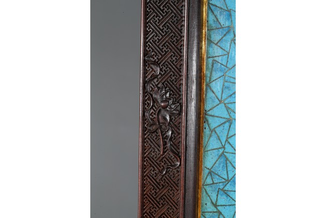 Of rectangular form, the panel finely decorated with three magpies perching on plum blossom branches, to the right a magpie flying away. The upper side inscribed with imperial poem in running script dated to Qianlong reign, with three impressed marks, all reserved on turquoise ground and mounted on zitan frame further carved in relief with auspicious motif reserve on key-fret ground. Qing Dynasty period.