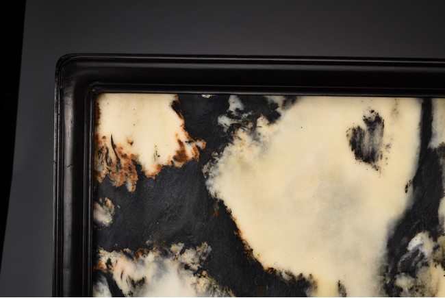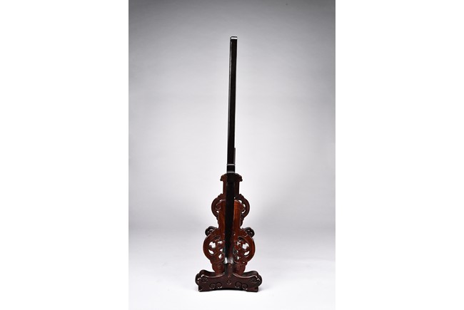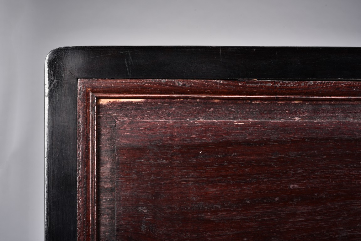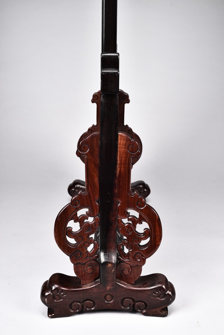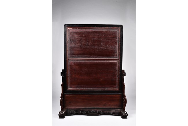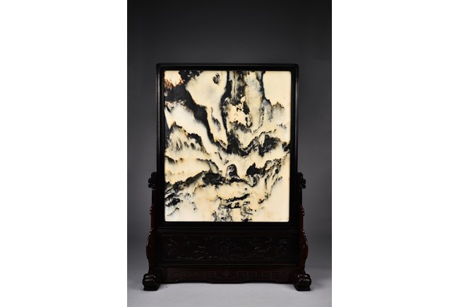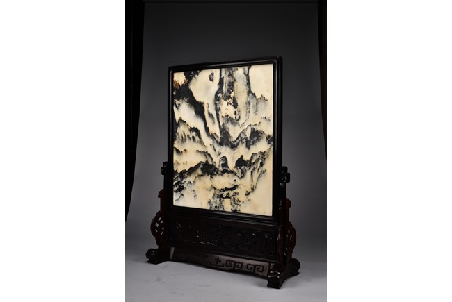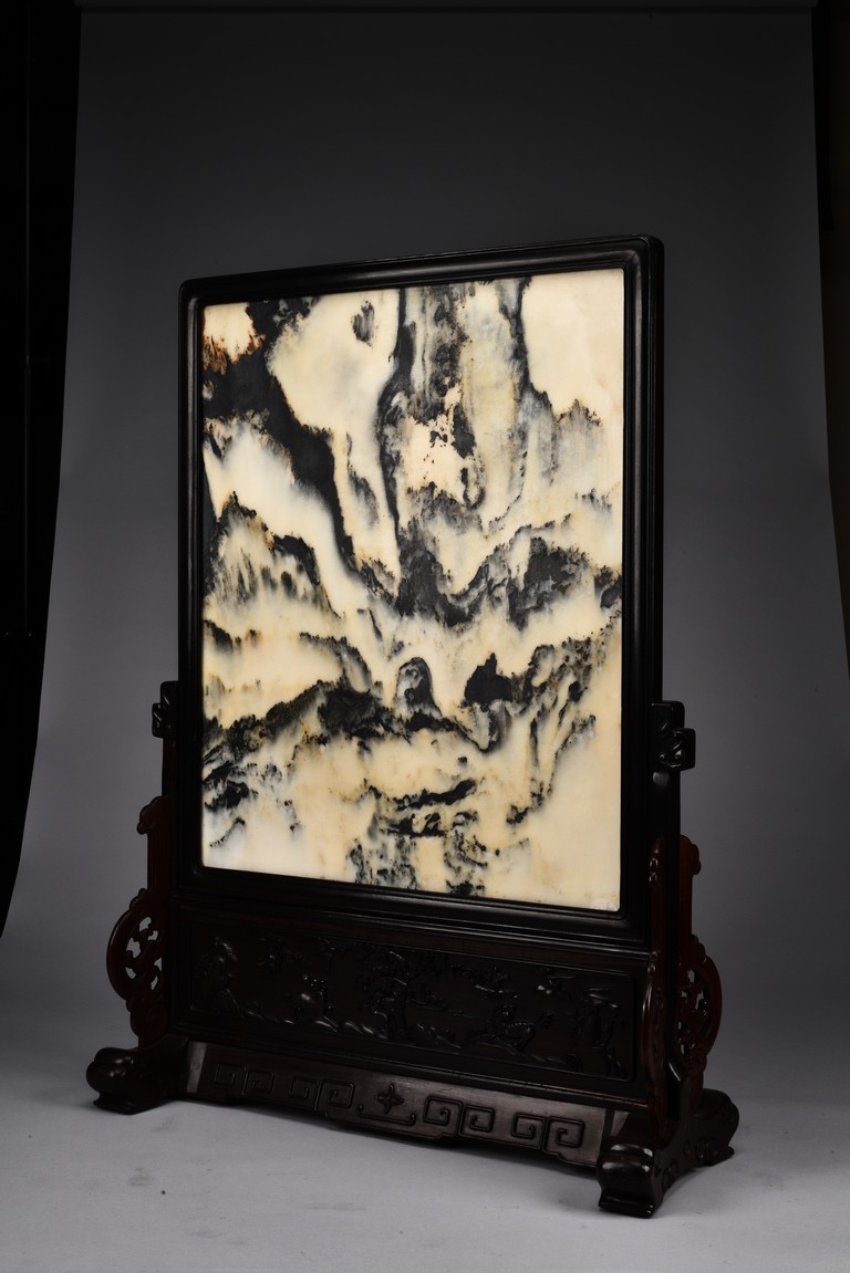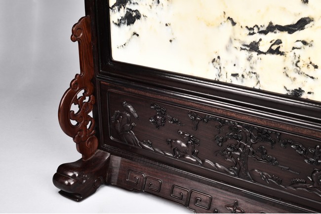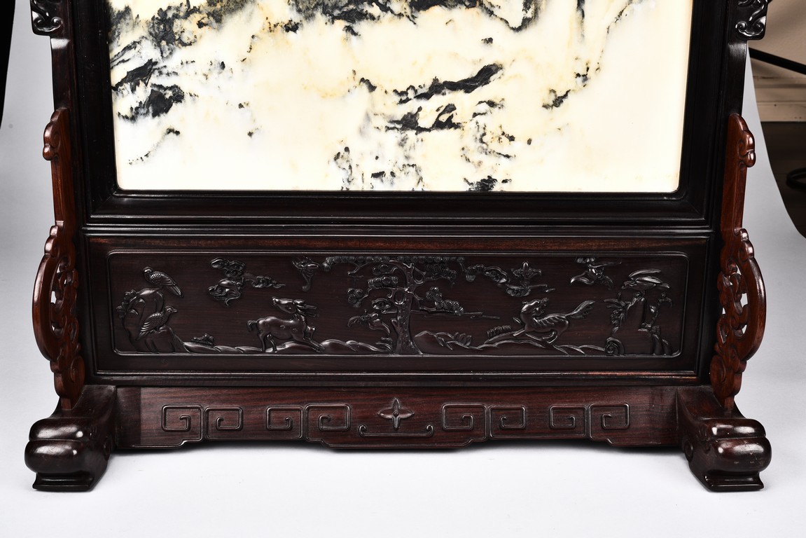 Of rectangular shaped, the marble stone is set within the rosewood frame, the stone panel is of attractive black, brown, and yellowish white inclusions, suggestive stylized natural mountain landscape. The apron is carved with a continuous landscape of deer and birds in a mountain landscape above key-fret decorations. Qing Dynasty period.