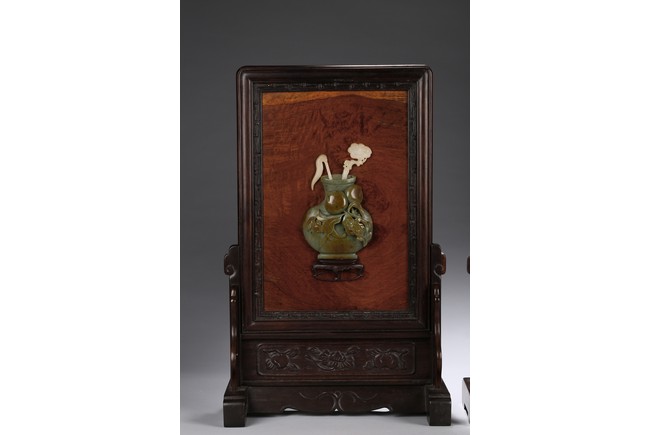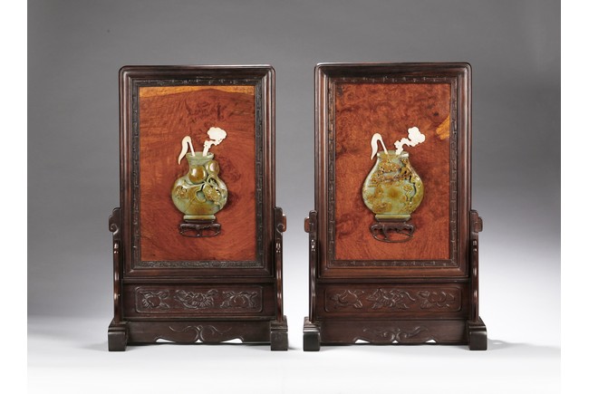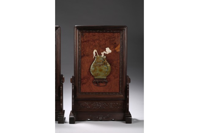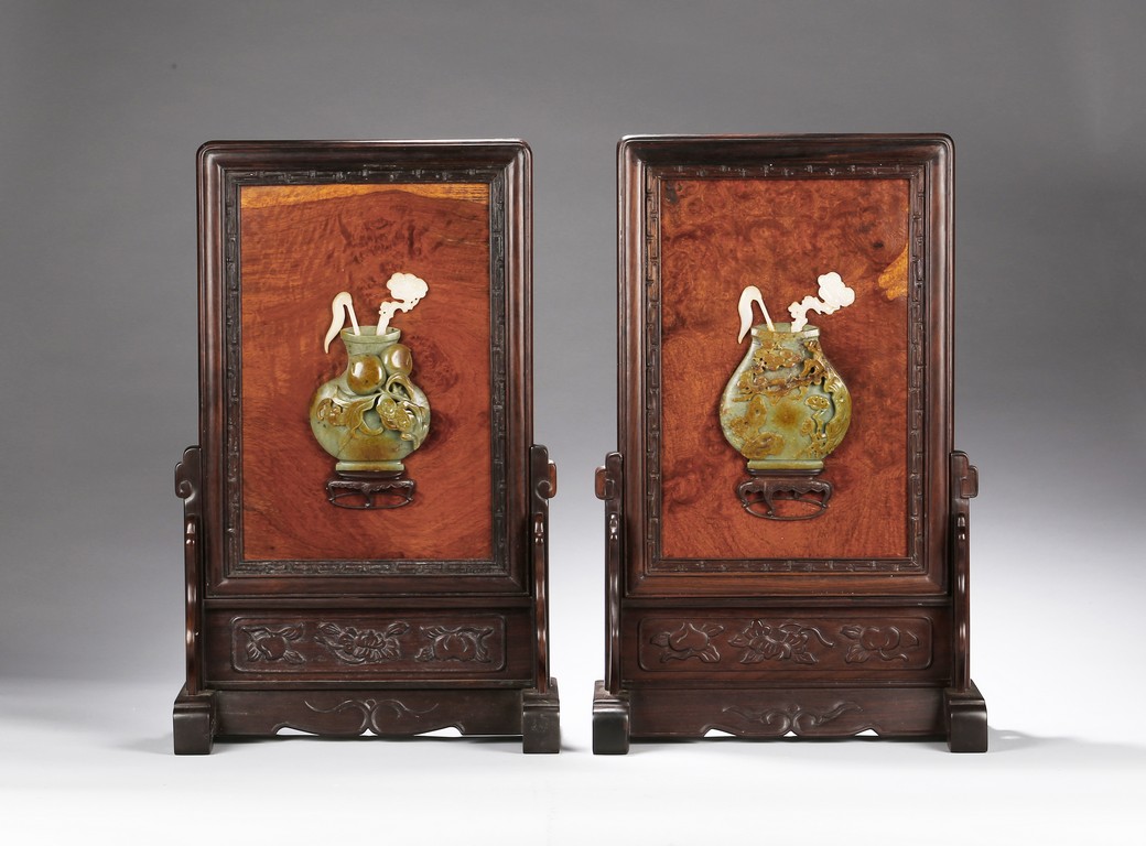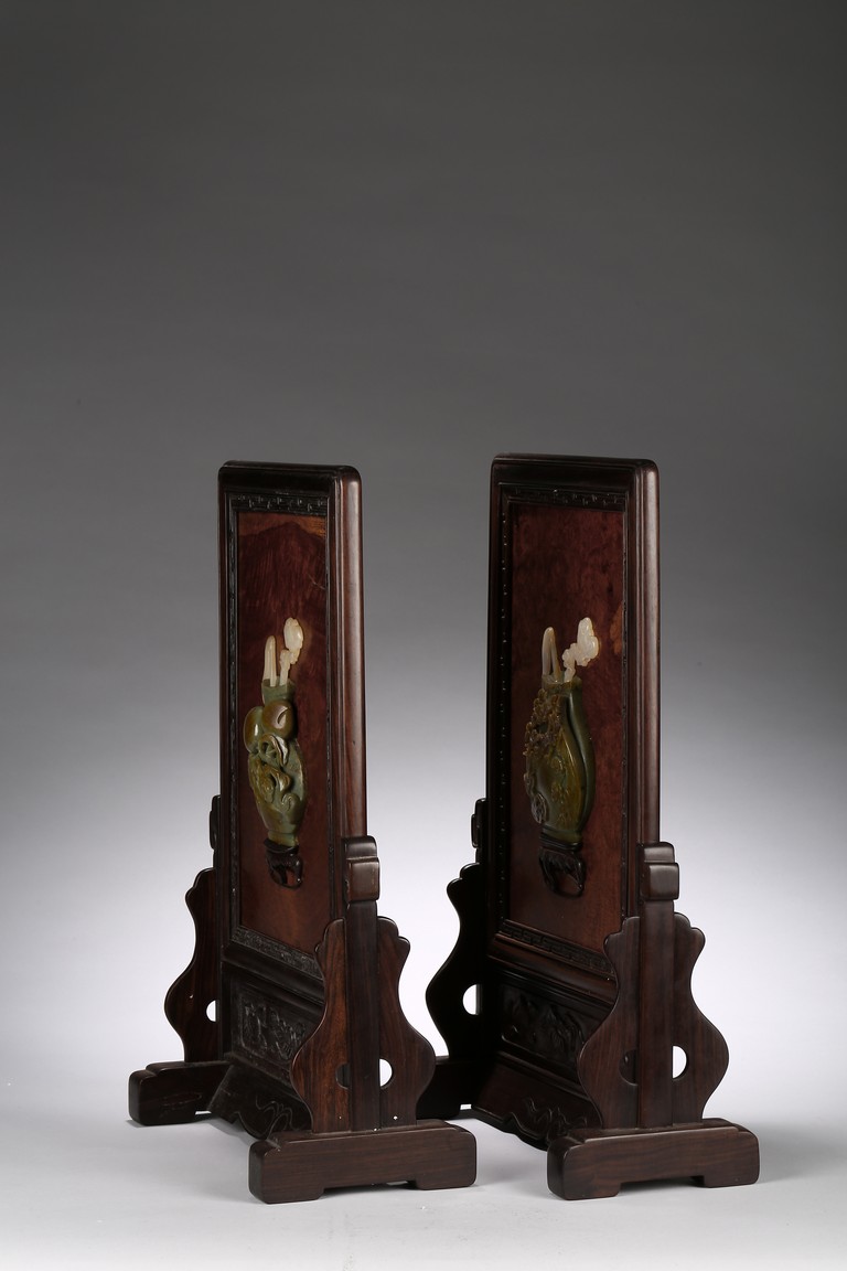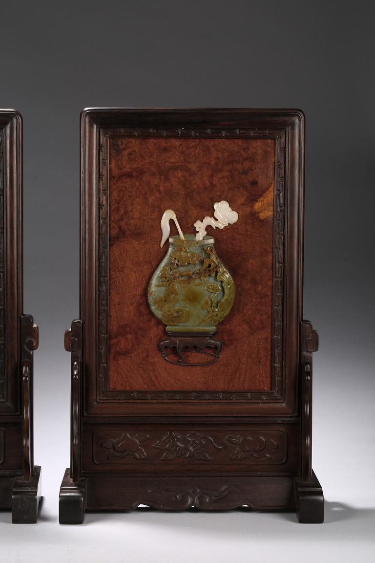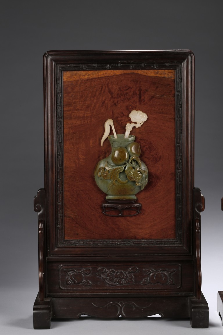 Each burl table screen embellished with a green jade carving of vase which further carved in relief with pine tree branch and lingzhi heads to the vase body, containing a ruyi-scepter and brush, set on a rosewood stand. Qing Dynasty period.