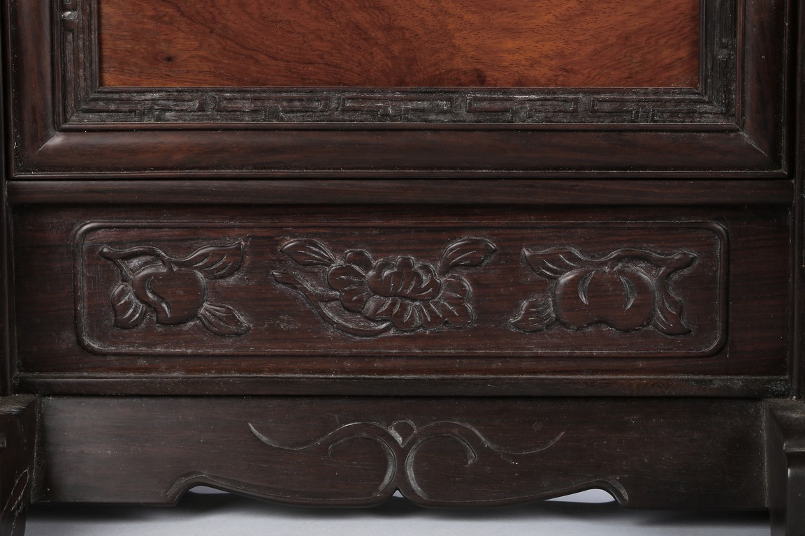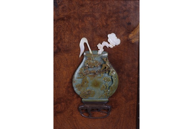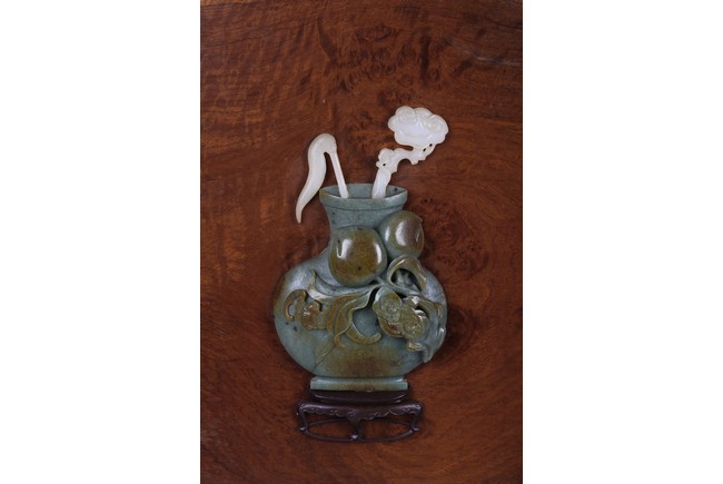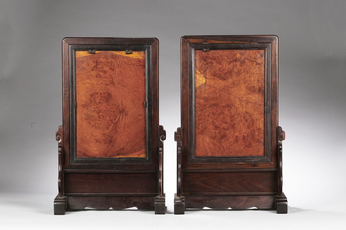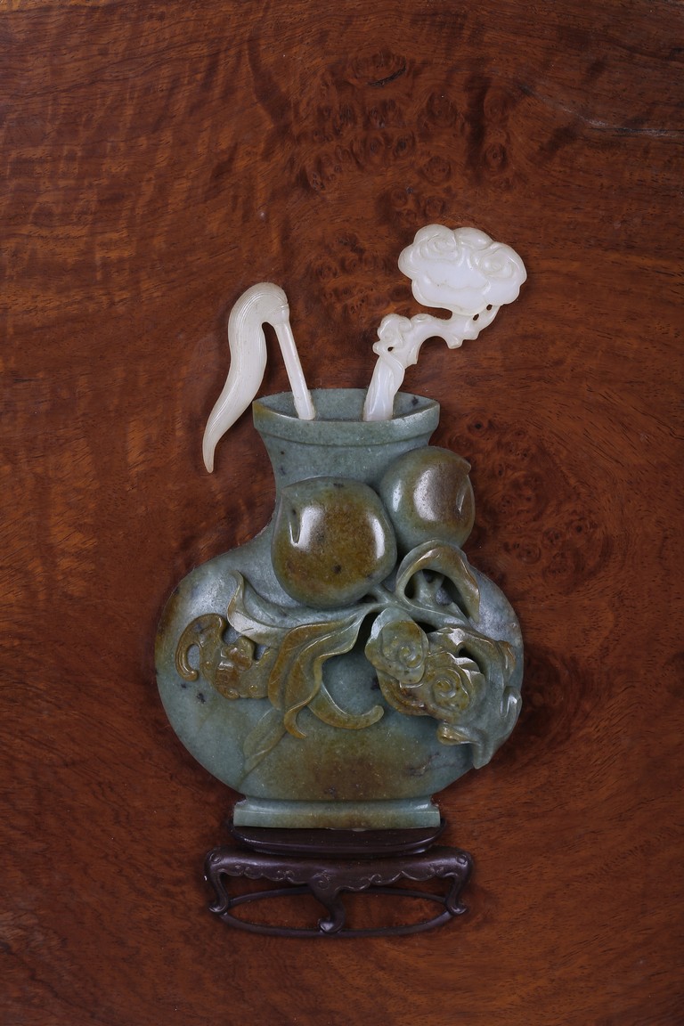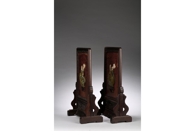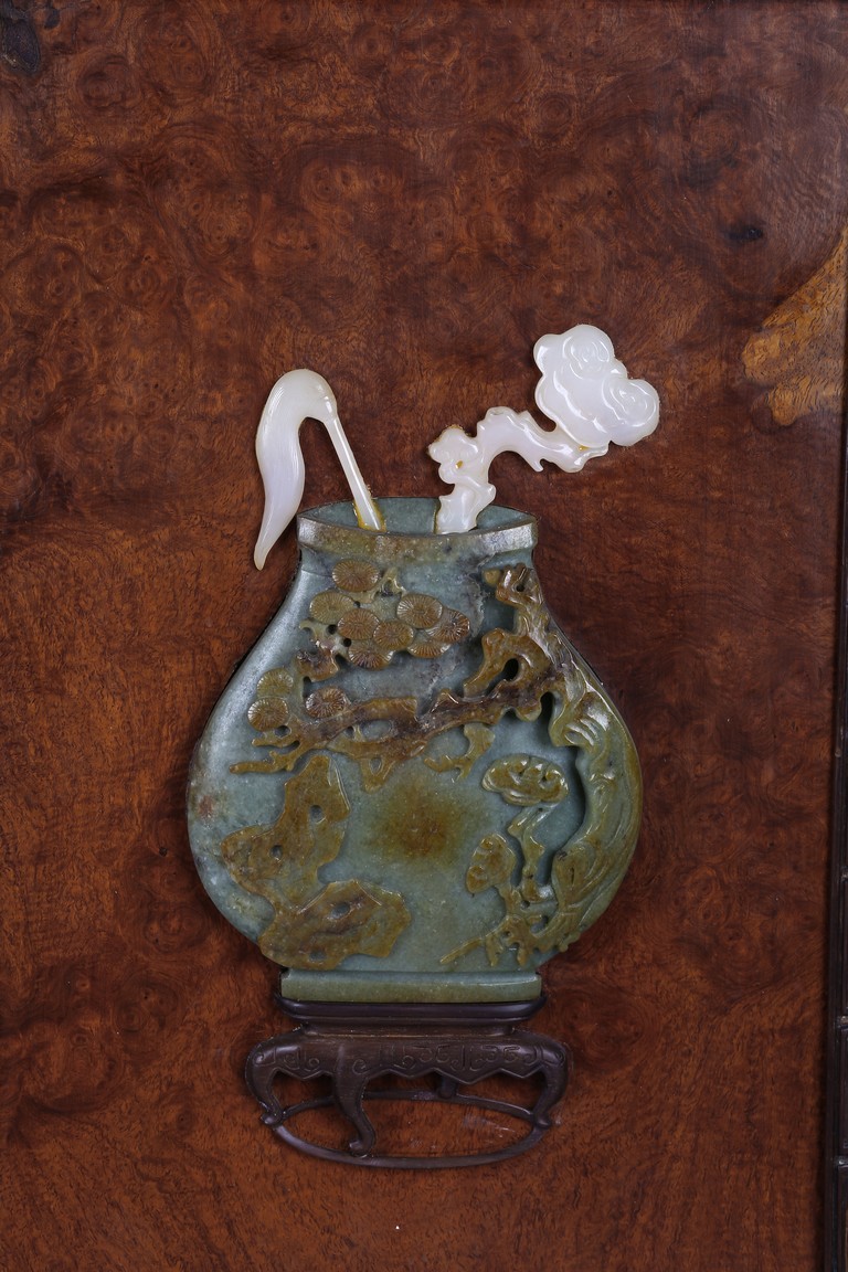Each burl table screen embellished with a green jade carving of vase which further carved in relief with pine tree branch and lingzhi heads to the vase body, containing a ruyi-scepter and brush, set on a rosewood stand. Qing Dynasty period.