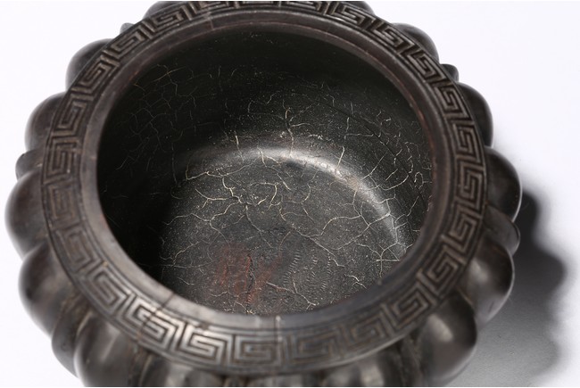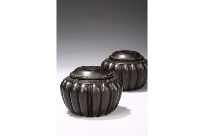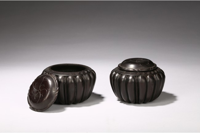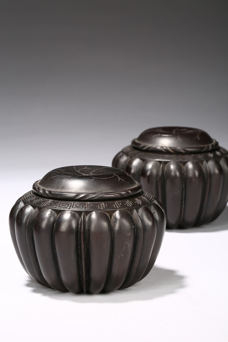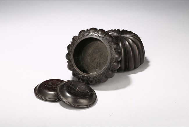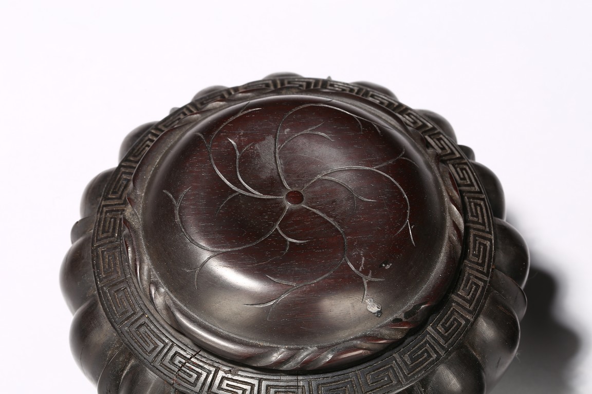 Modelled in the form of melon, the rim is incised with key-fret borders, fitted with a circular cover decorated with floral pattern. The wood is of deep dark brownish tone. Republic Period