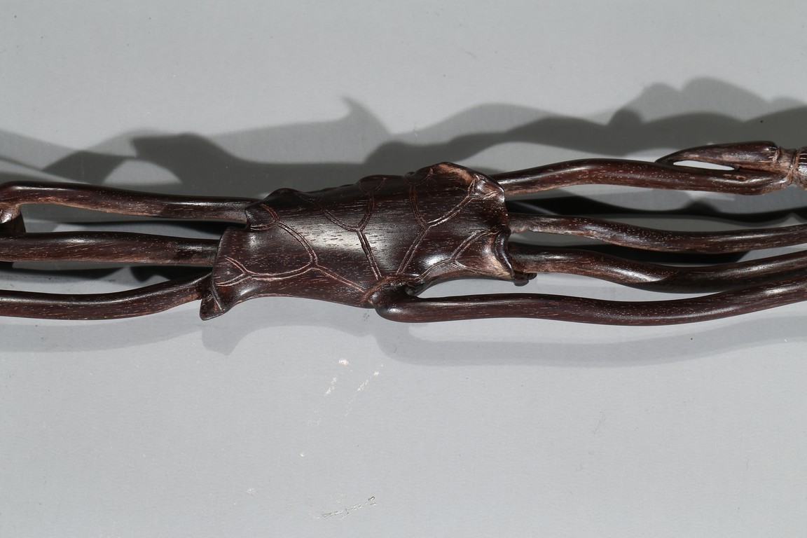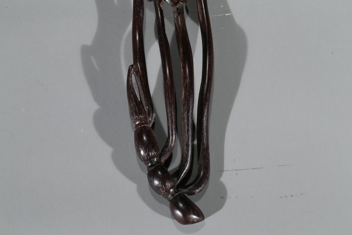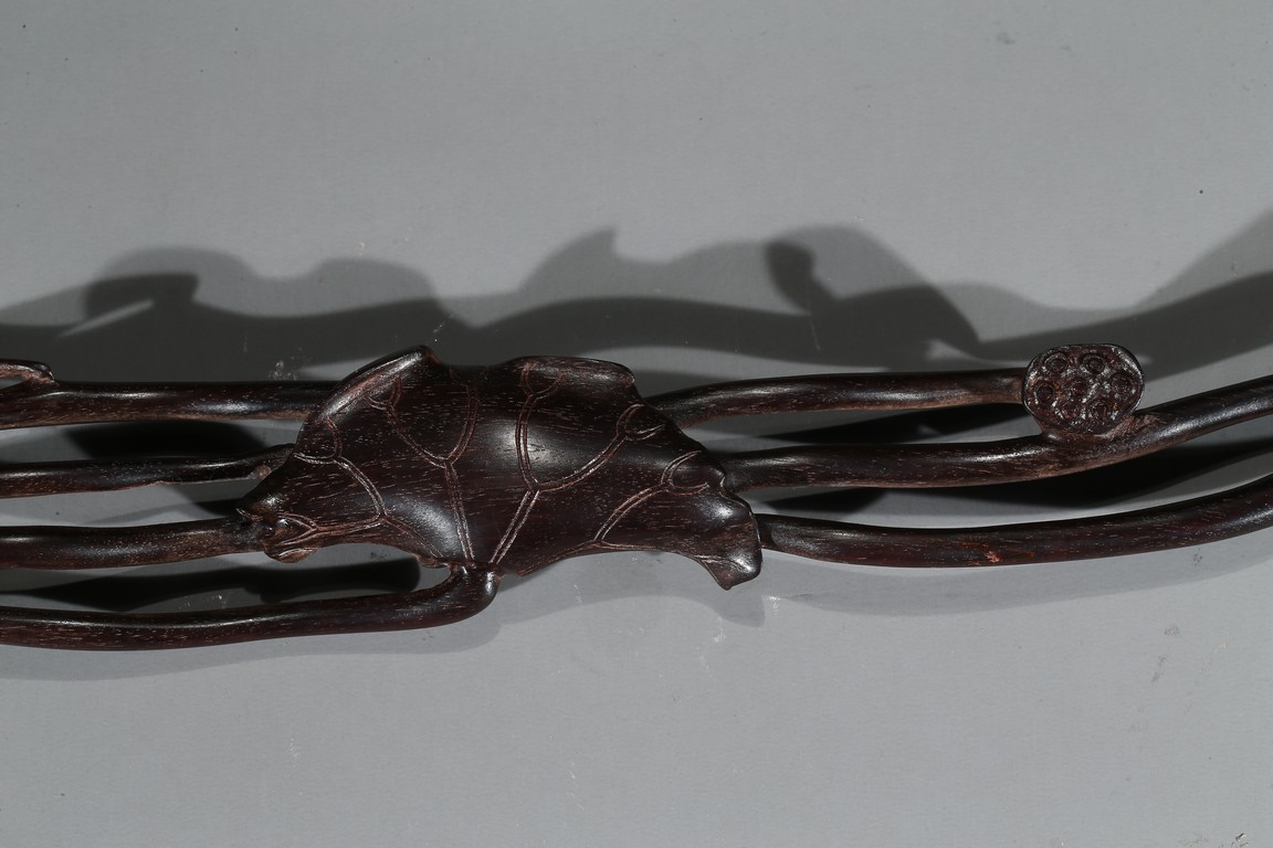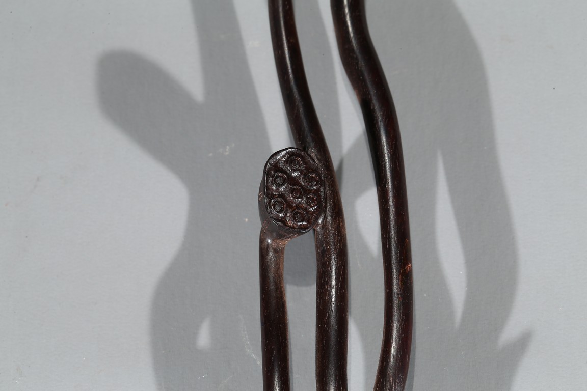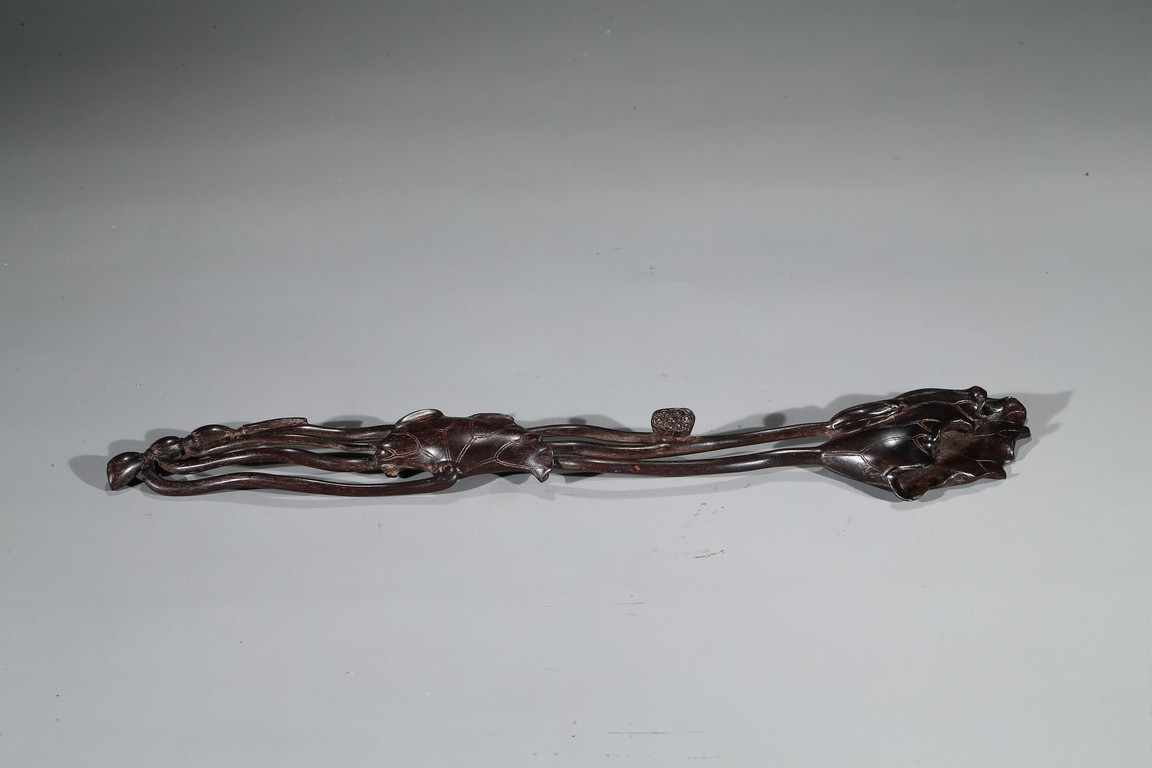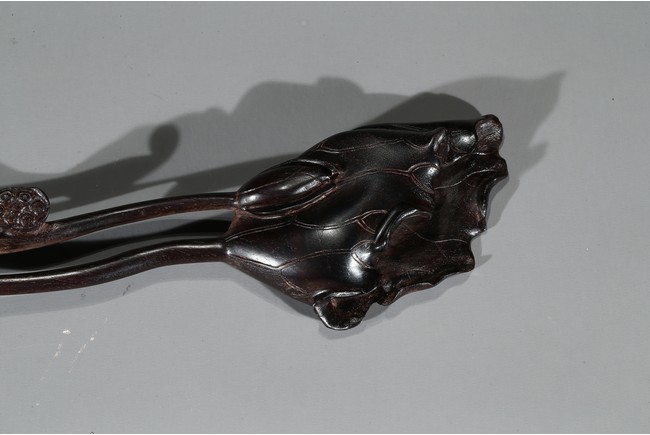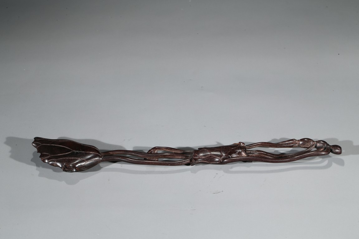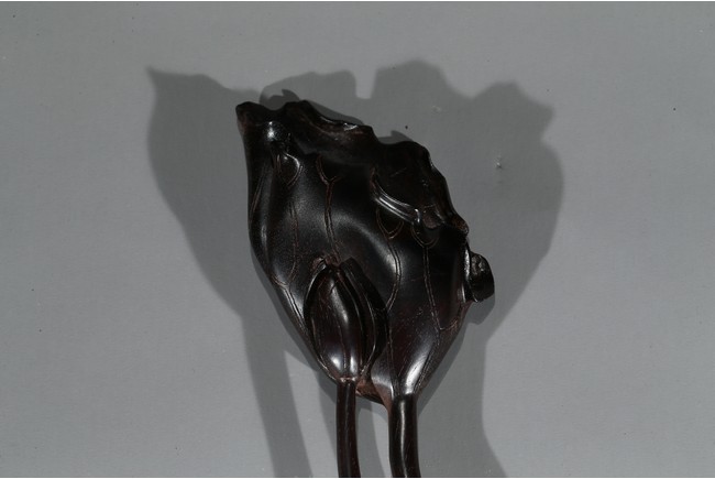 Carved in the form of large slender lotus stems and buds rising to form the handle, the head modelled as the lotus leaf. The wood is of attractive dark brown tone. Qing Dynasty period.