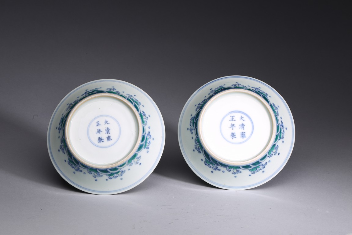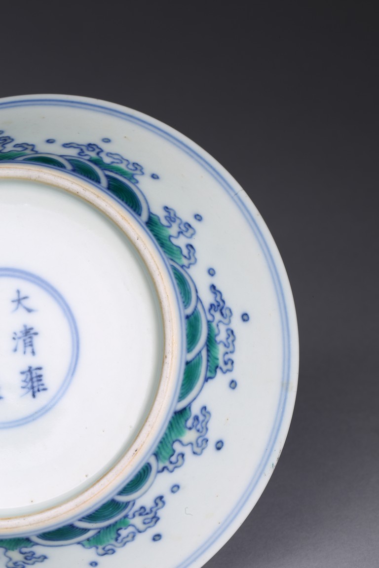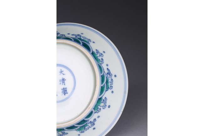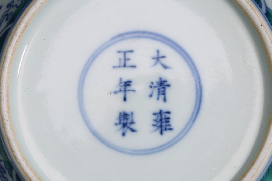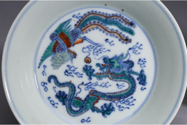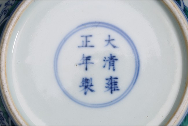 On the interior bottom, painted a dragon and a phoenix flying in the cloud. On the exterior side, painted water ripple band embracing the down edge. Impressed six Chinese characters on the exterior bottom means 'Made in Yongzheng period, Qing Dynasty'. Yongzheng period, Qing Dynasty