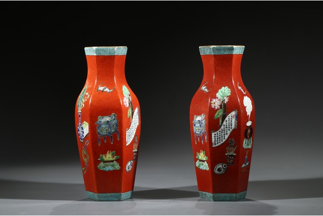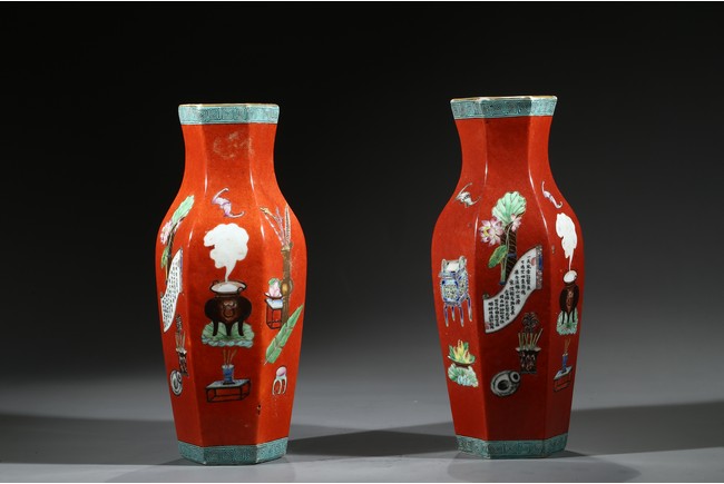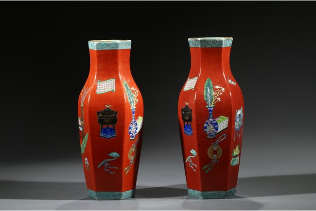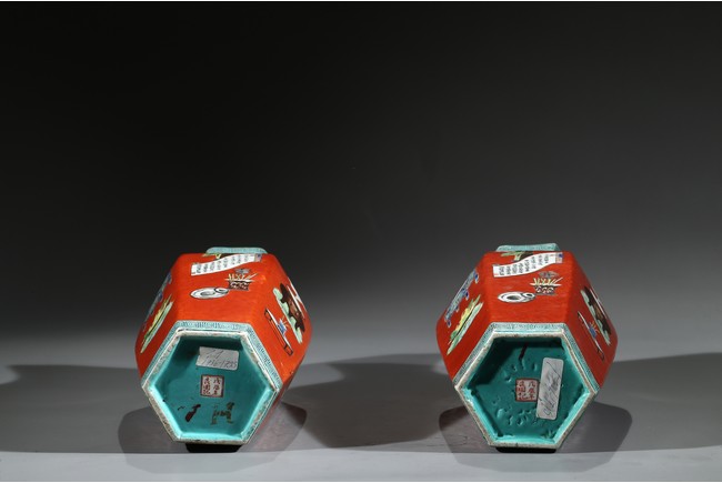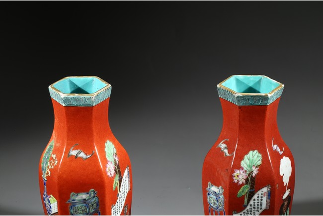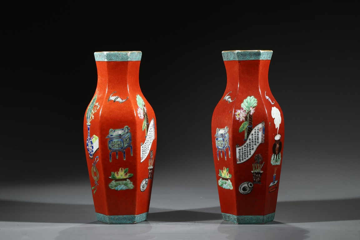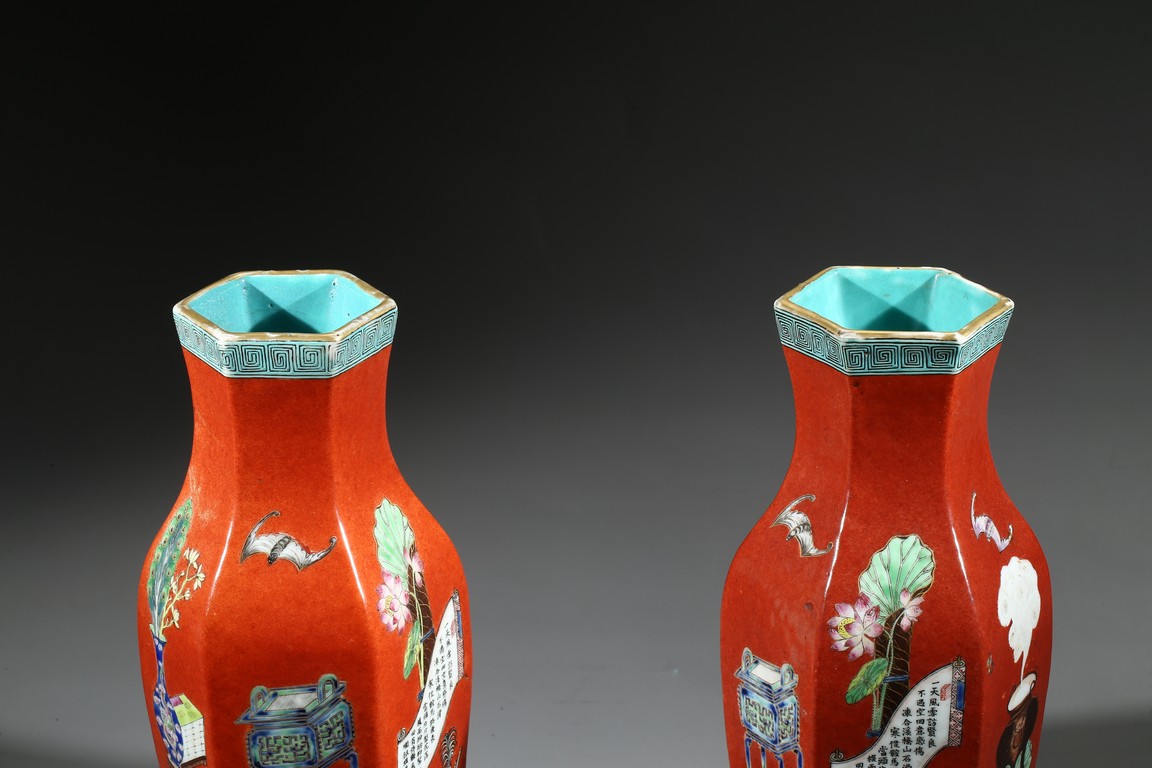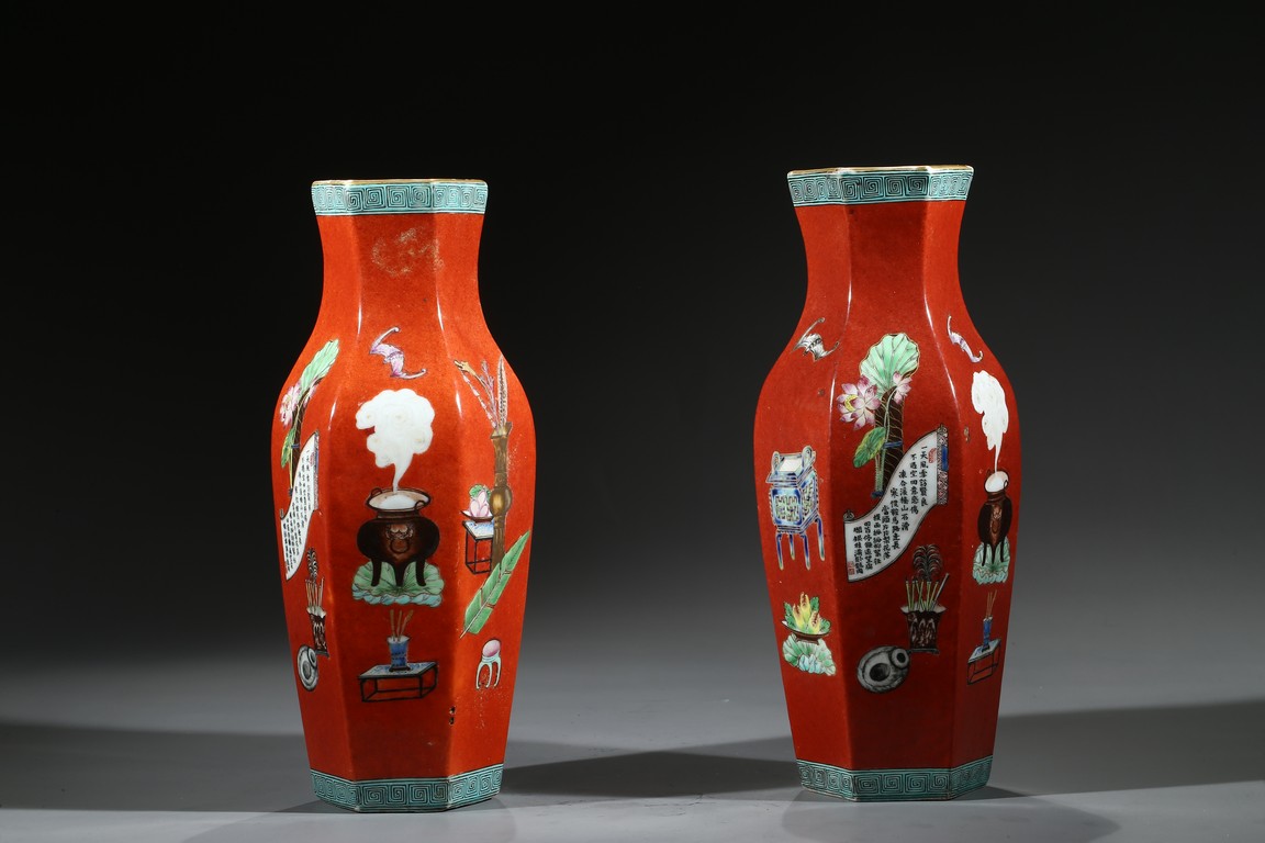 Each of hexagonal section, the body enamelled to depict antiques, or bogu pattern, including coins, books, vases, archaic bronze vessel, and poem, all reserved on coral red ground, the base painted with a six character mark. Qing Dynasty period.
