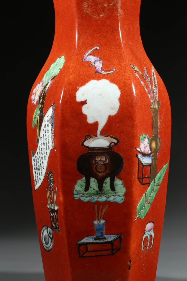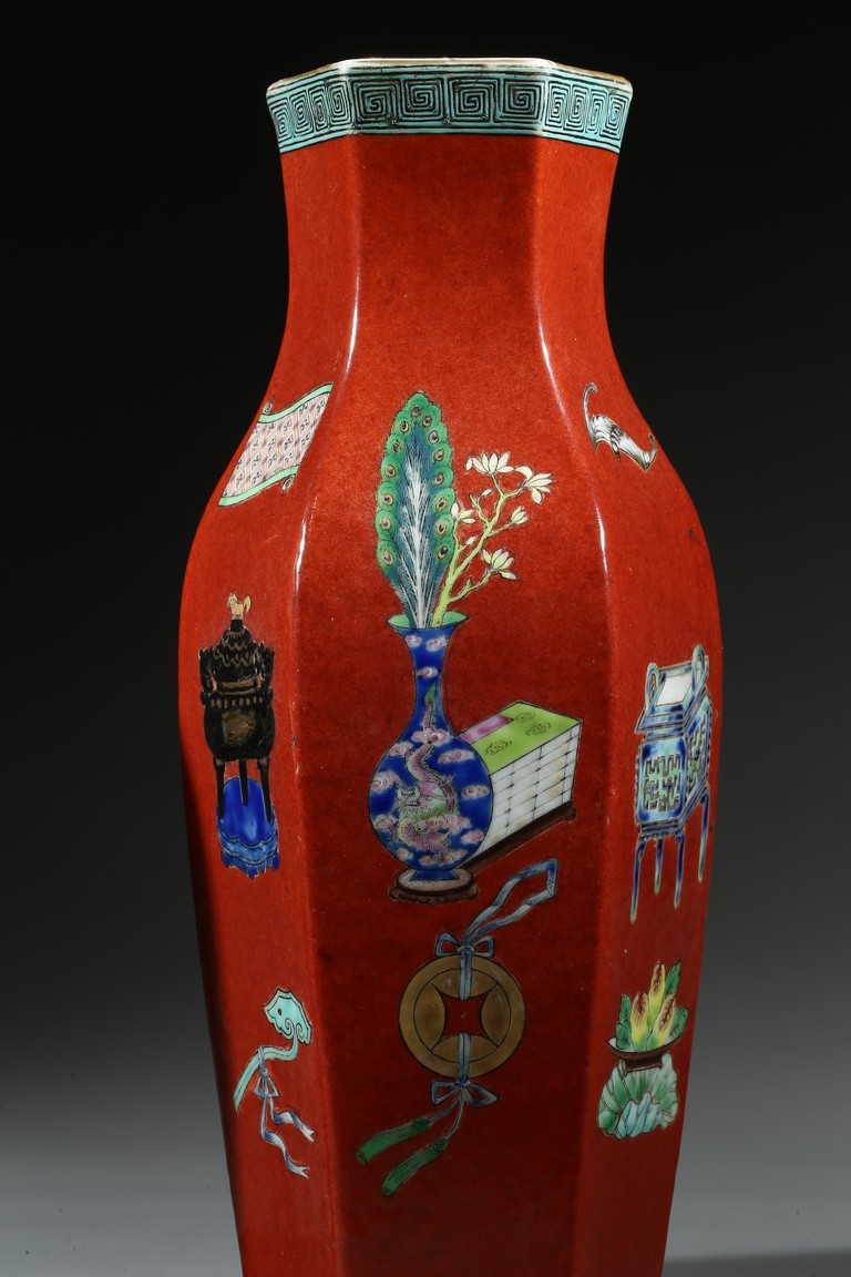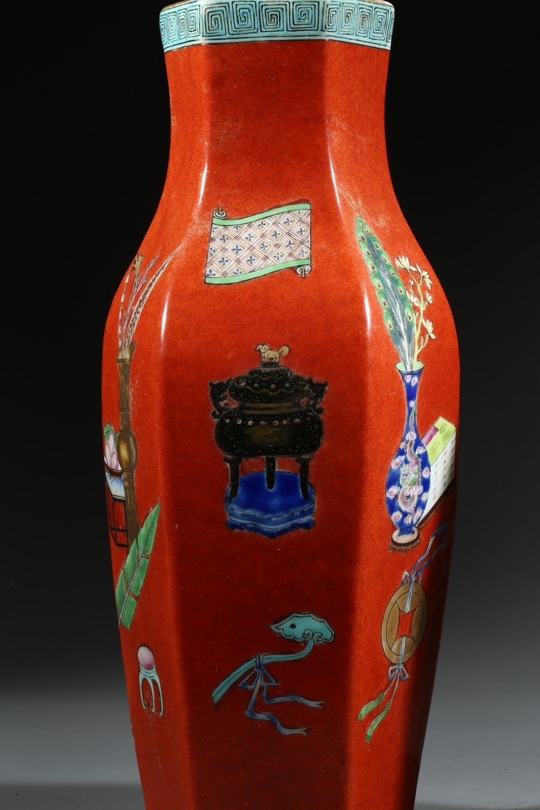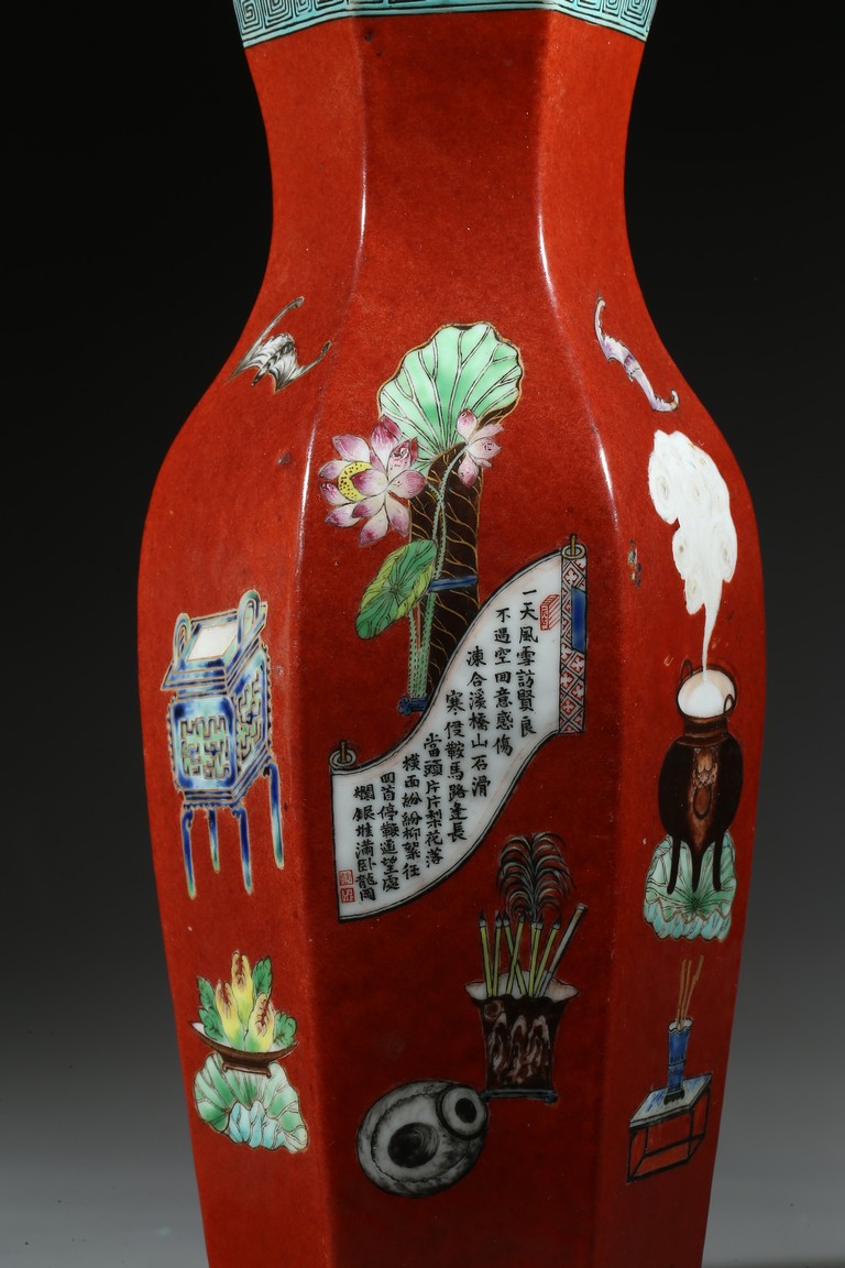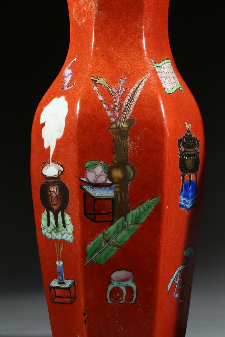 Each of hexagonal section, the body enamelled to depict antiques, or bogu pattern, including coins, books, vases, archaic bronze vessel, and poem, all reserved on coral red ground, the base painted with a six character mark. Qing Dynasty period.