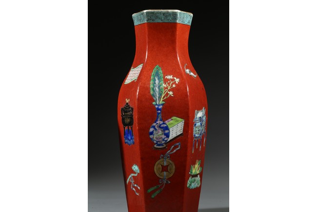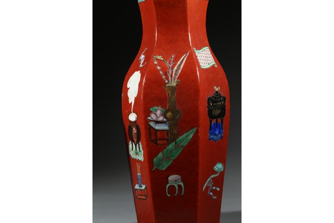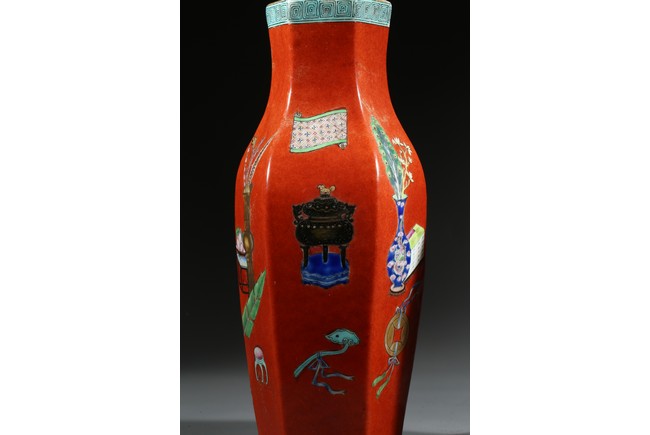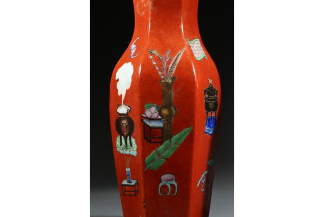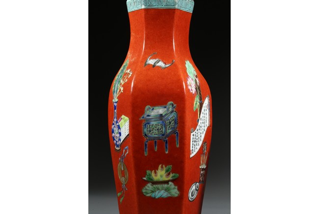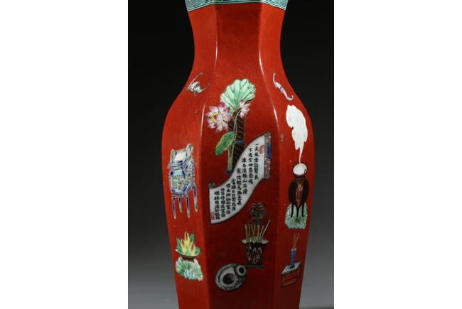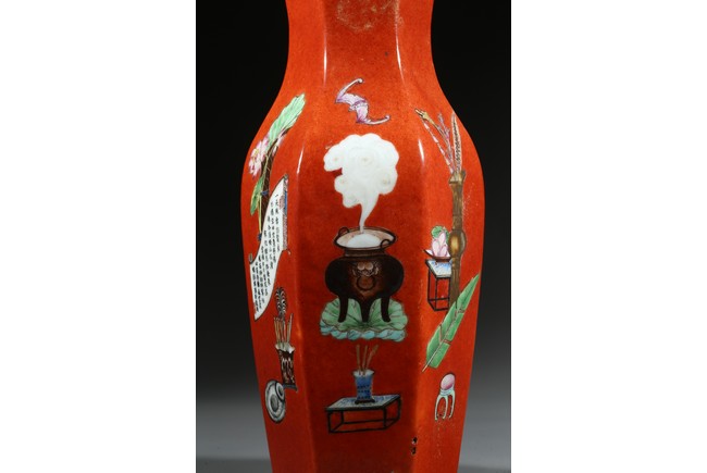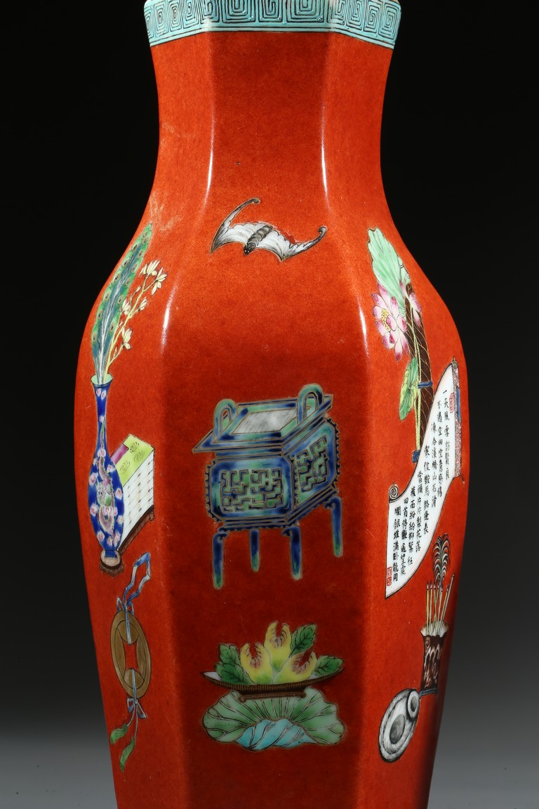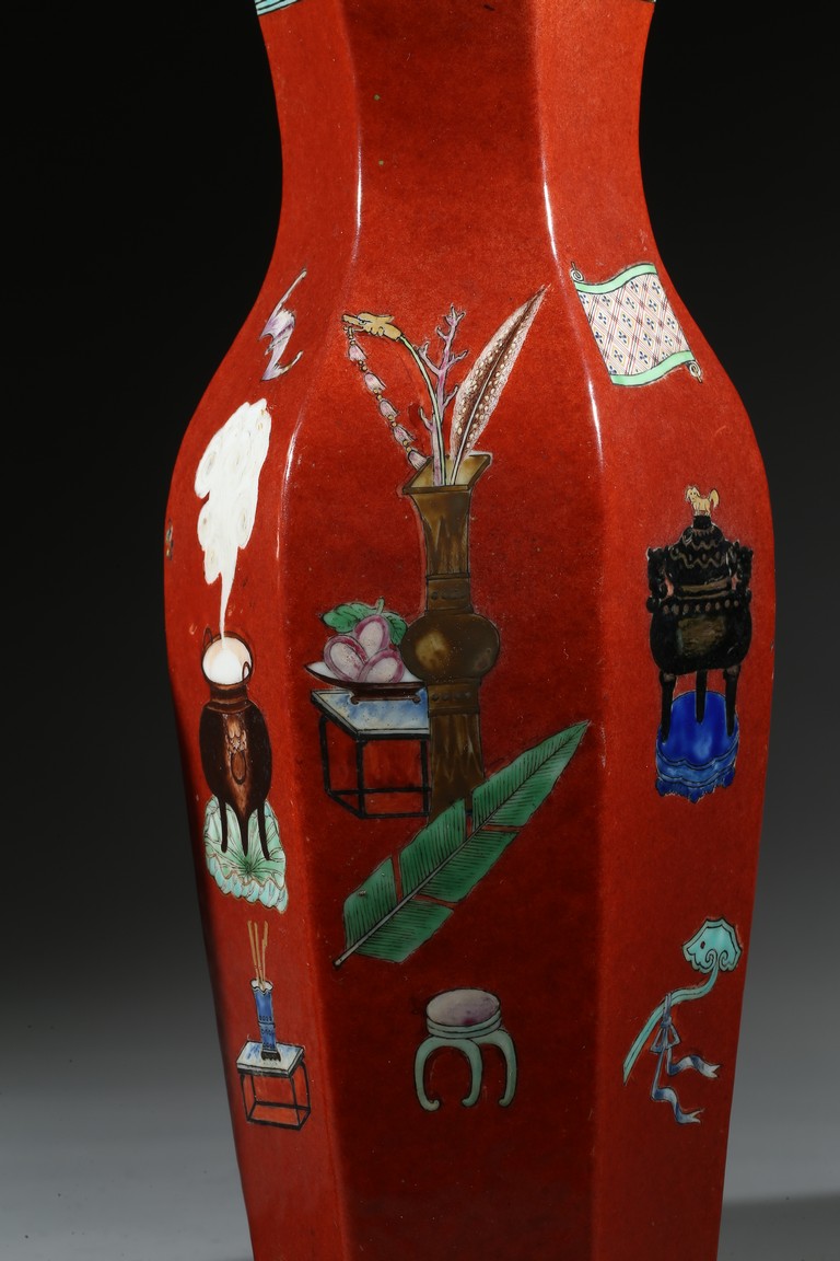 Each of hexagonal section, the body enamelled to depict antiques, or bogu pattern, including coins, books, vases, archaic bronze vessel, and poem, all reserved on coral red ground, the base painted with a six character mark. Qing Dynasty period.