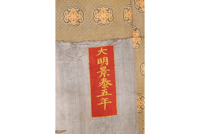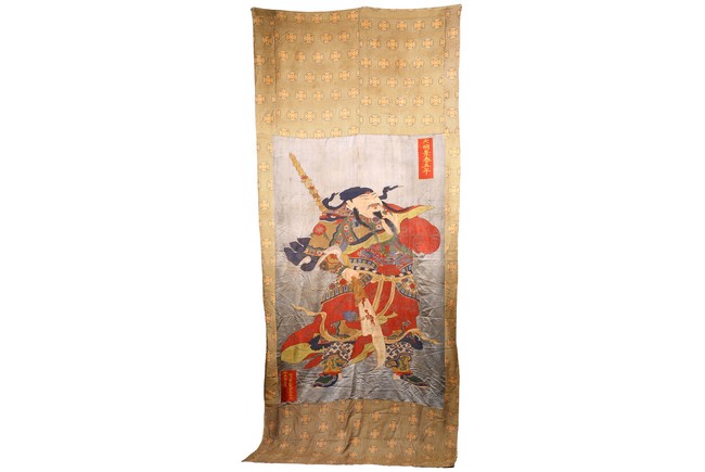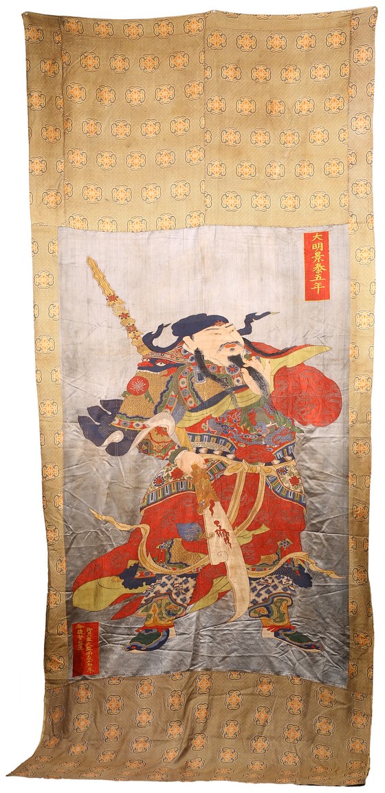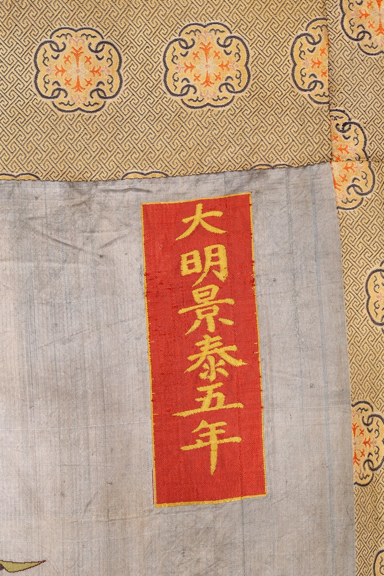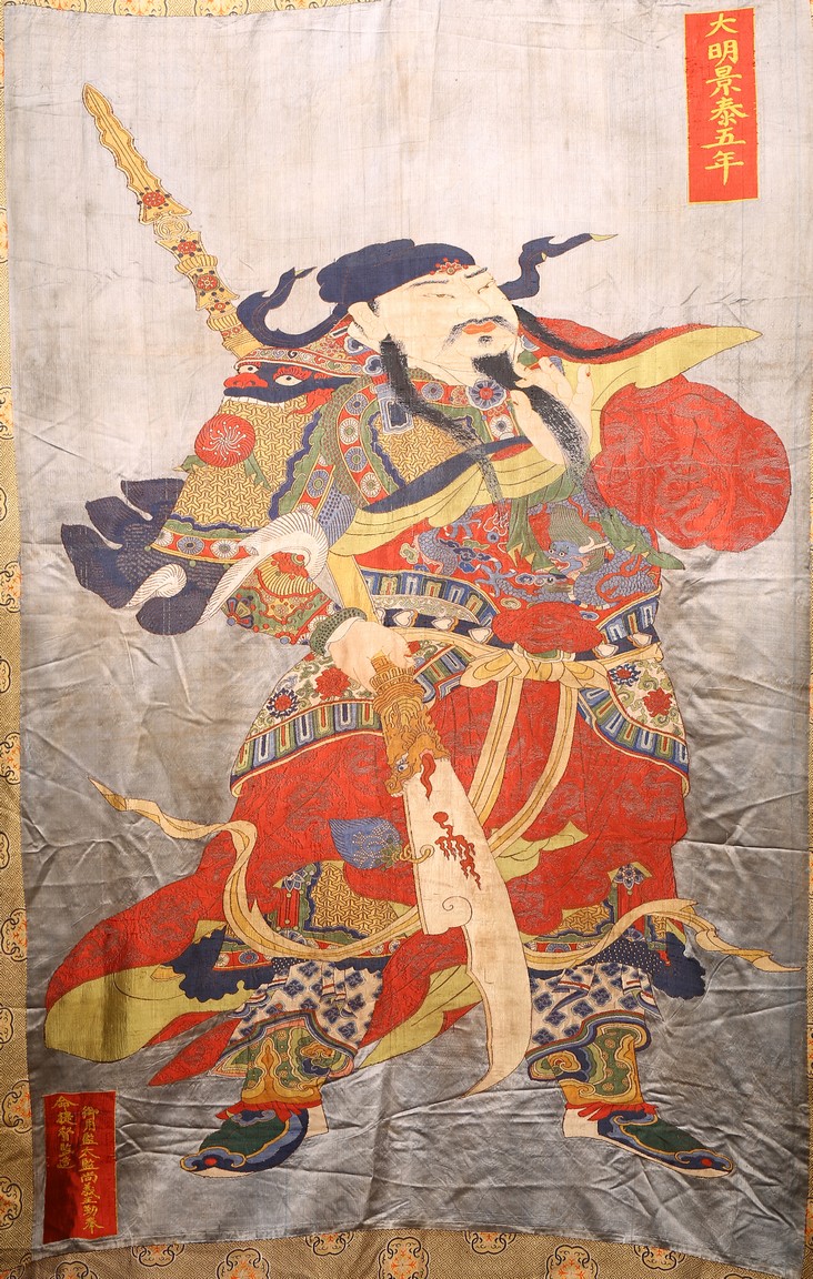 This Kesi hanging carpet depicts a man wearing a ornate robe, holding a long knife on right hand, the left hand stroking his goatee, standing on the silver background. On the upper right corner, there are six Chinese characters means 'Made in the 5th year of Jingtai, Ming Dynasty. And on the down left corner, the artist signed.