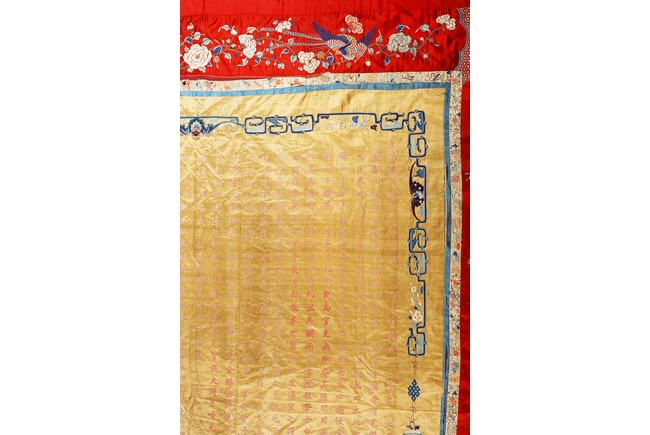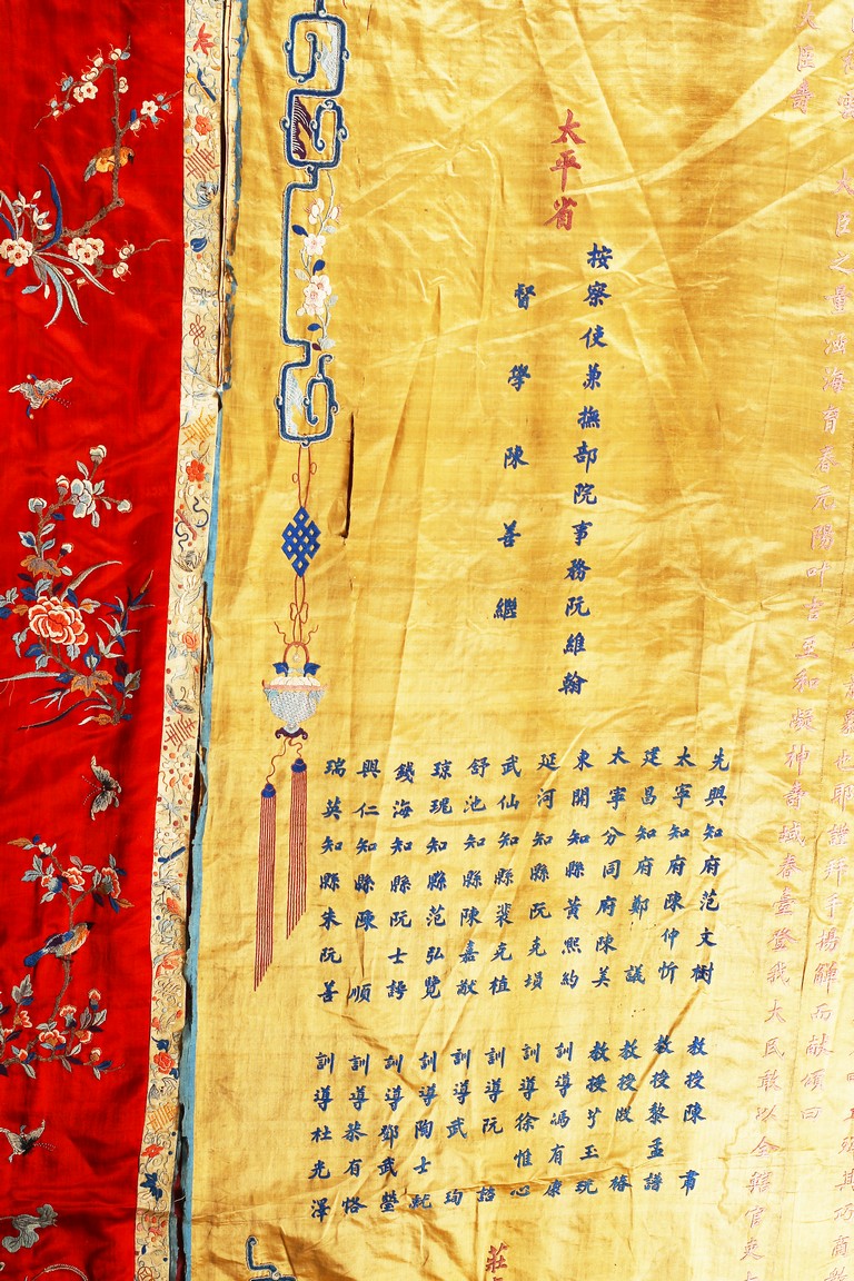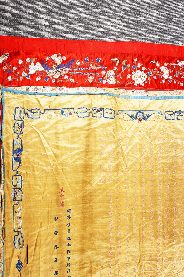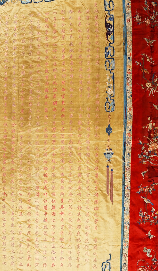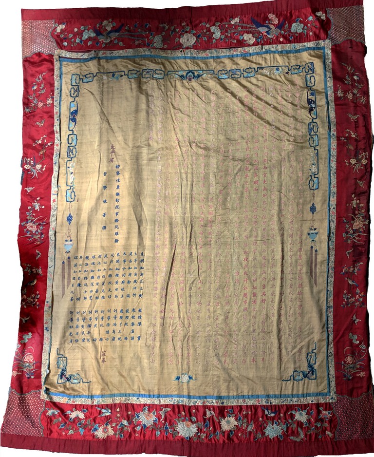 此拍品:為十九世紀初,(越南大南帝國阮朝時期)以越南太平省按察使阮維翰以及督學陳善繼等大臣向當時的朝中大臣賀表。太平省位於越南紅河三角洲,于海陽省,興安省,河南省,南定省接壤,東臨北部灣。整體書法均用漢字在絲綢上綉制而成。綉品寬幅巨大,綉品難度實屬罕見。