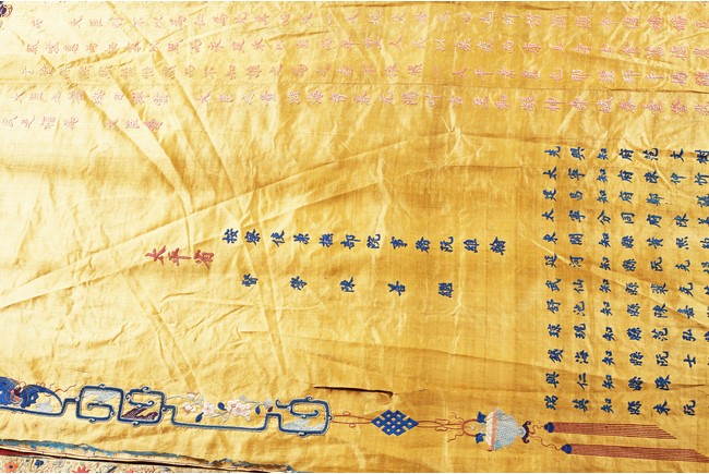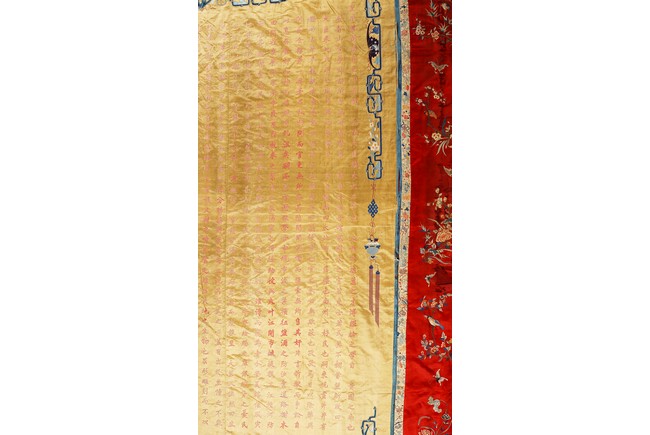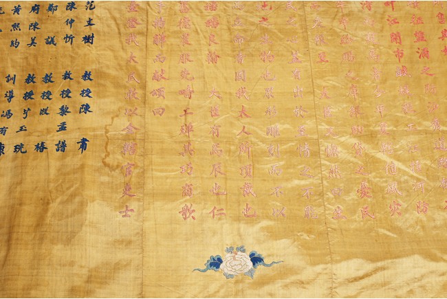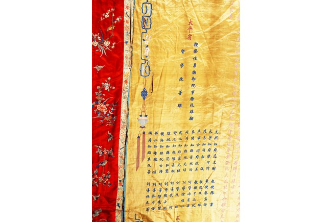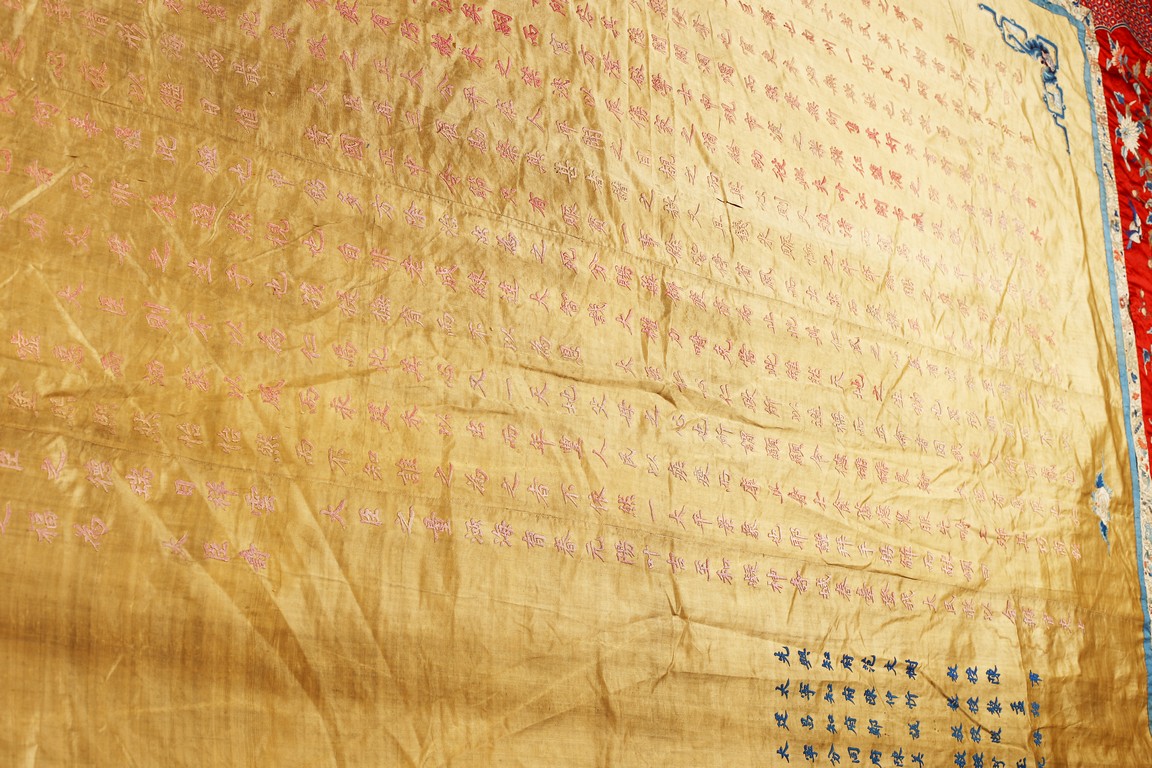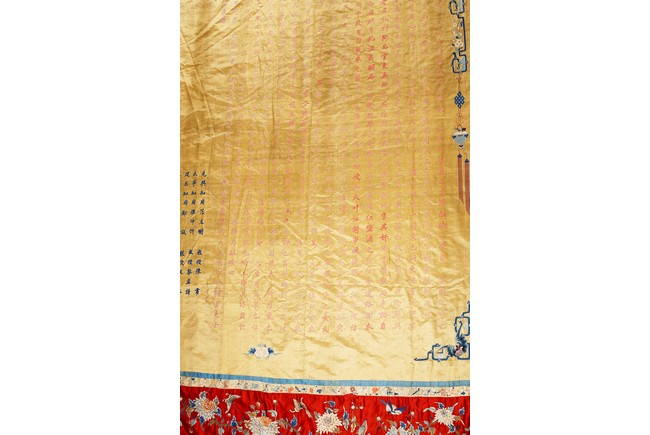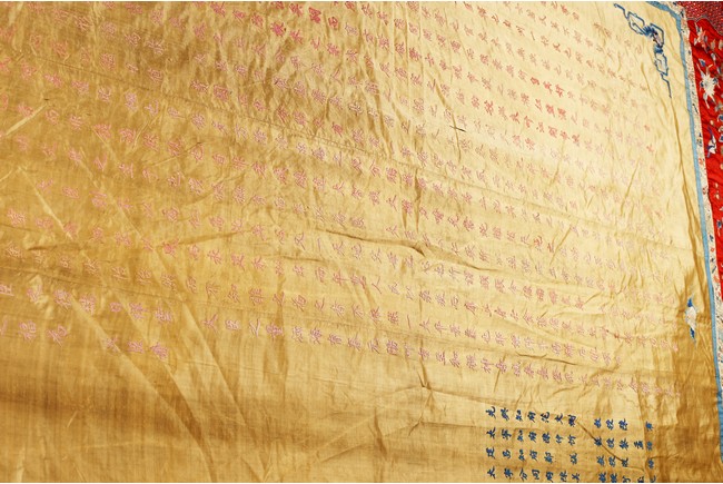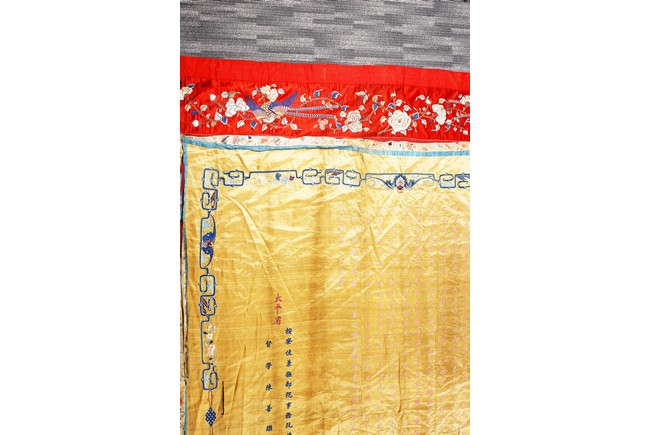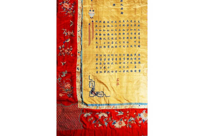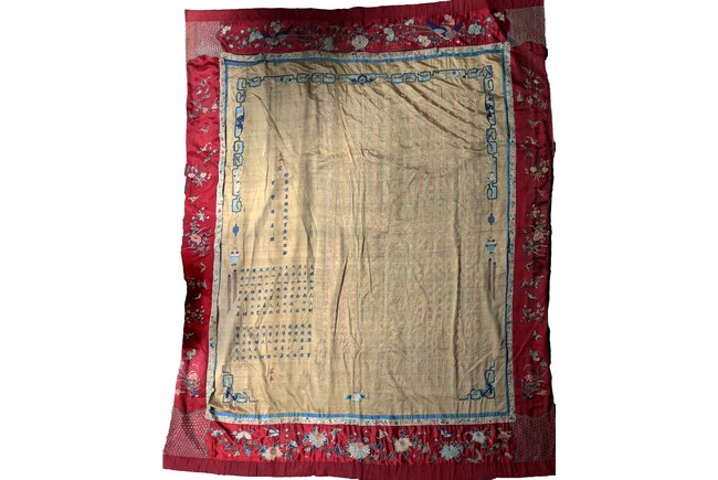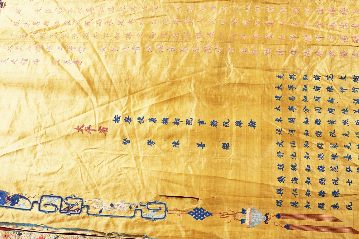 此拍品:為十九世紀初,(越南大南帝國阮朝時期)以越南太平省按察使阮維翰以及督學陳善繼等大臣向當時的朝中大臣賀表。太平省位於越南紅河三角洲,于海陽省,興安省,河南省,南定省接壤,東臨北部灣。整體書法均用漢字在絲綢上綉制而成。綉品寬幅巨大,綉品難度實屬罕見。