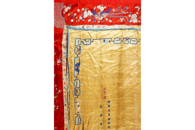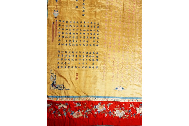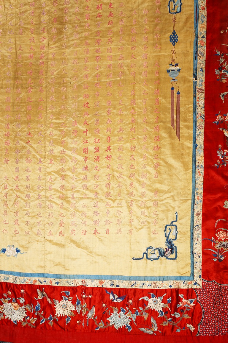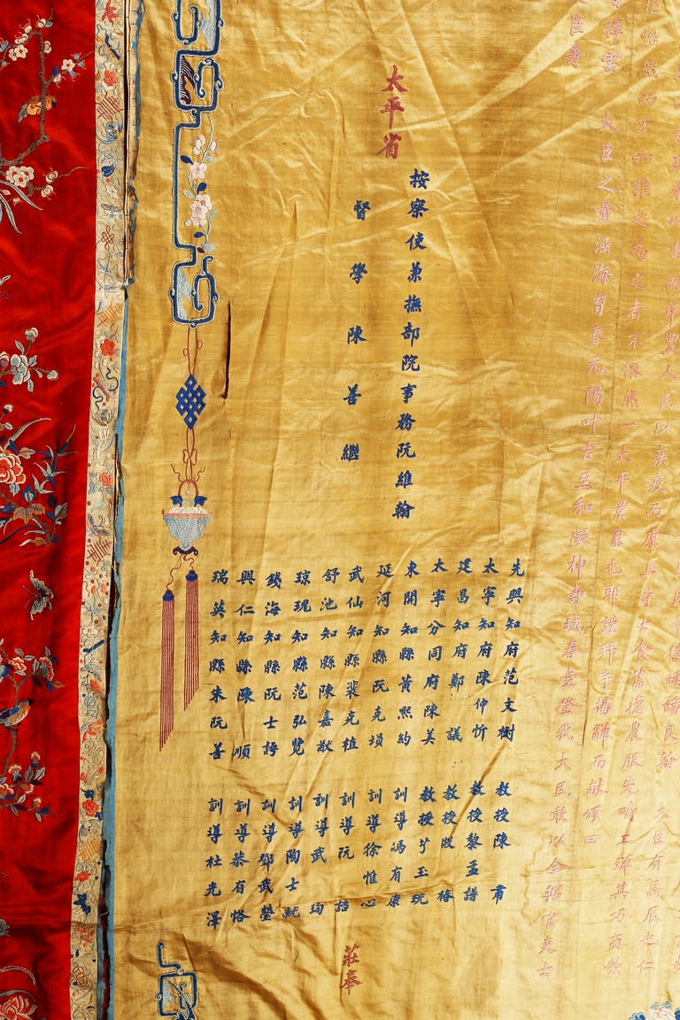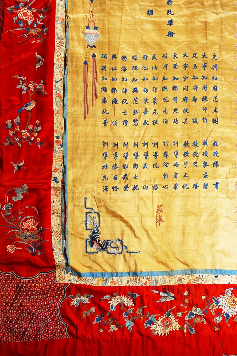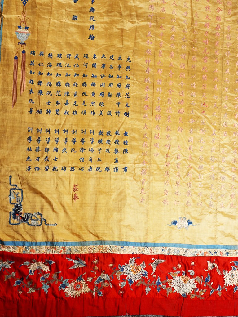 This large embroidery inscribed with a long inscription from Chen Shanji and other officials dedicated to an elderly official. The bordered embroidered with floral band on red silk as decoration. Late Qing Dynasty period.