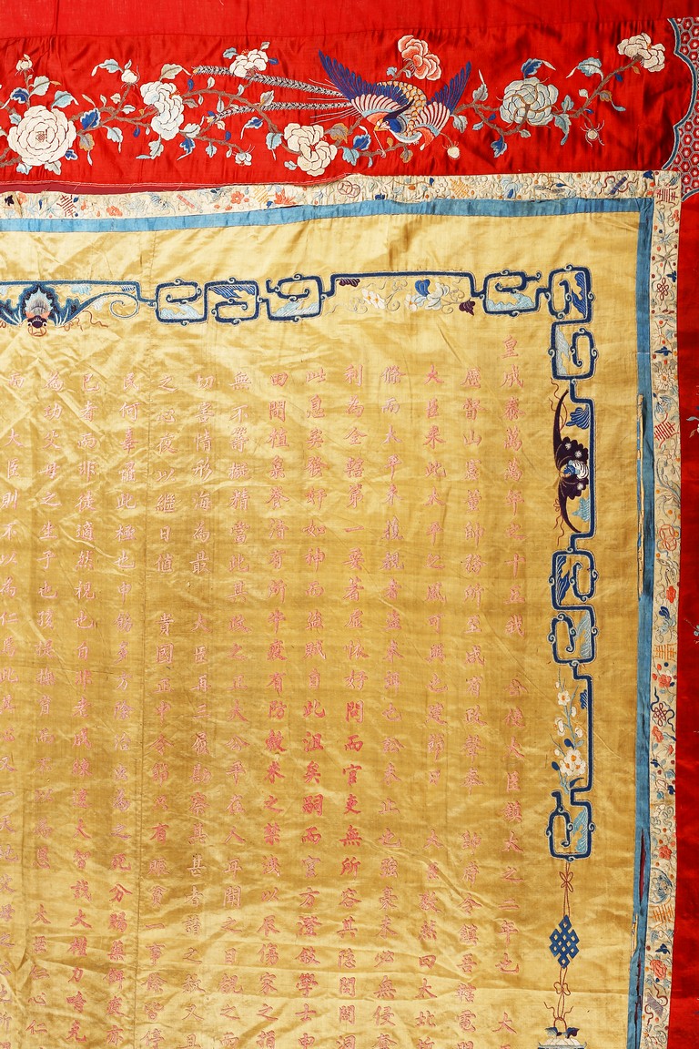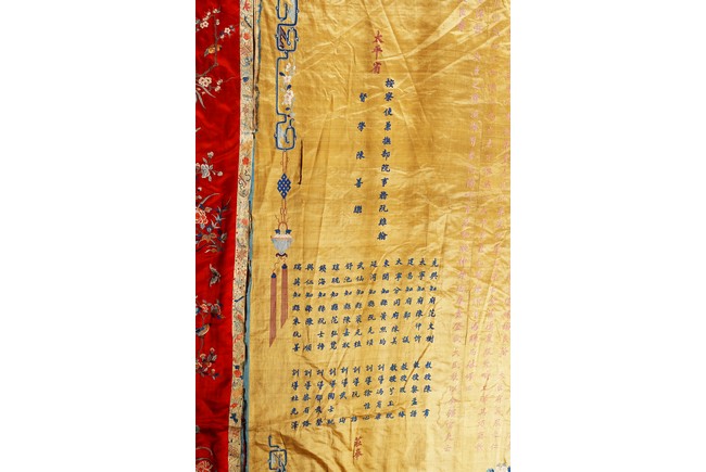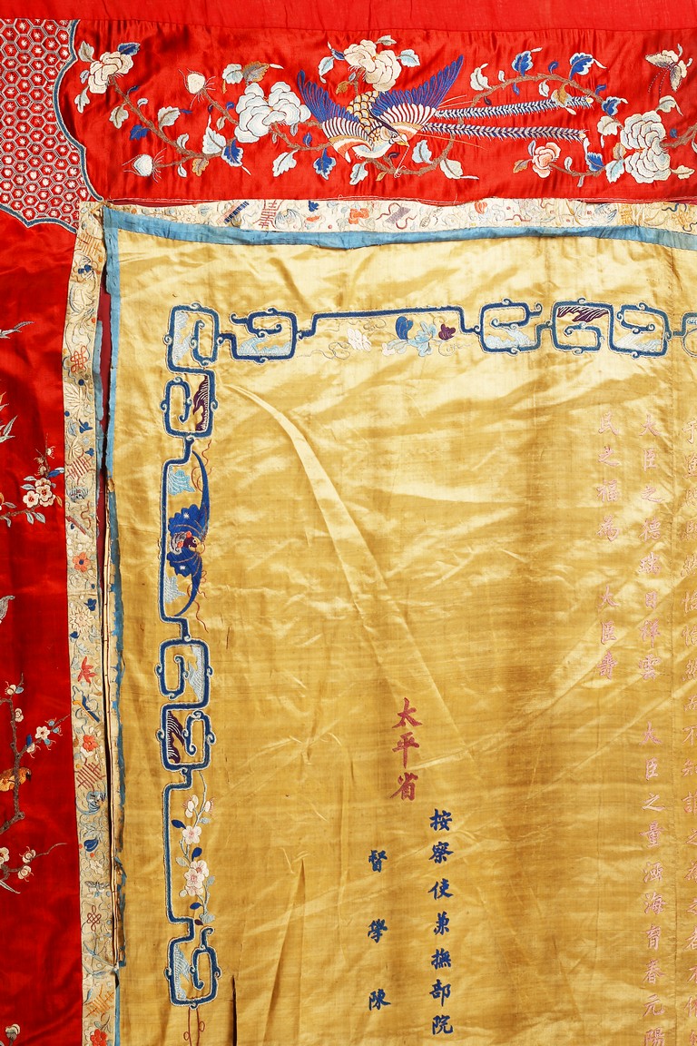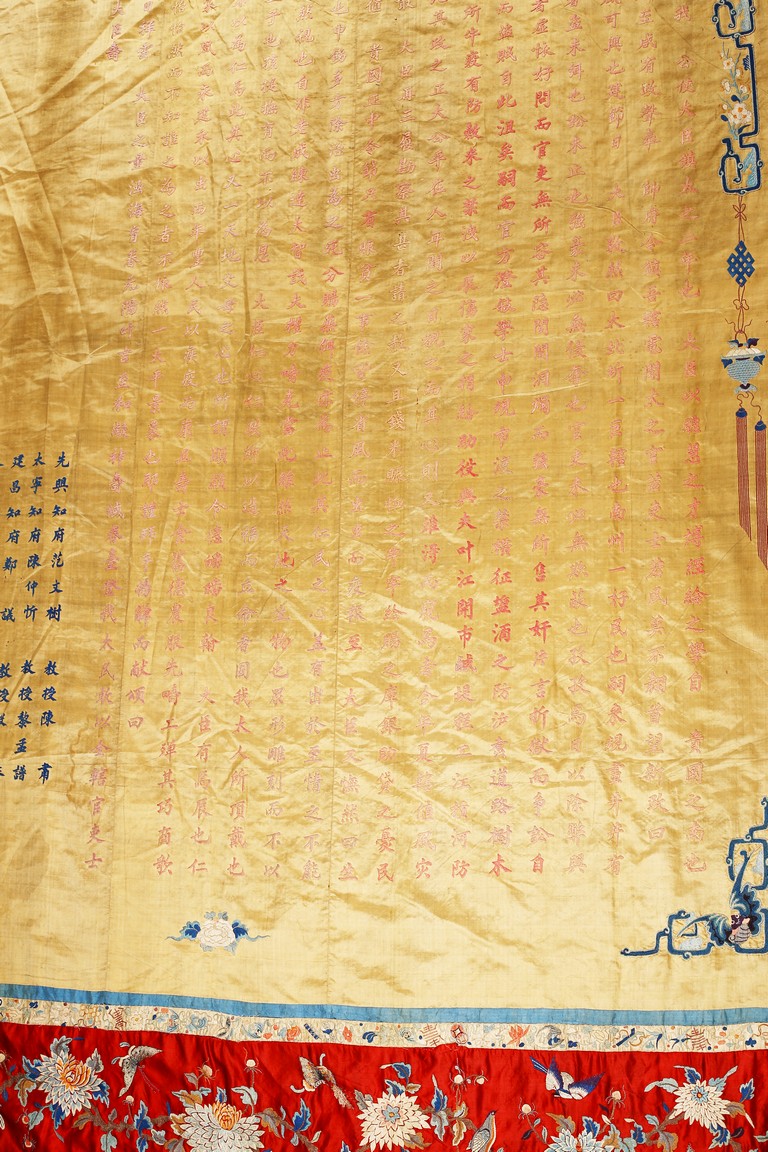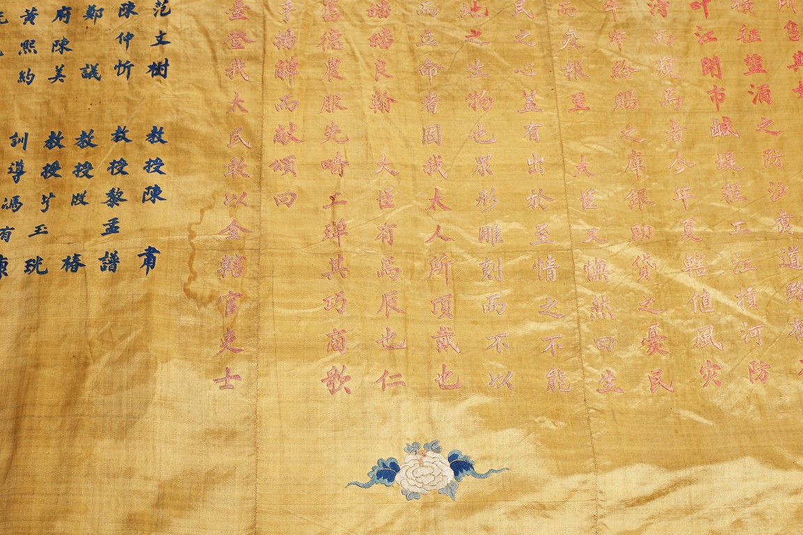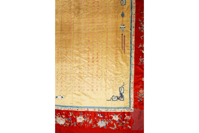 This large embroidery inscribed with a long inscription from Chen Shanji and other officials dedicated to an elderly official. The bordered embroidered with floral band on red silk as decoration. Late Qing Dynasty period.