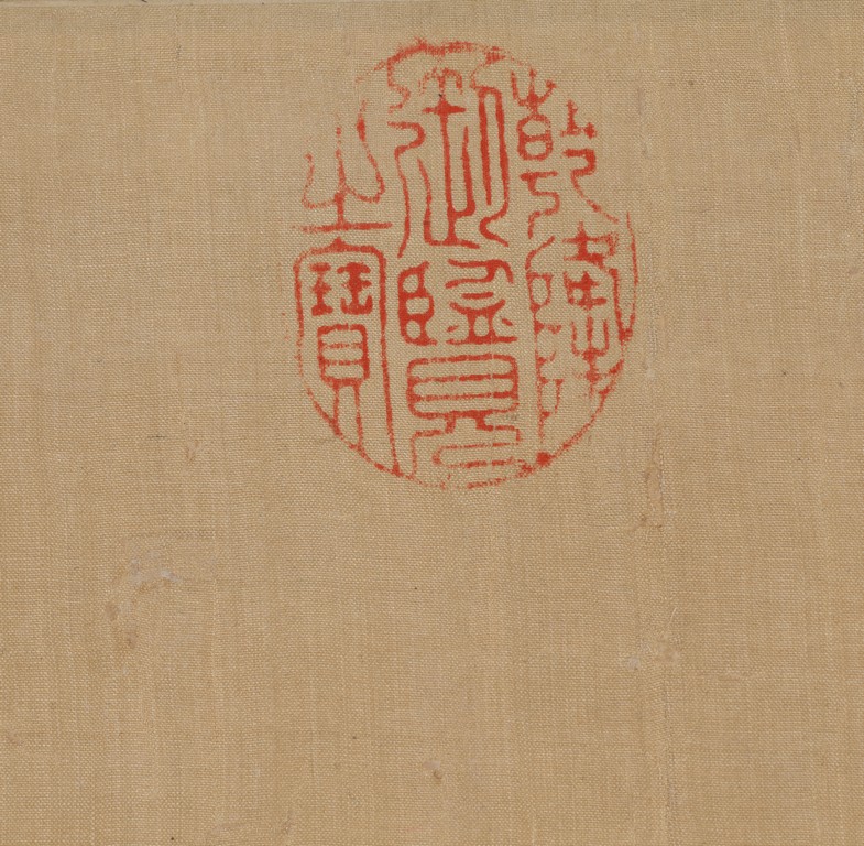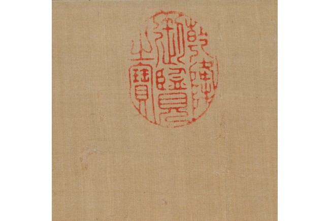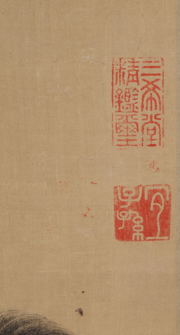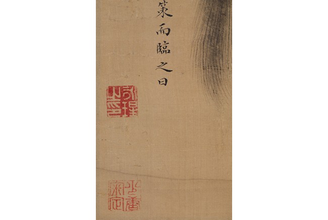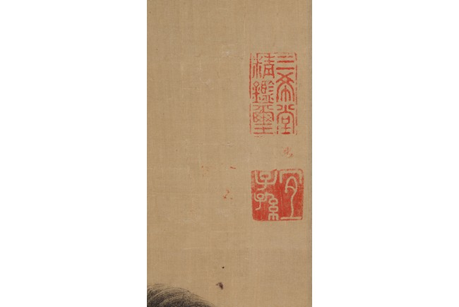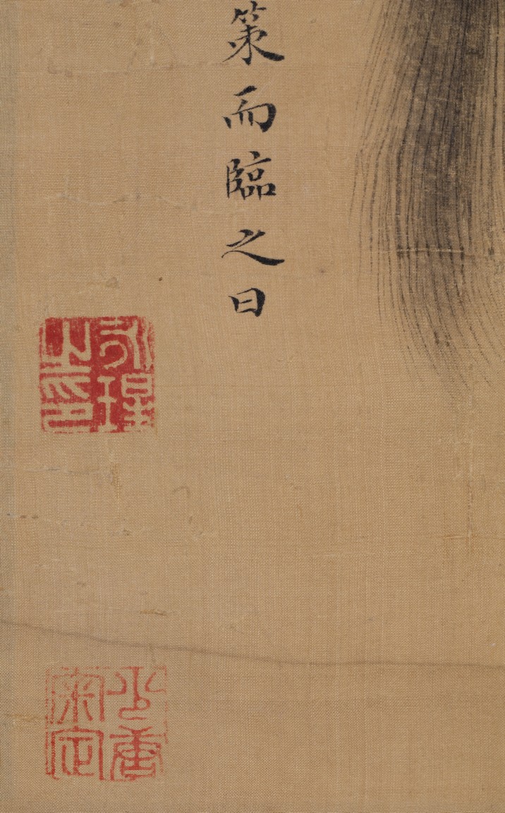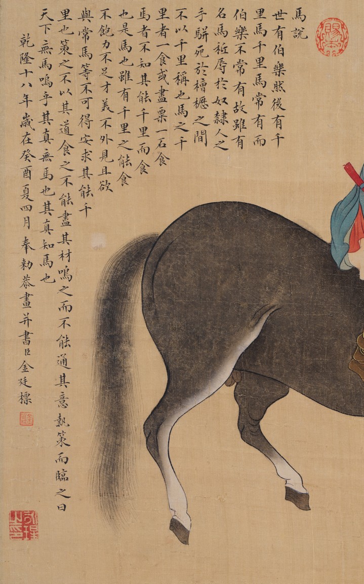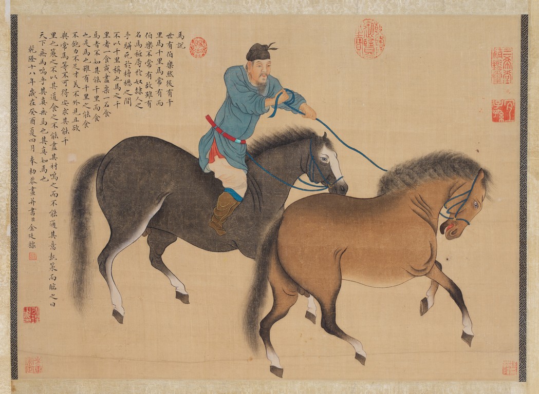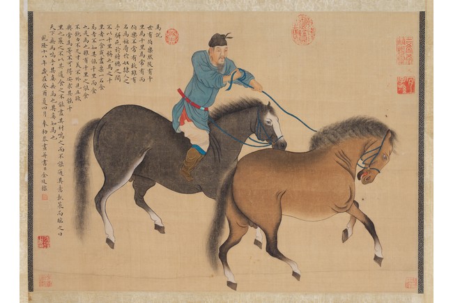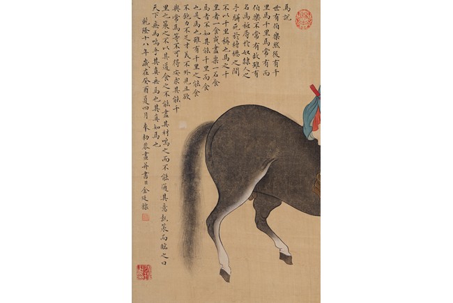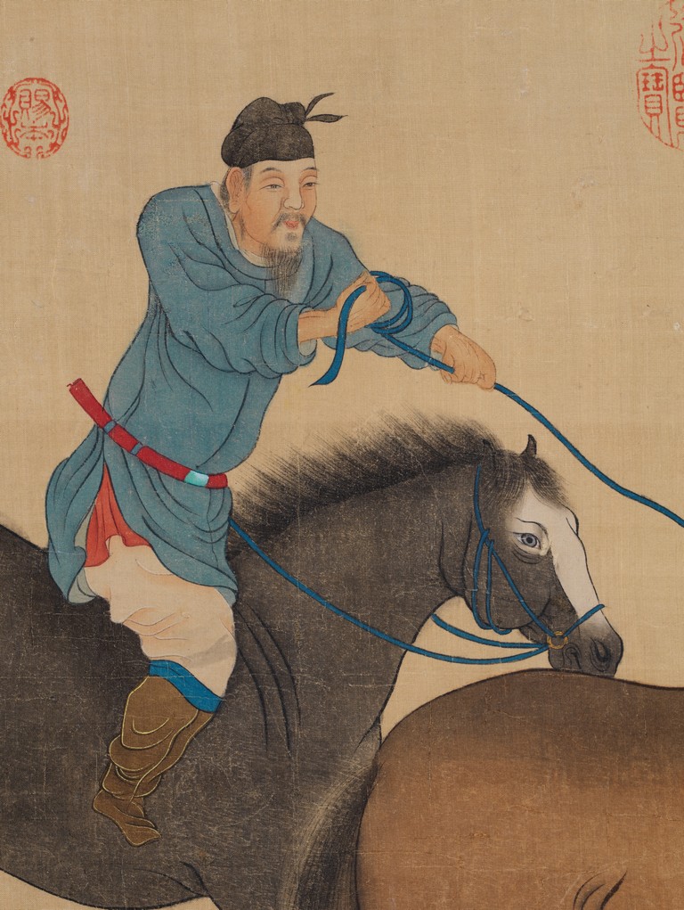Color and ink on silk, figure and horse, mounted on paper, inscribed and signed, with eight seal marks.