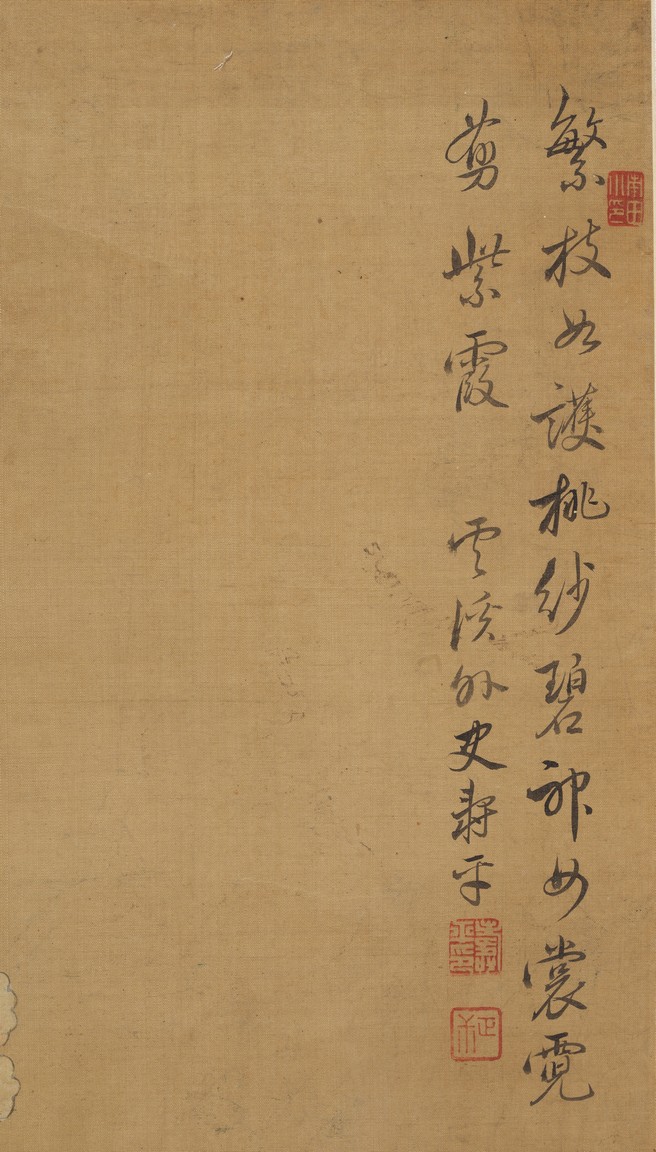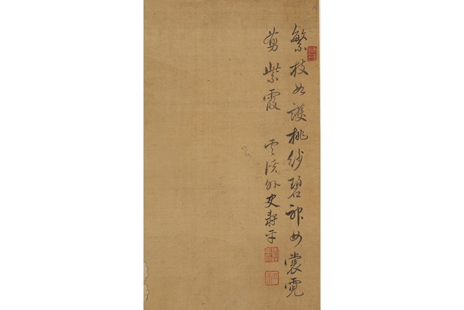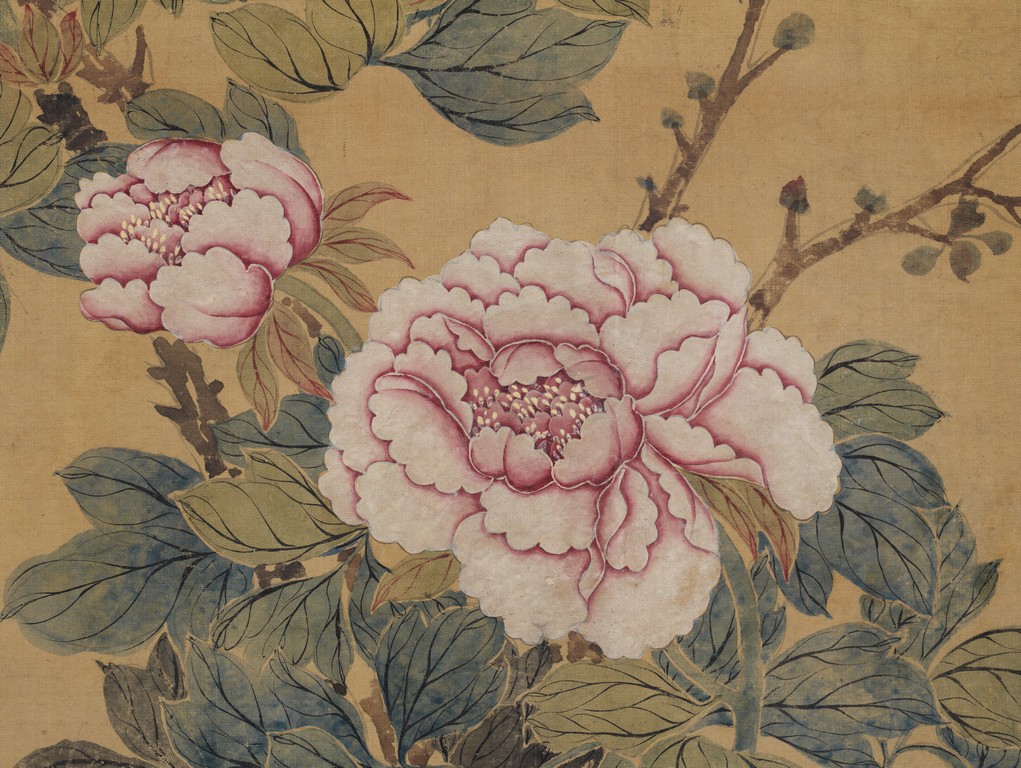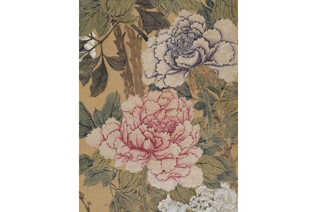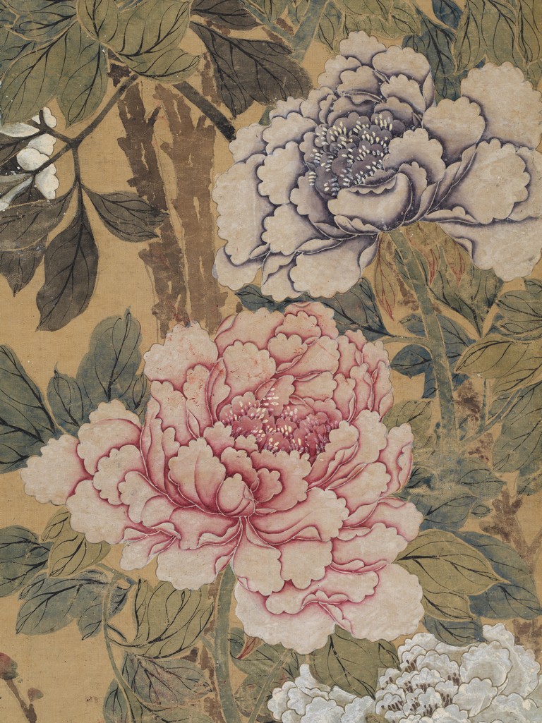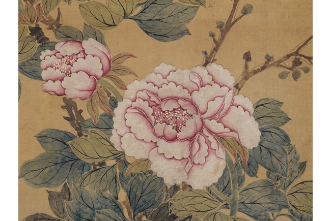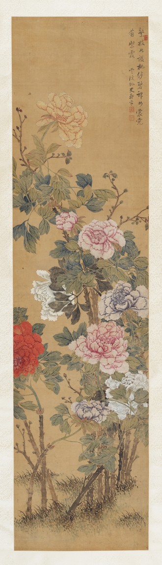 Color and ink on silk, peony, hanging scroll, inscribed and signed, with three seal marks. Yun Shouping (1633-1690)