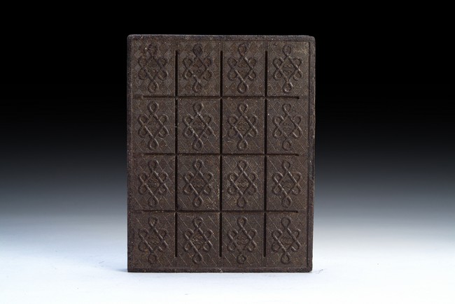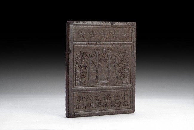 This compressed tea brick has a mold patterns on one side, consists of three separate sections. The top section depicts a pattern of five stars, the middle section depicts a scenery of four columned stone gate, and the last section depicts Chinese characters identifying the manufacturer of this tea brick. Republic period.