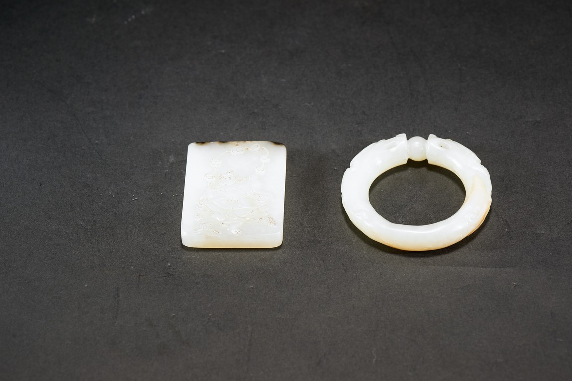 Including a small white jade bangle modelled as two dragon heads flanking a ball, the jade is even white tone with russet skin; a rectangular white jade plaque with incised figure. Qing Dynasty period.
