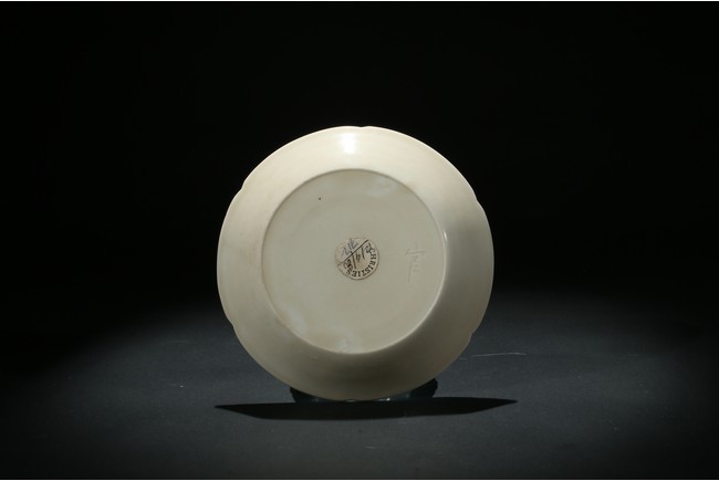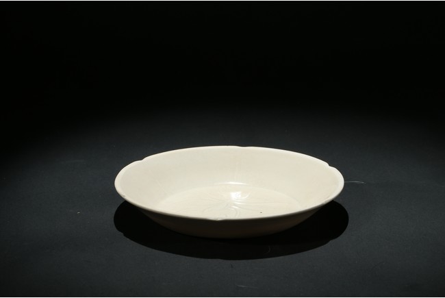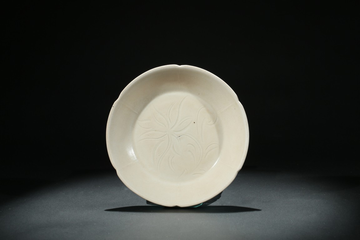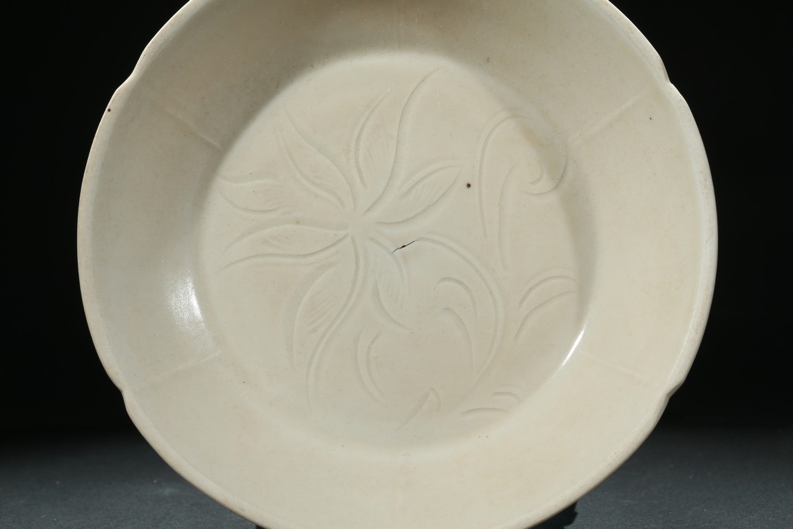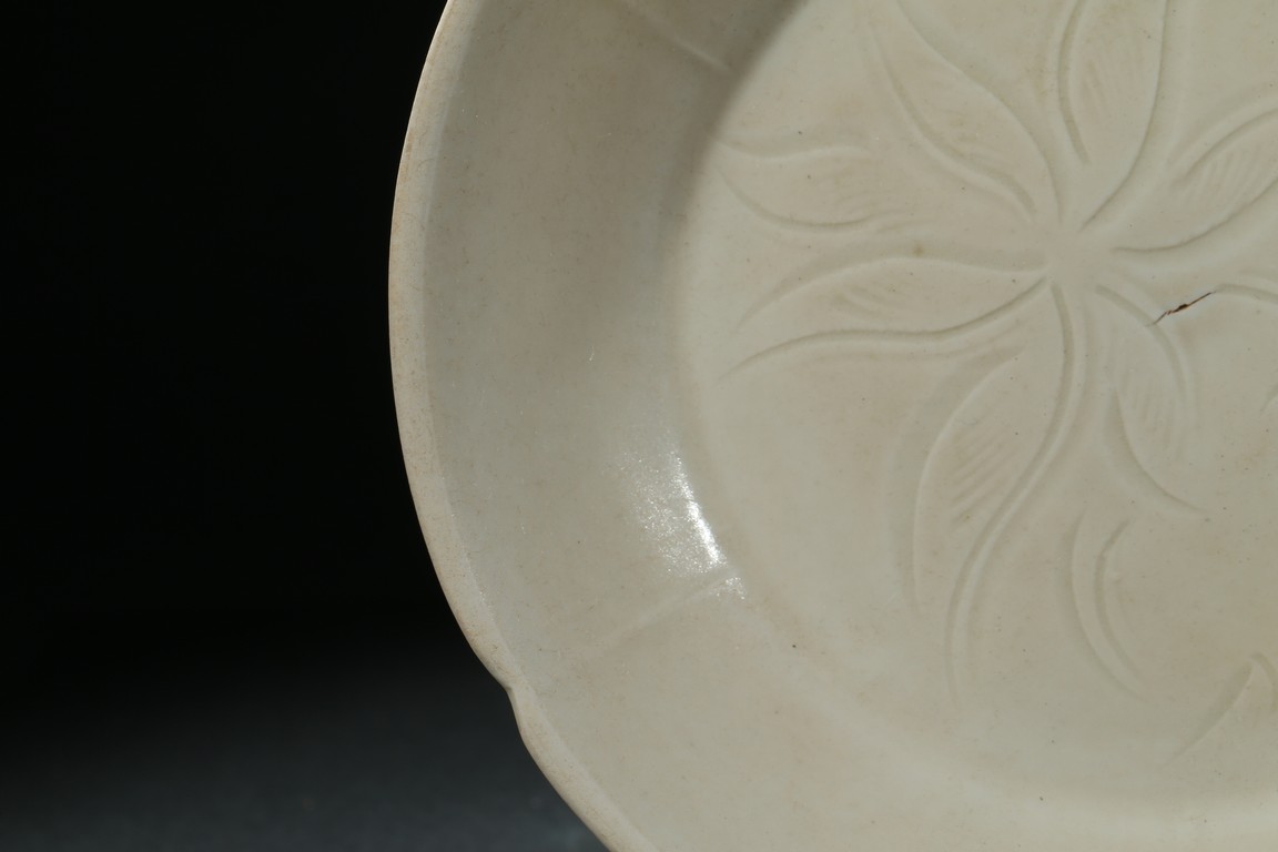 Of six petal-shaped gently flaring lobes rising from a flat base, the interior incised with a lotus spray, covered overall in a creamy white glaze. The underside carved a 'Guan' character. Song Dynasty period.