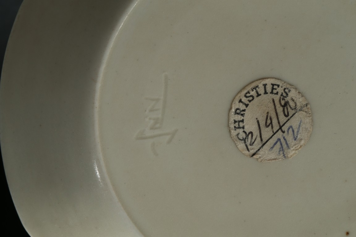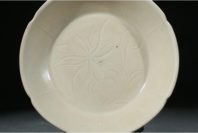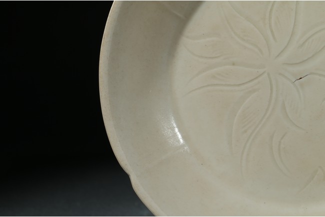 盤敞口,微撇,裏外勻施白釉,釉色沈靜厚潤。盤心刻有萱草花卉紋,莖葉悠然捲曲,線條流麗生動,轉折深淺之間,刀法俐落自如,盡顯匠人嫻熟工藝。胎質細膩,器形端莊,盤內劃花線條流麗生動,釉面柔潤,色呈牙白悅目,聚處若淚痕而色略深,久歷千年風霜,樸淳如昔,足證其珍。
