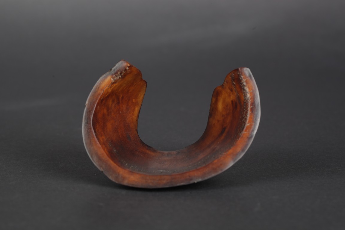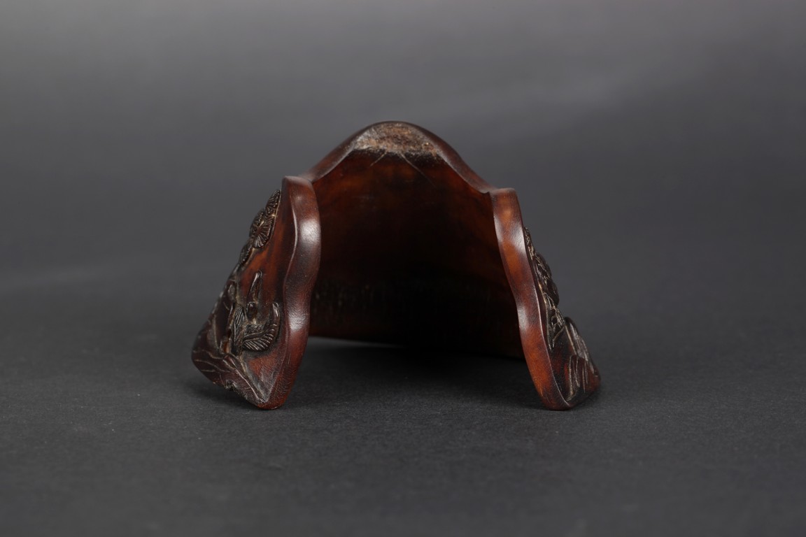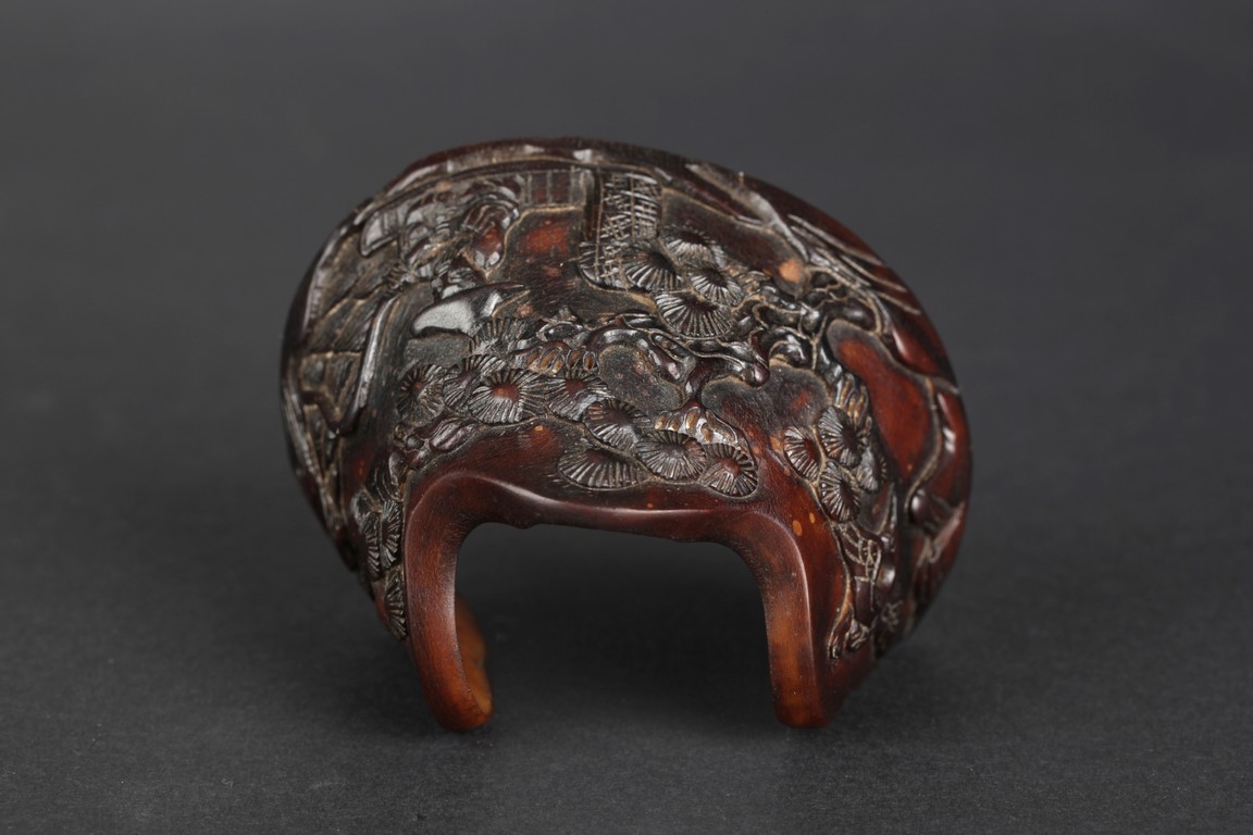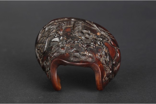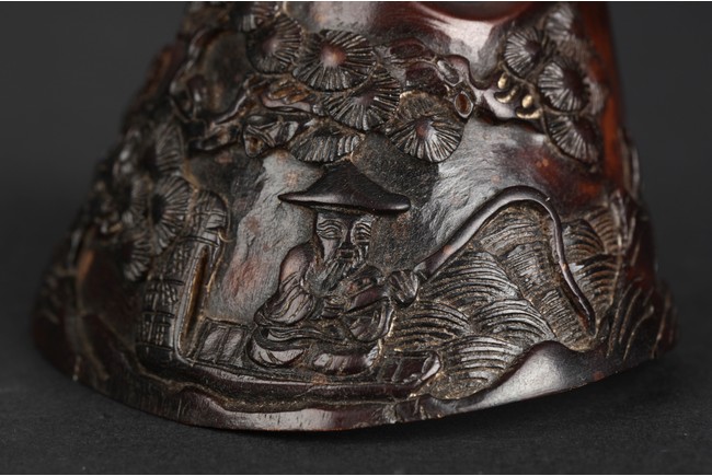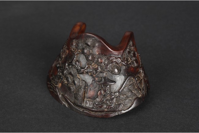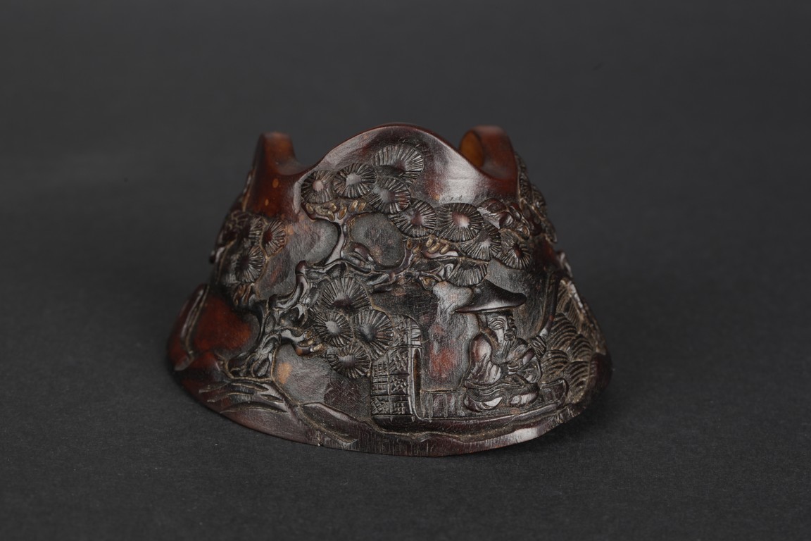 A brush holder carved from horse hoof, depicting an old man fishing under a tree next to a river. The carved scene also includes pine trees, cranes, river, and bow. Qing Dynasty Period