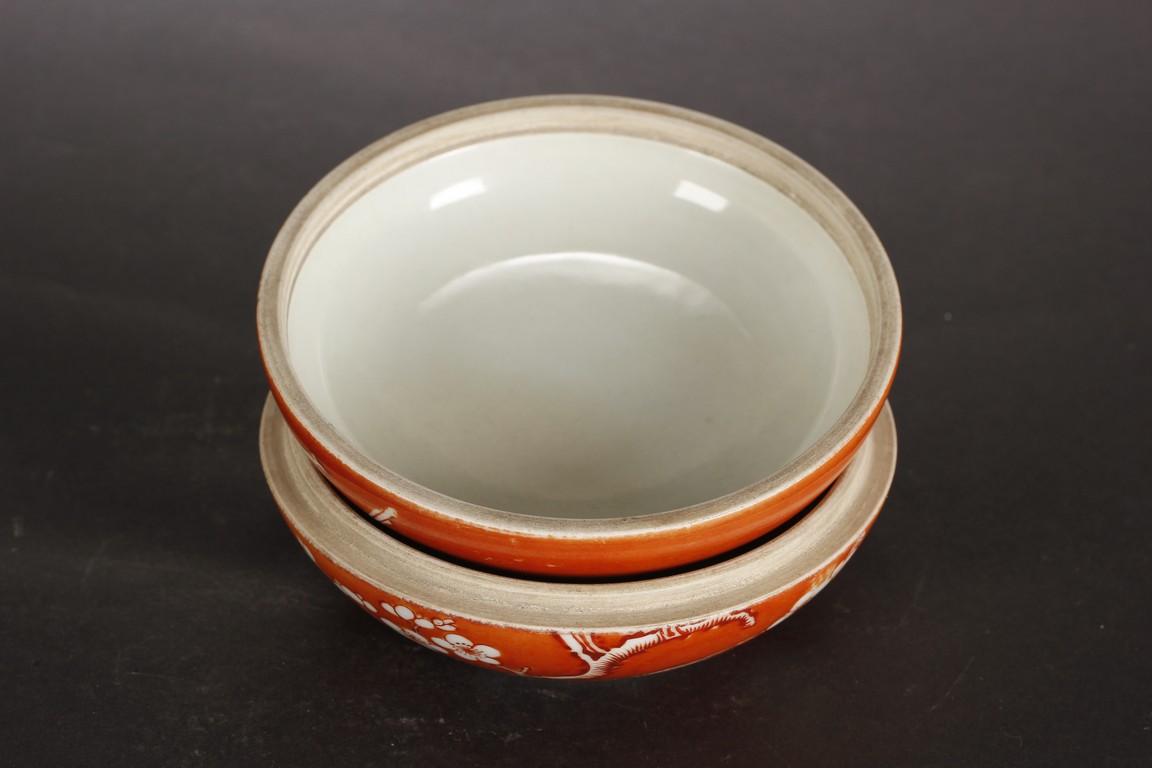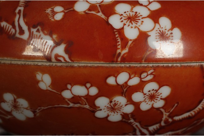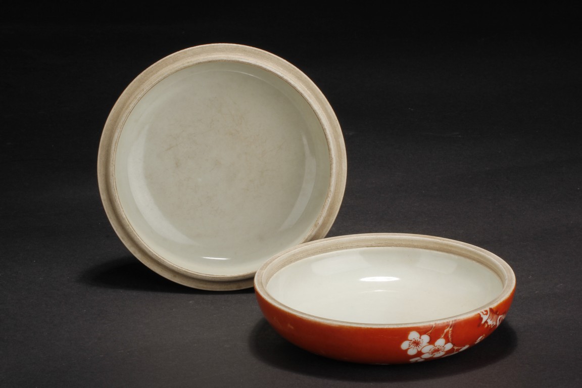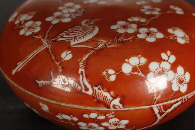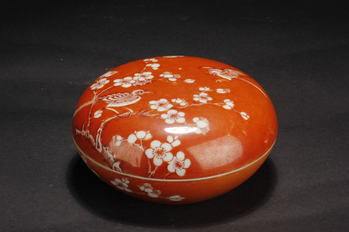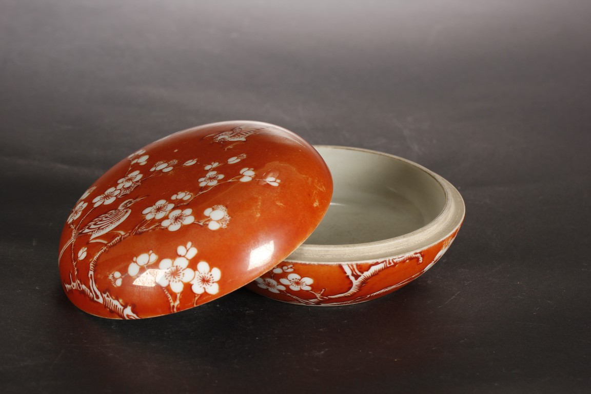 Of flattened ovoid form, the ink cover box covered in coral red glaze, with a magpie perched on blooming plum tree, and another magpie flying towards it, bottom bears four character 'ZHENYUTANG' mark. Qing Dynasty period.