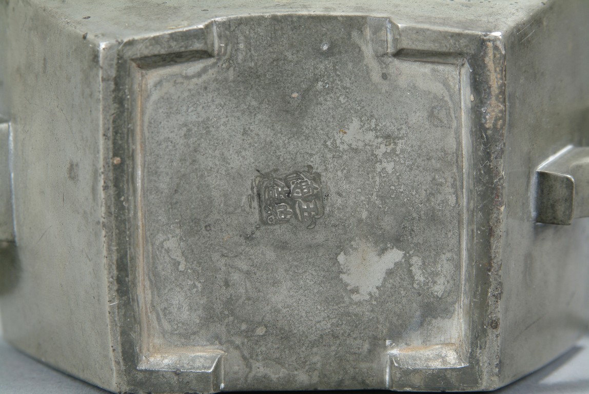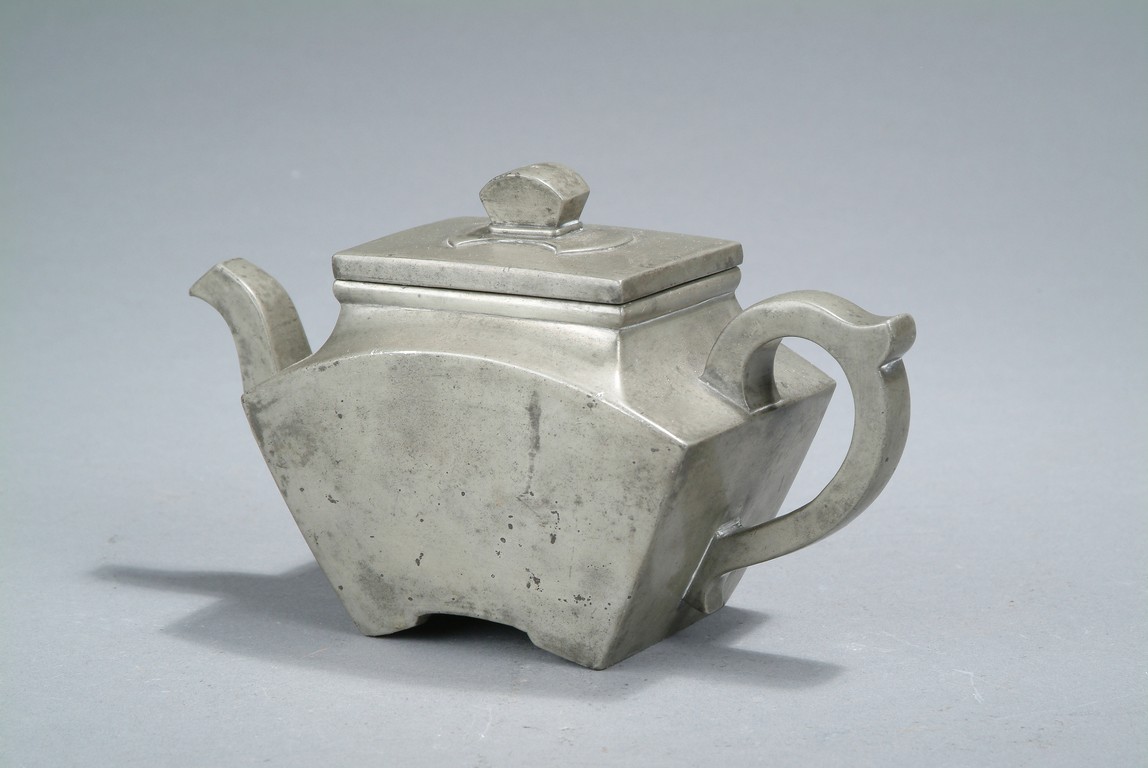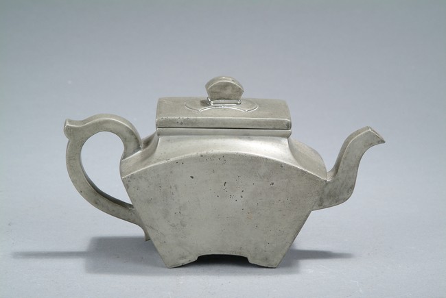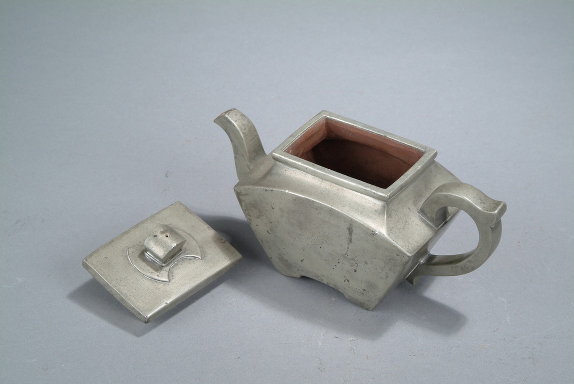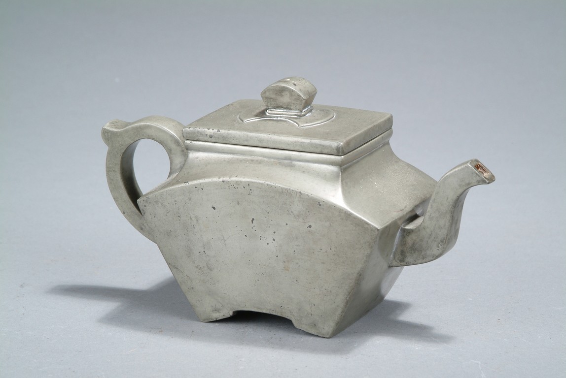 The teapot's body is of fan shape, with sharp rectangular openings, bridge-arc-like base, and brown-red interior. Bottom bears four characters mark.