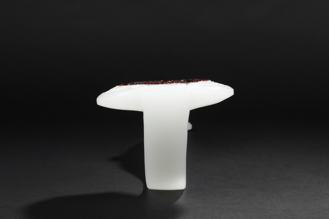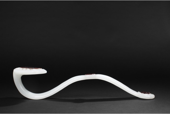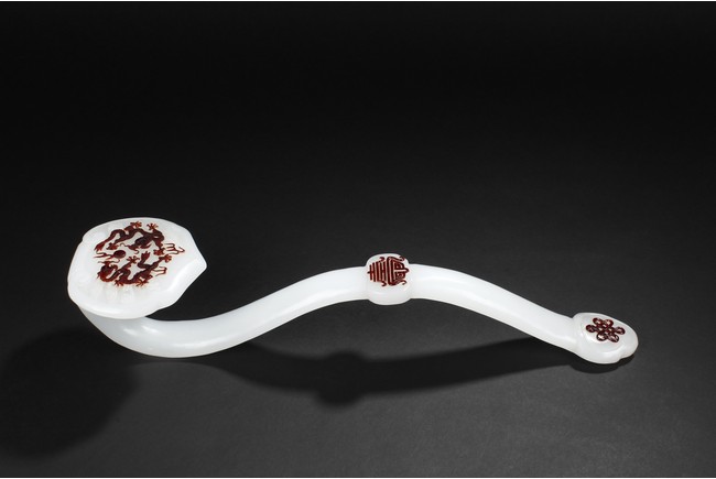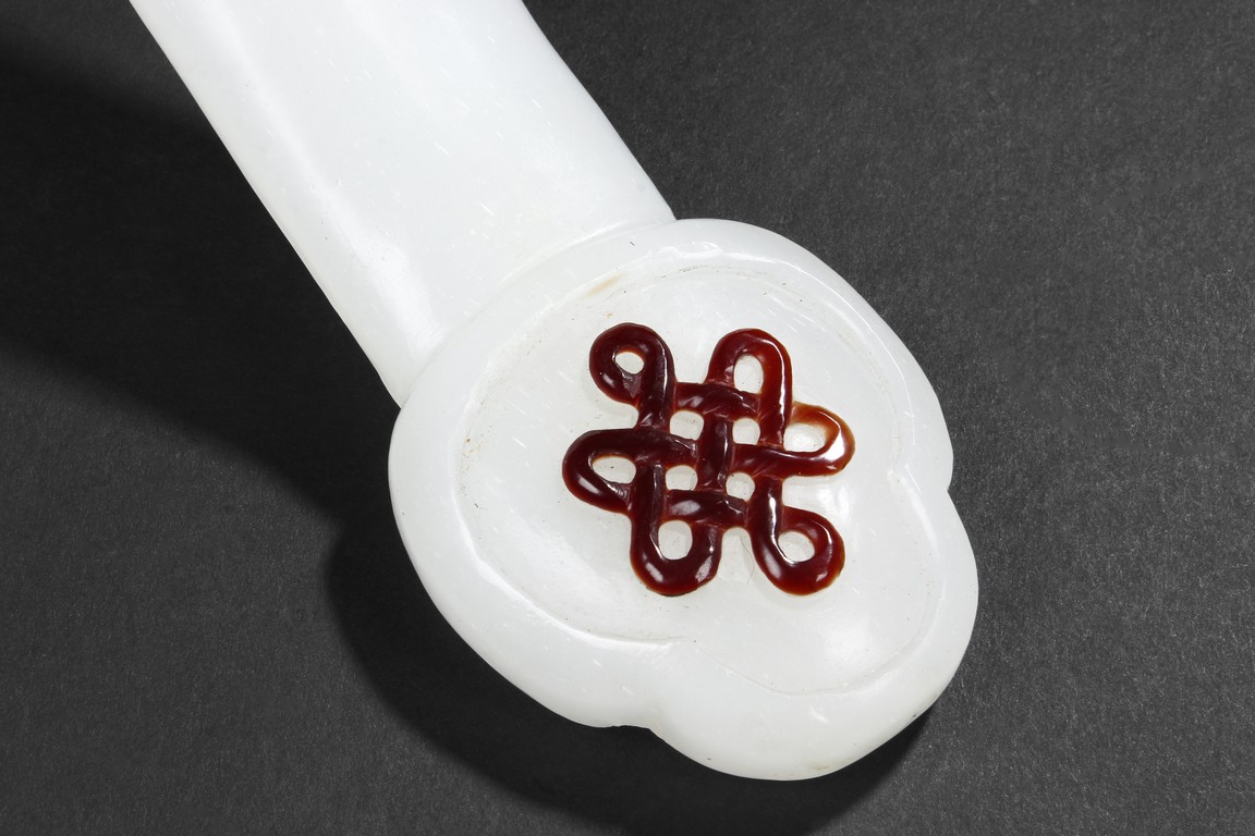 Of elegant S-shape,this ruyi scepter is elaborately carved through the red overlay to the opaque white glass with a flaming pearl flanked by two flying dragons in the head. The mid section is carved with a stylised character 'Shou',or longevity. It ends with a carved auspicious symbol of knot terminal and includes a yellow silk cord.Qing Dynasty period