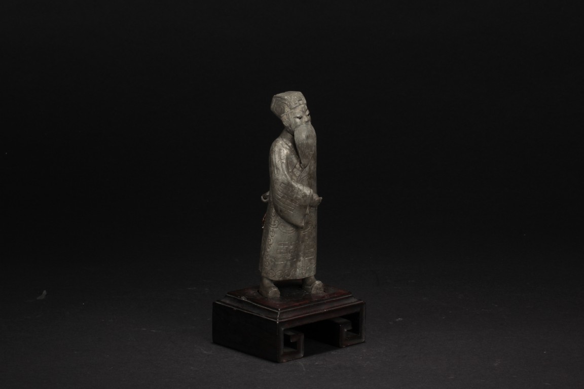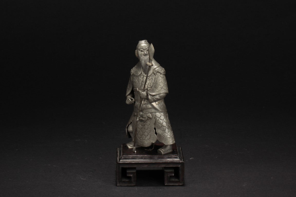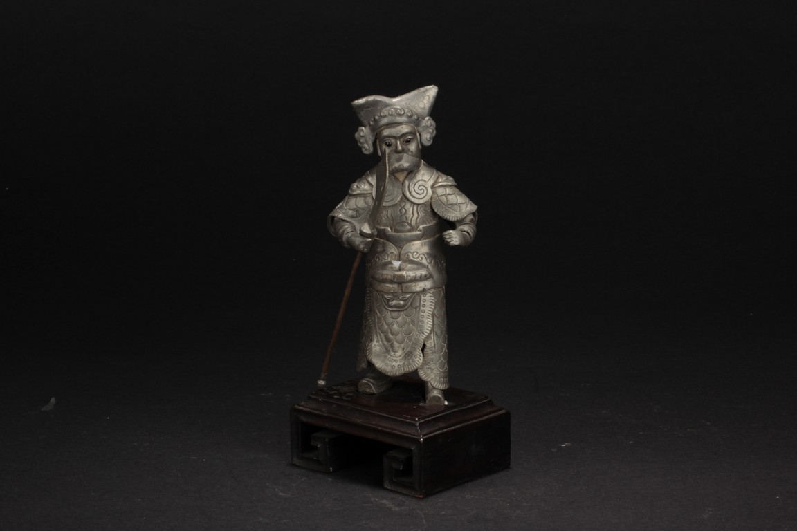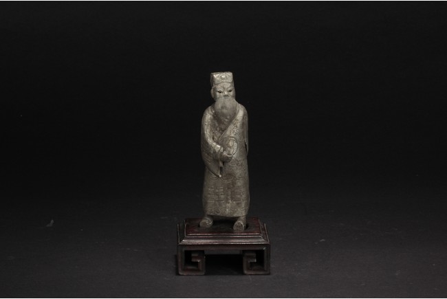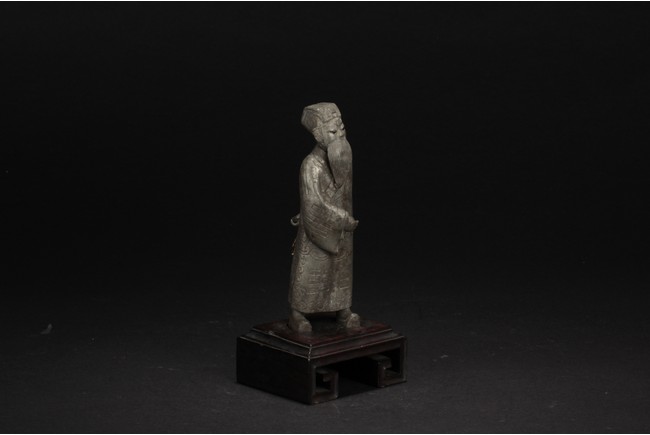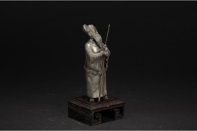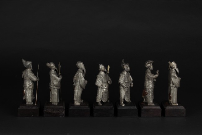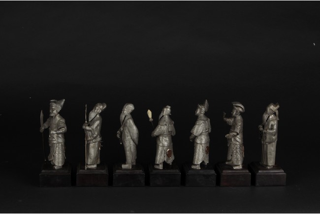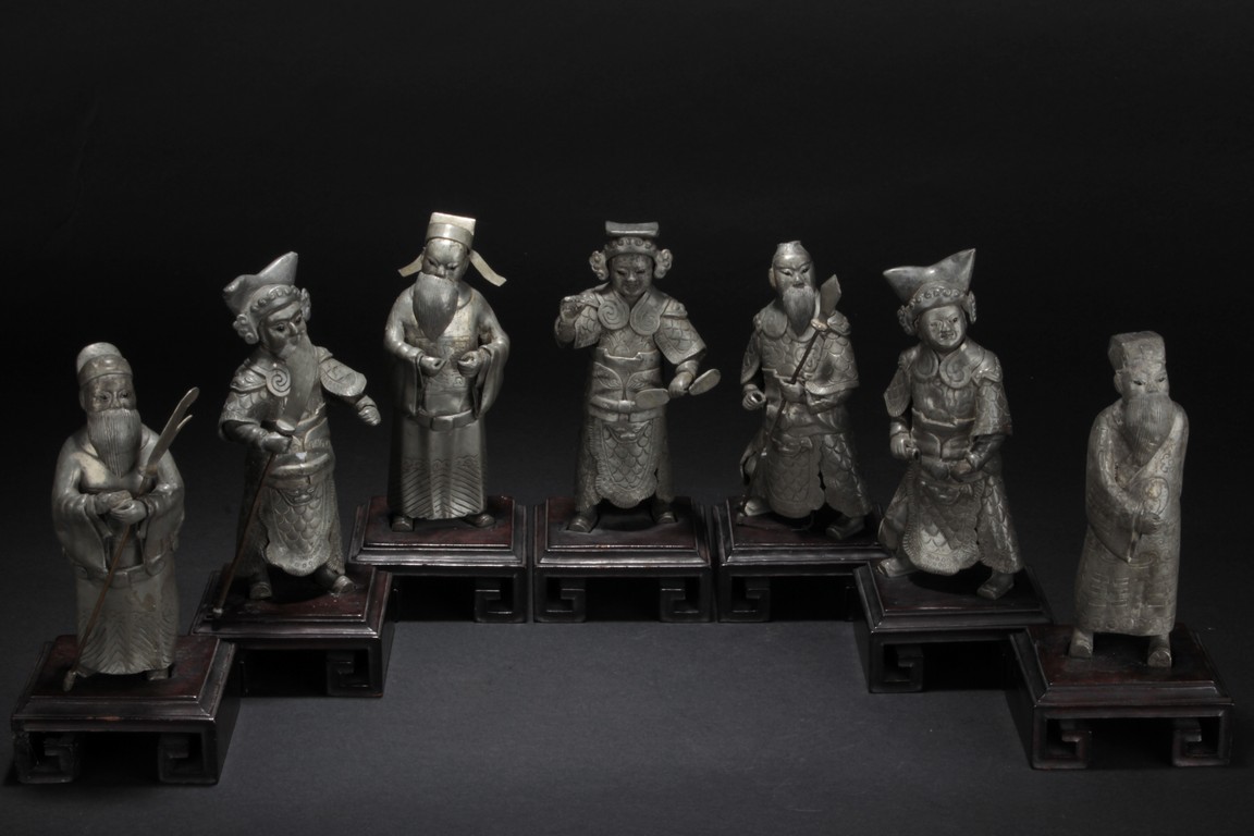 Comprising of seven pewter figures, including four military figures fully armored, each holding a long spear, and three elderly civil officials with long beard, each wearing voluminous robe and hat, all supported on square sectioned hardwood stands with scrolled feet. Qing Dynasty period.