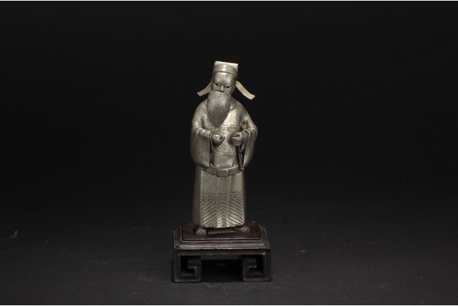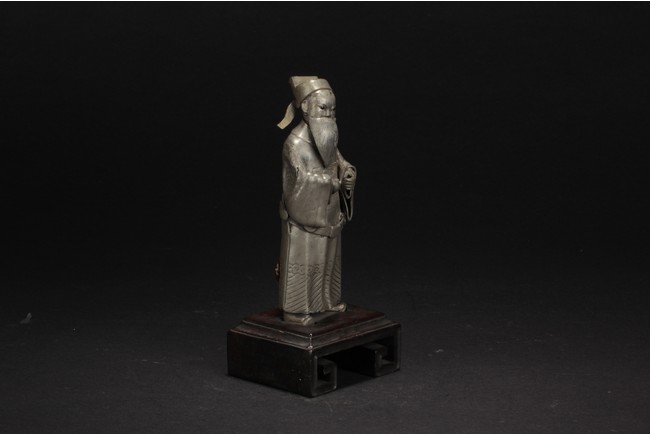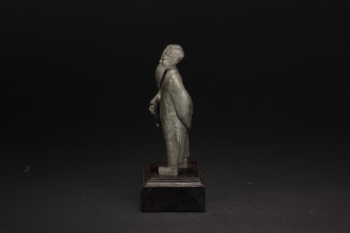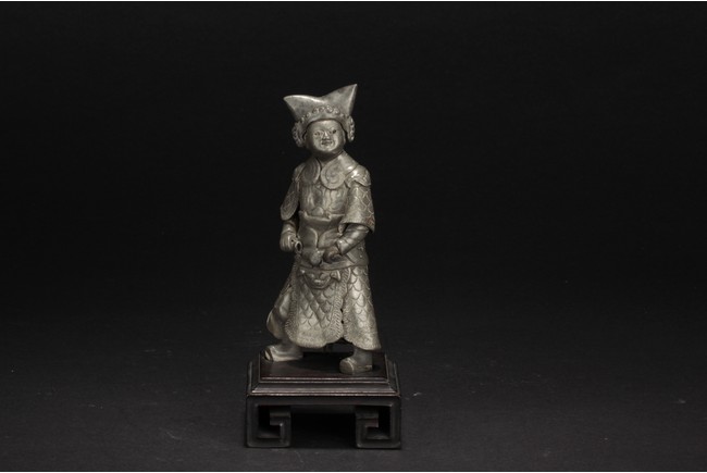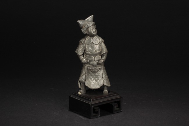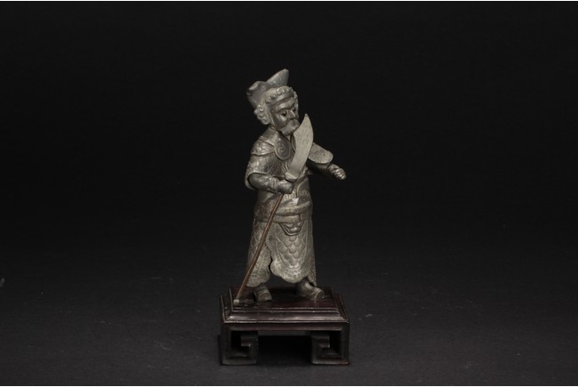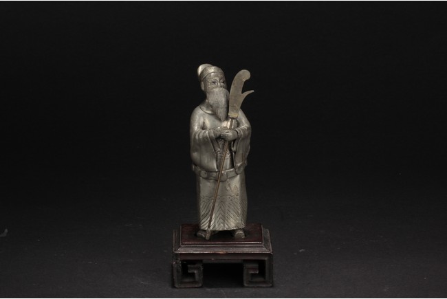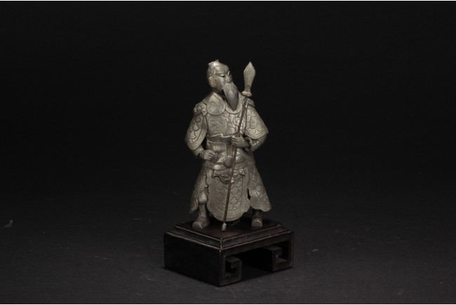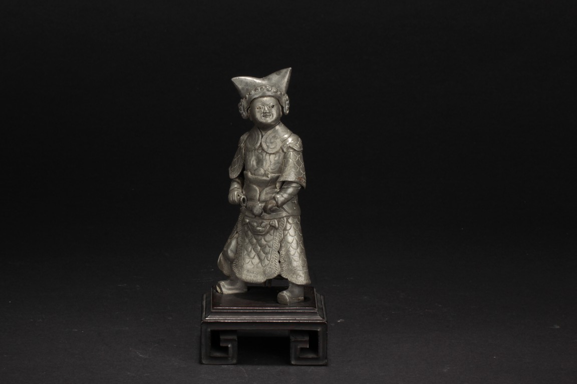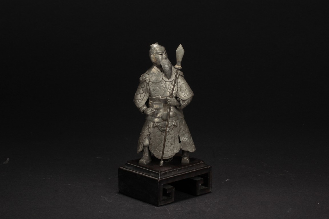 Comprising of seven pewter figures, including four military figures fully armored, each holding a long spear, and three elderly civil officials with long beard, each wearing voluminous robe and hat, all supported on square sectioned hardwood stands with scrolled feet. Qing Dynasty period.