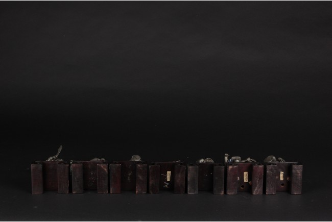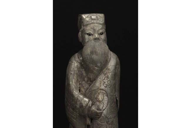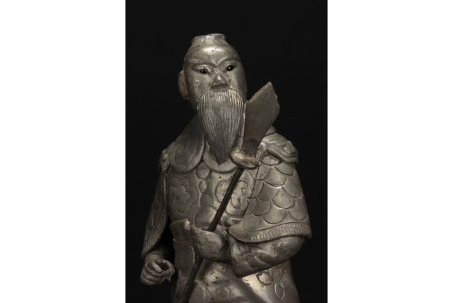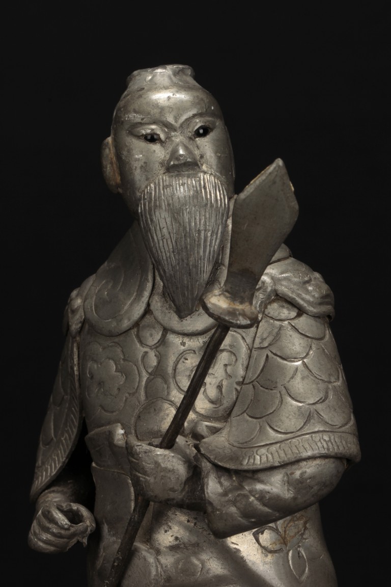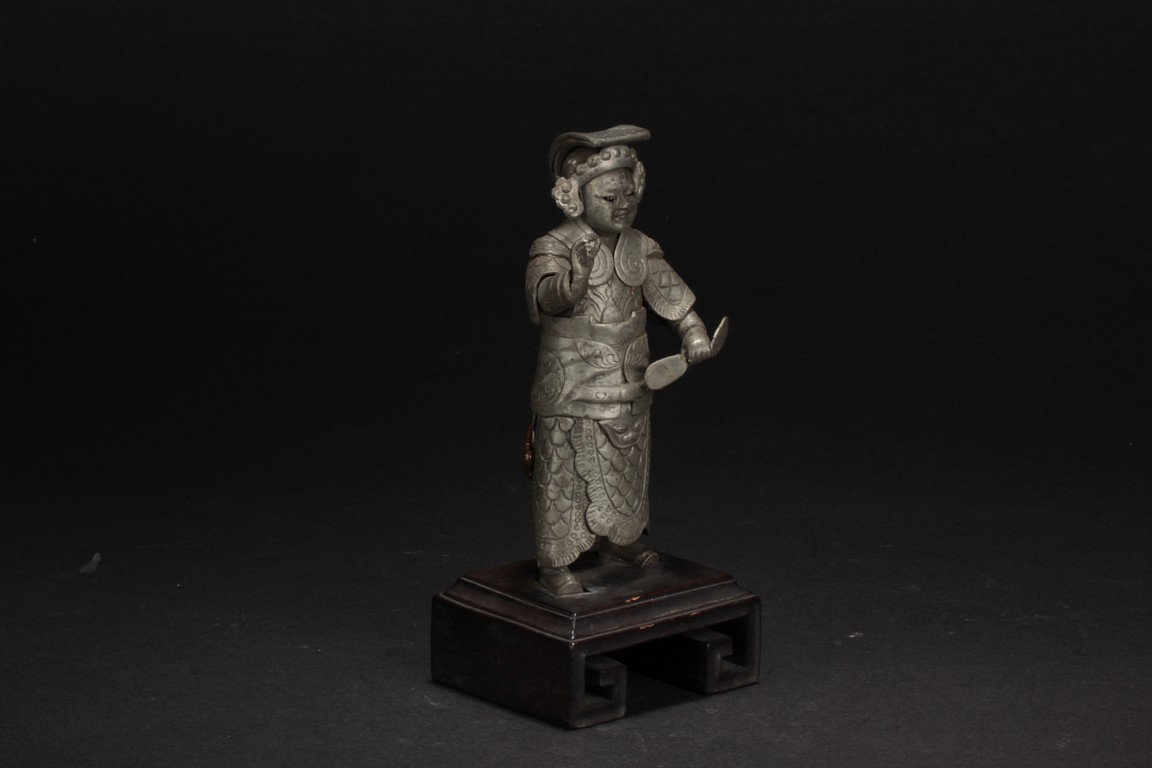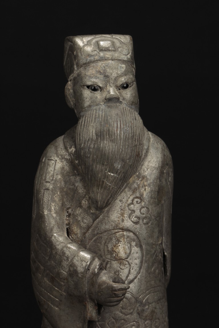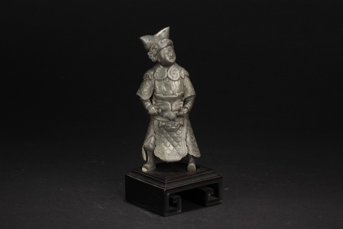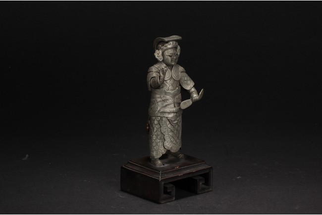 Comprising of seven pewter figures, including four military figures fully armored, each holding a long spear, and three elderly civil officials with long beard, each wearing voluminous robe and hat, all supported on square sectioned hardwood stands with scrolled feet. Qing Dynasty period.