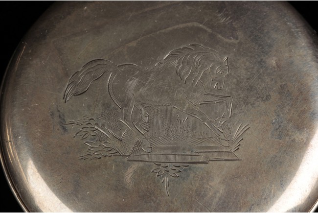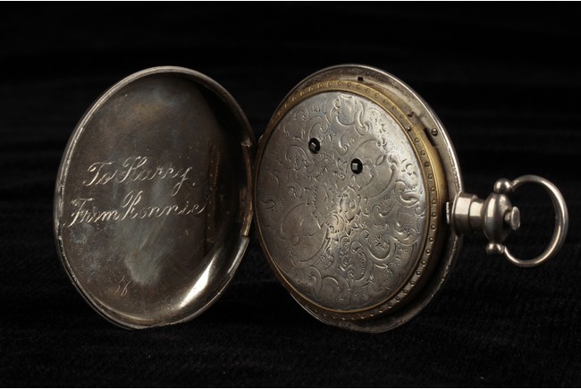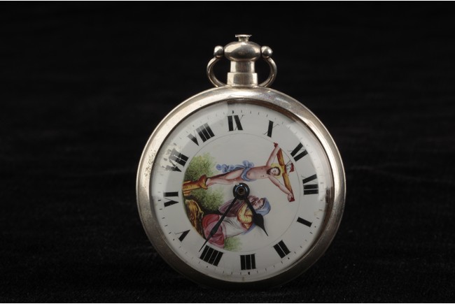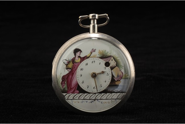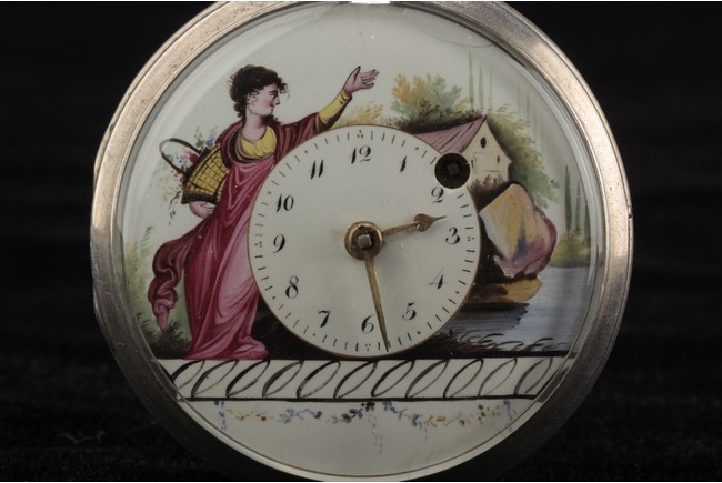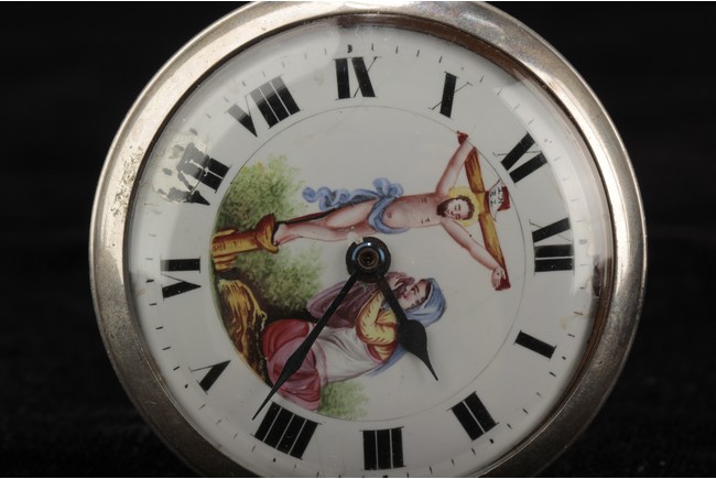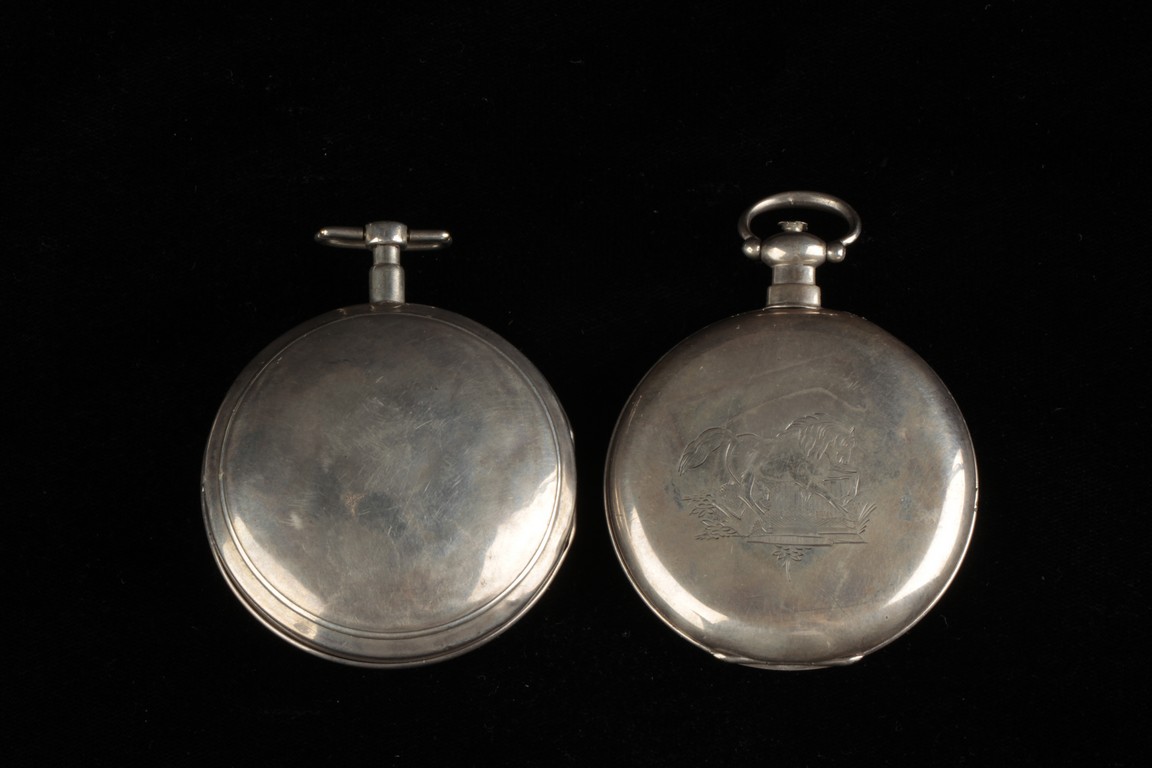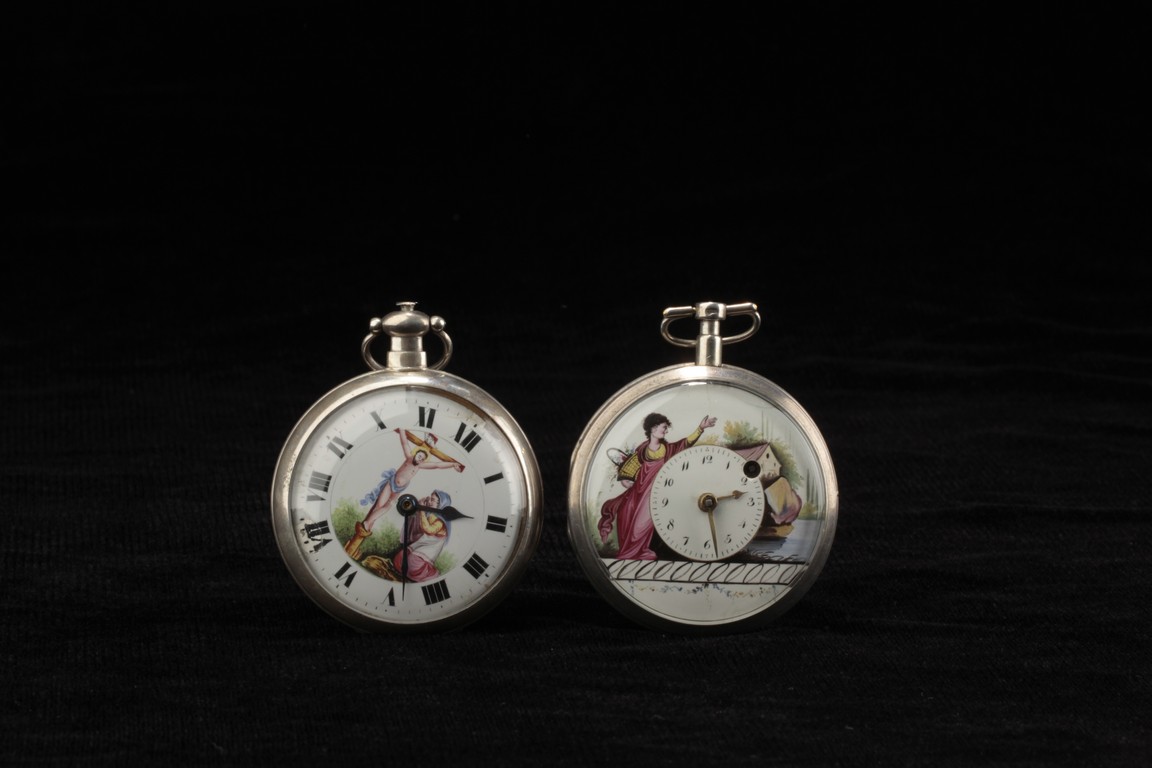 Of circular form, one watch with Jesus on the cross with a praying lady, the other watch with a lady holding flower basket near a house, both made with silver and require manual winding. 19th century.