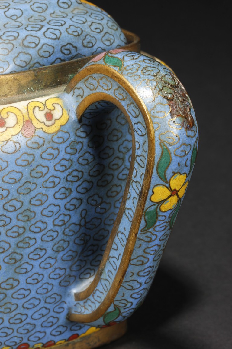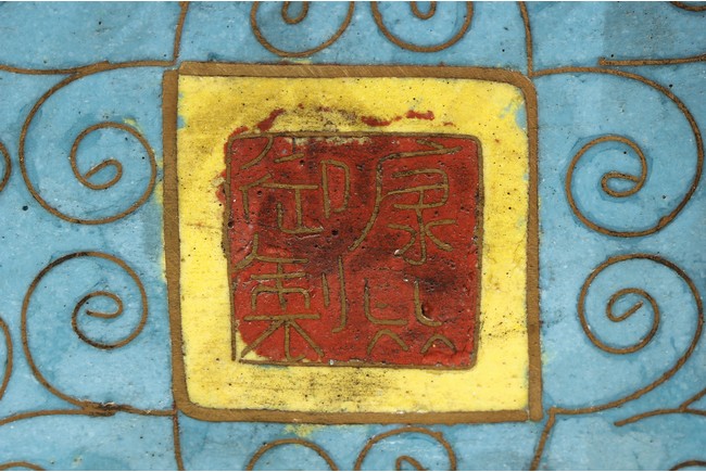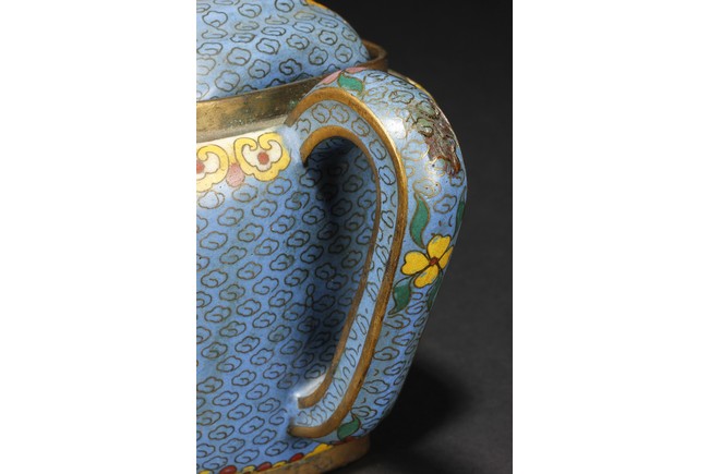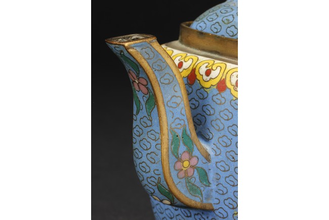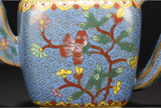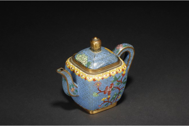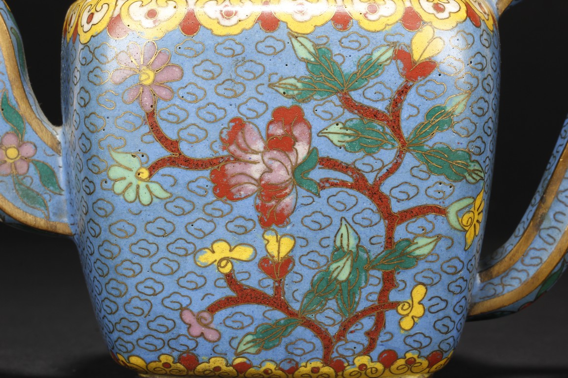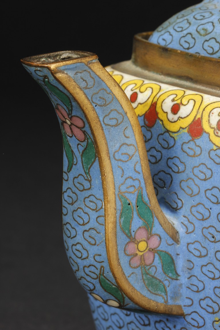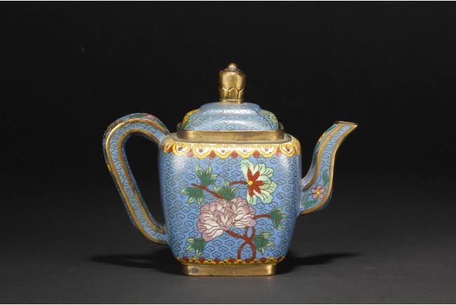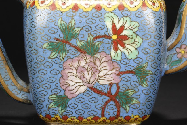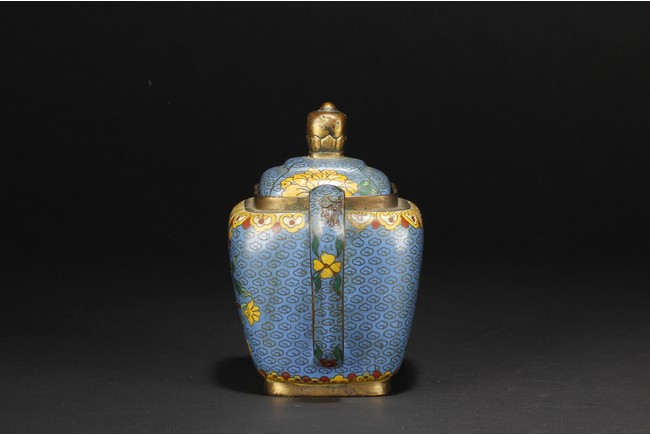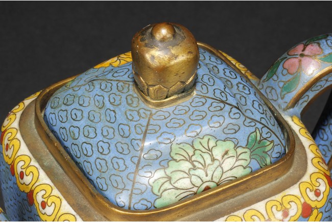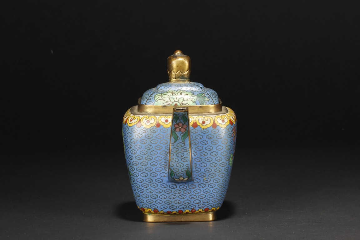 Of round square form,the body supported by a square foot ring,with large handle extending from near base to shoulder,the spout curved slightly extending from the middle of body,the body depicts blossoming peony flowers,leaves,and branches on top of teal background filled with small cloud patterns,between scrolling ruyi-headband pattern and scrolling ruyi-head cloud pattern,the bottom bears four character 'KANGXI' mark. Republic period.