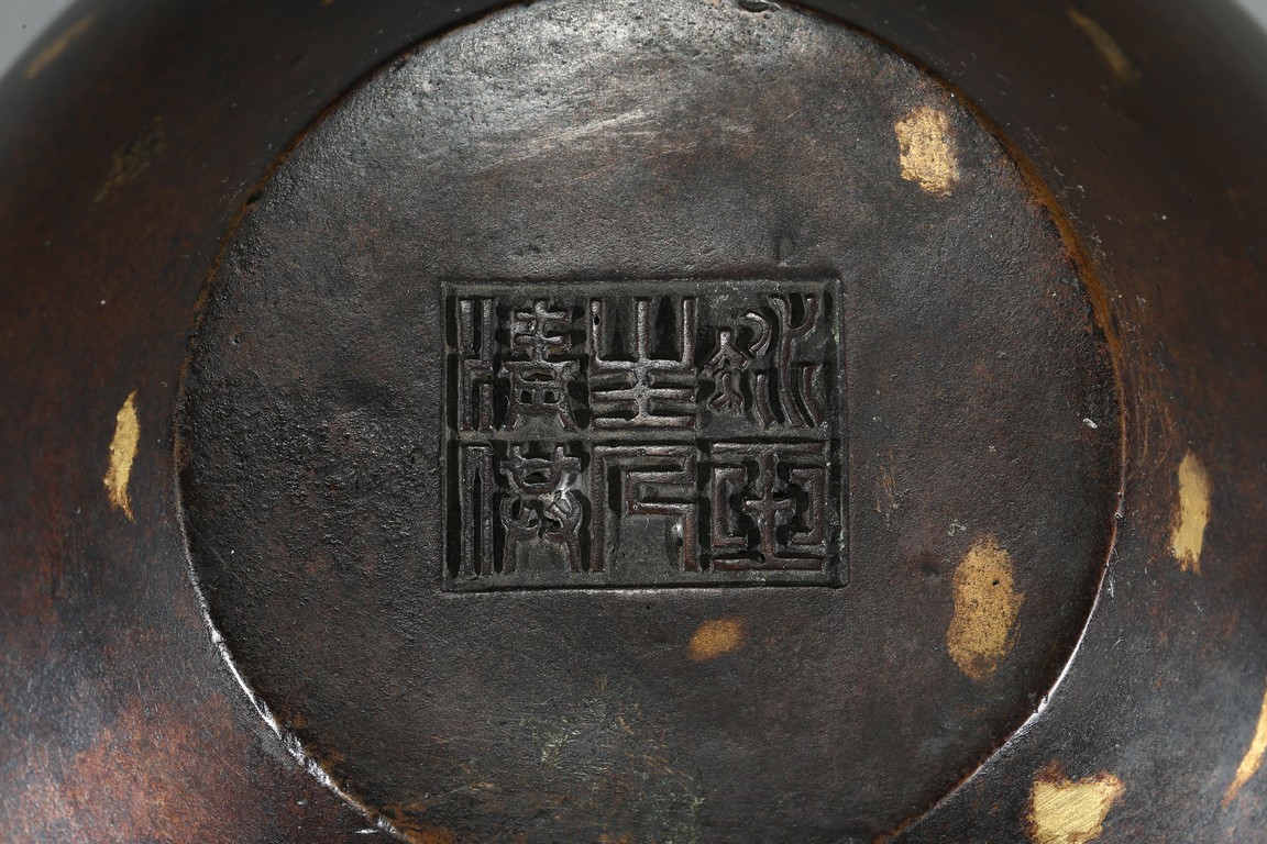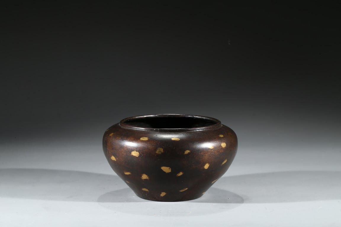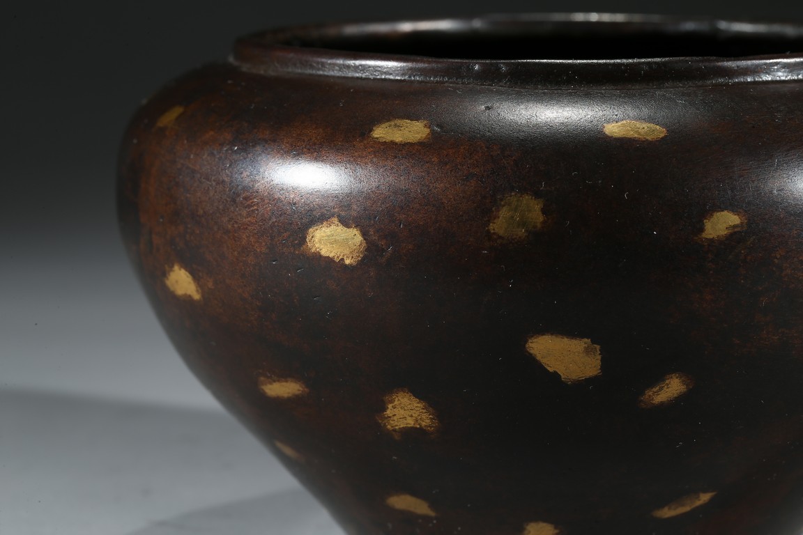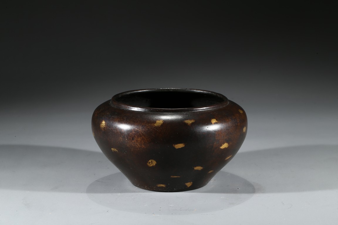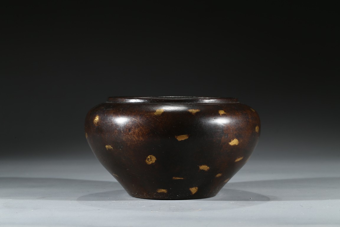 The compressed globular body with rounded shoulders below an incurved lipped mouth, the exterior decorated with random gold splashes, the flat base inscribed in gilt with six character mark. Mid Qing Dynasty period.