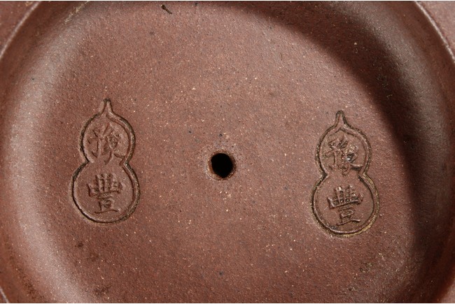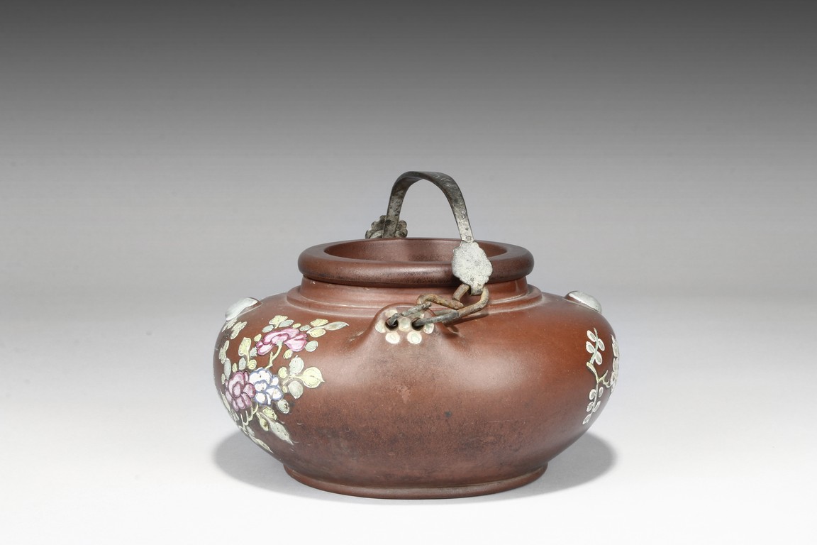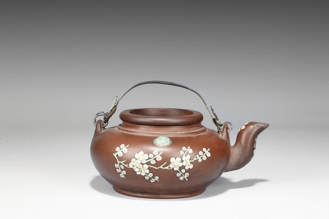 Of compressed globular form, the teapot's exterior decorated with colorful plum trees, flowers, and viewing rocks, the arched double metal handle extends over the top of teapot, the thick spout raises upwards, the lid has a bowl-like caved-in design witho