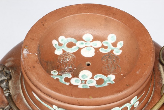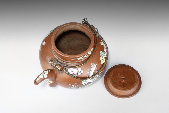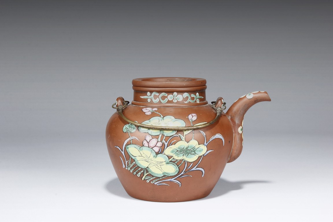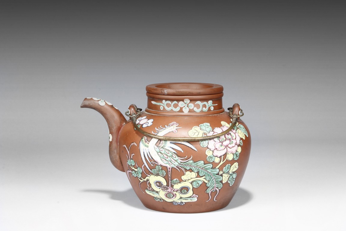 Of bulbous form, the teapot shaped similar to a jar, with arching metal handle, curved and long spout, and body decorated with phoenix, flowers, and lotus design, the lid caved in without finial. Bottom with two character “Yu Feng” mark. The teapot was made during the Republic period, when this type of teapot design was popular amongst civilians.