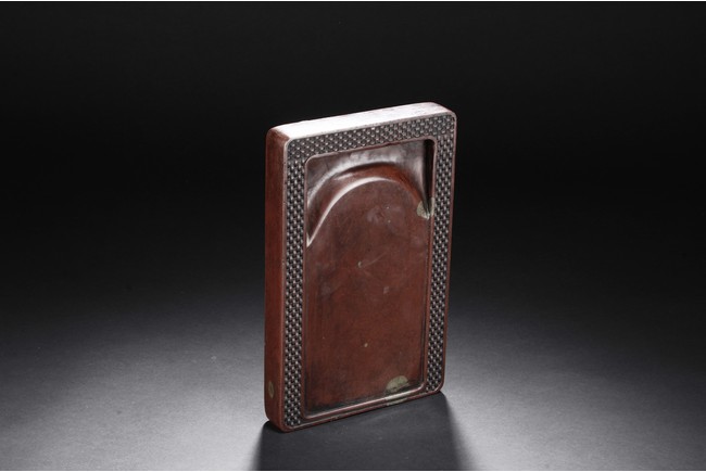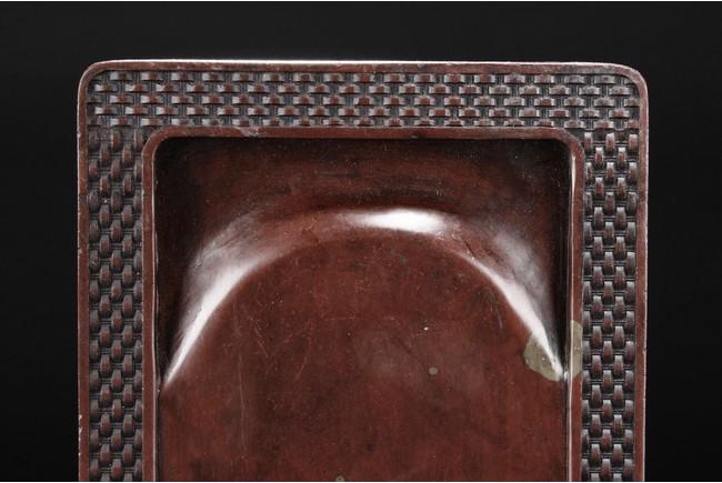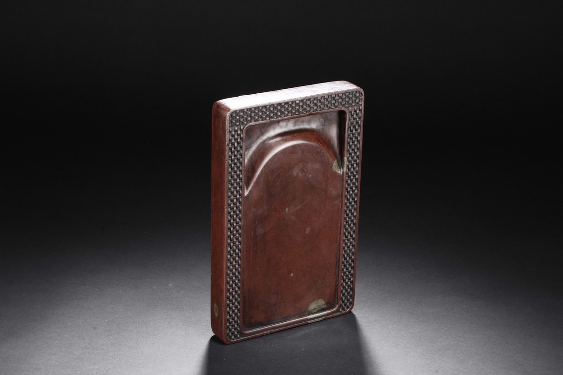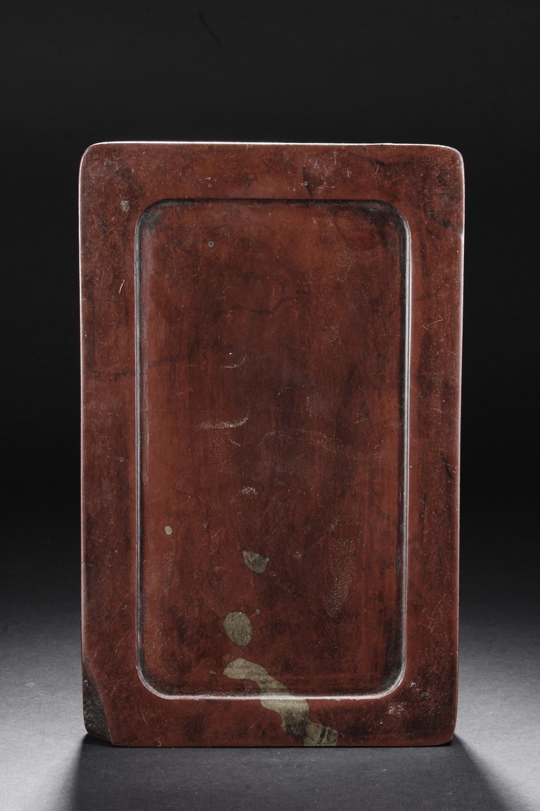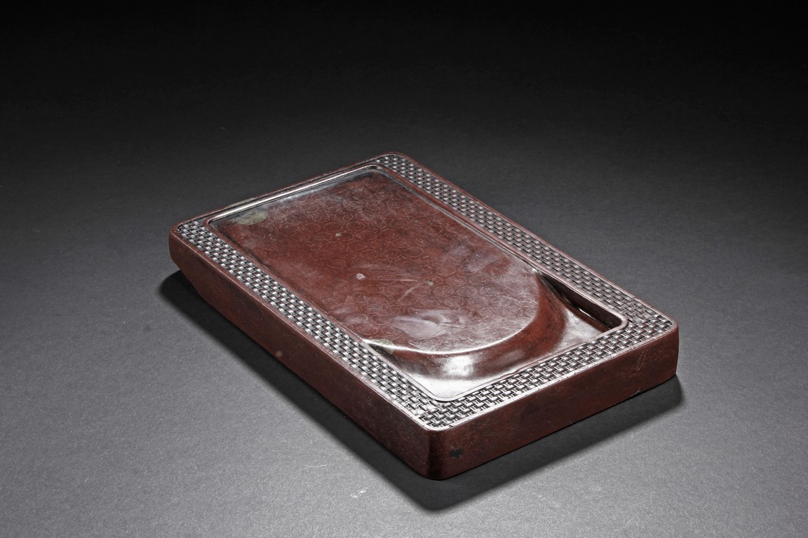 The inkstone is of deep red-orange color, the edges in chain link pattern, with inkwell on the one side, carved deeply with a curved pattern.