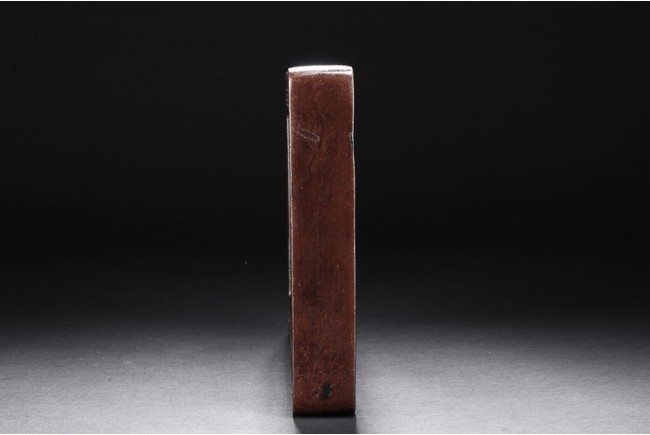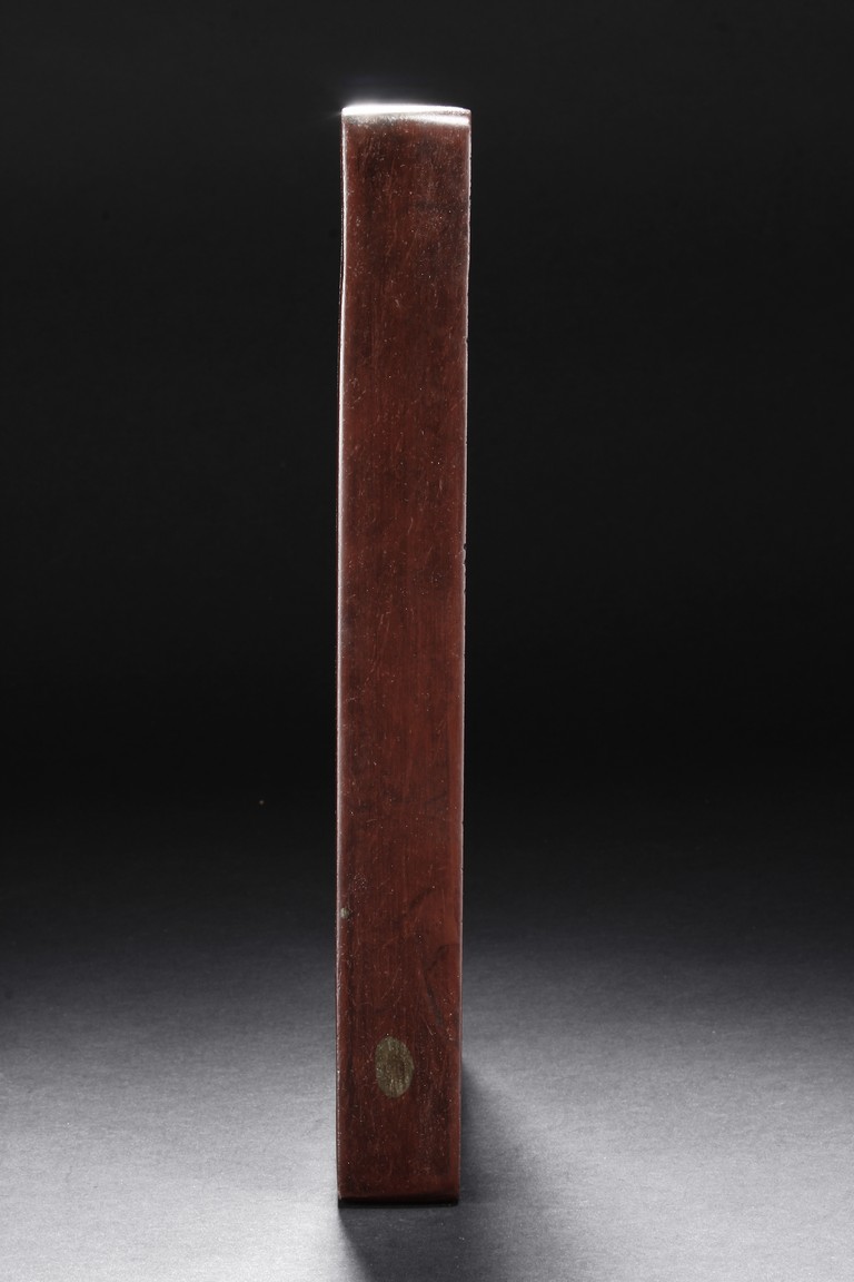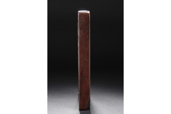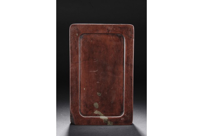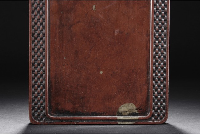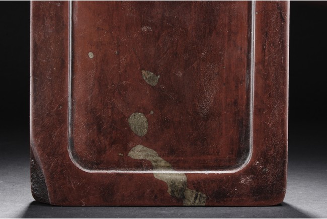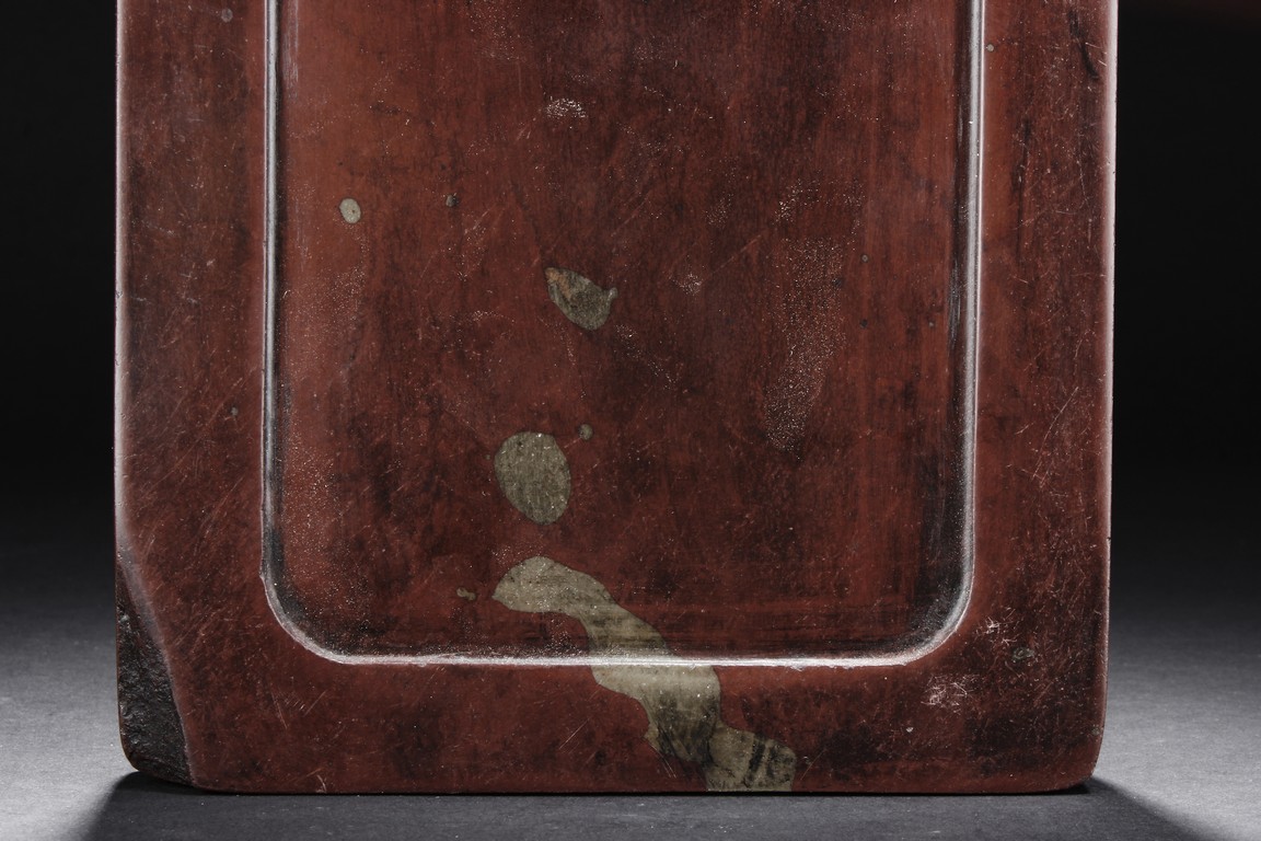 The inkstone is of deep red-orange color, the edges in chain link pattern, with inkwell on the one side, carved deeply with a curved pattern.