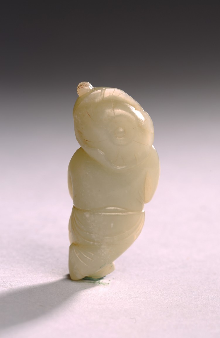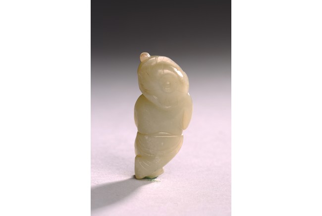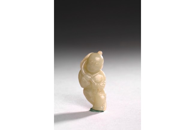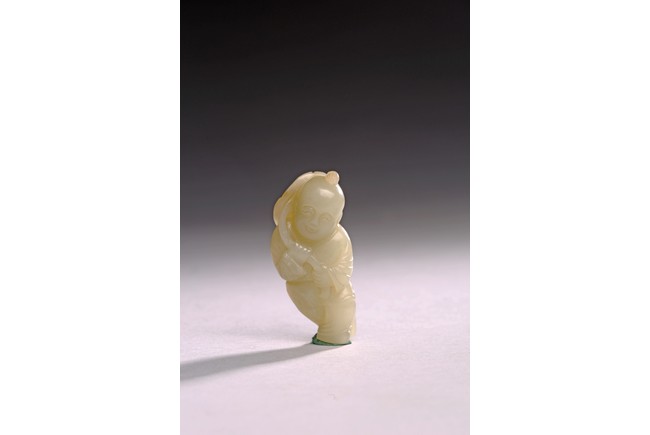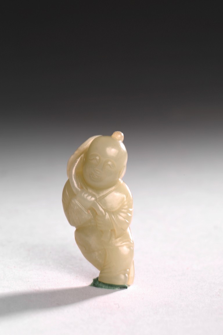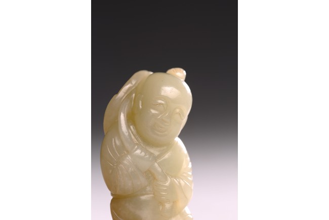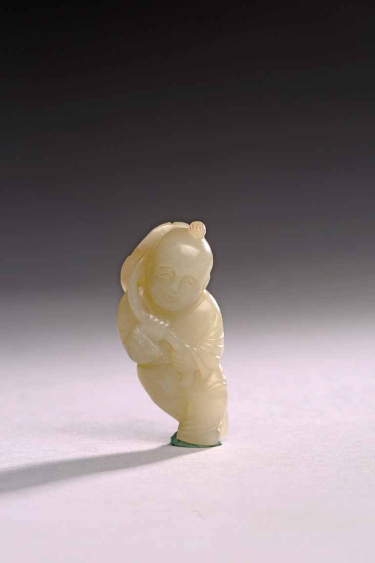 The white jade carved boy is shown holding a lotus leaf with a long branch with both hands, the face depicts a delightful expression. Qing Dynasty period.