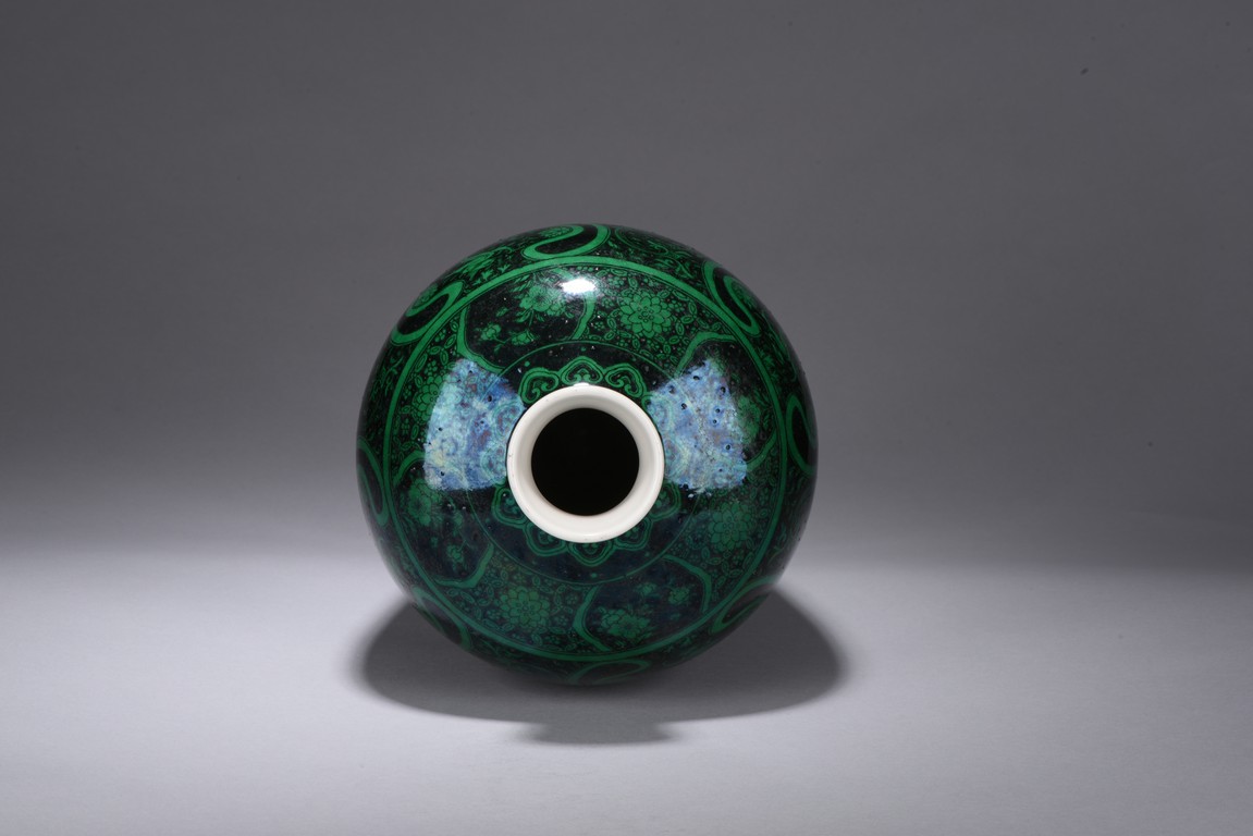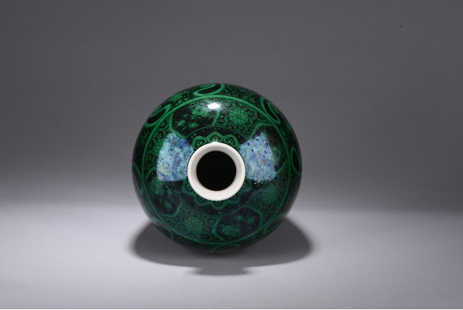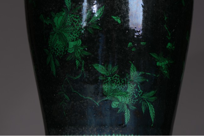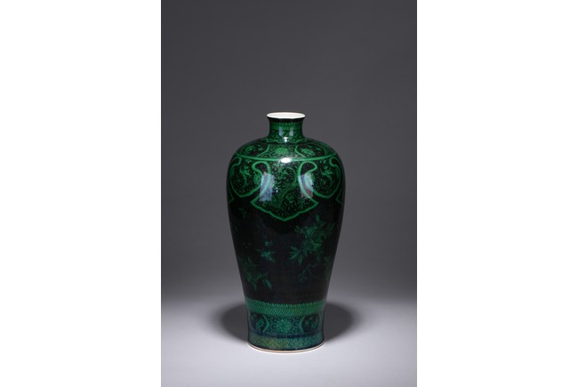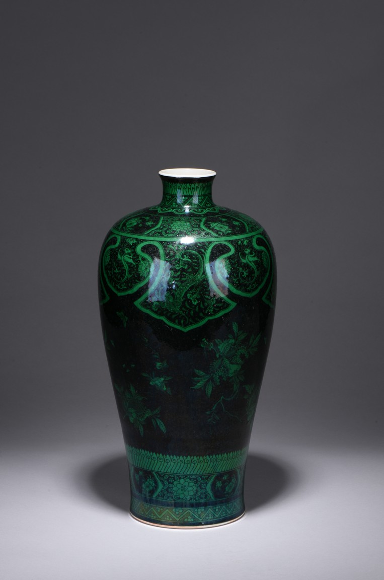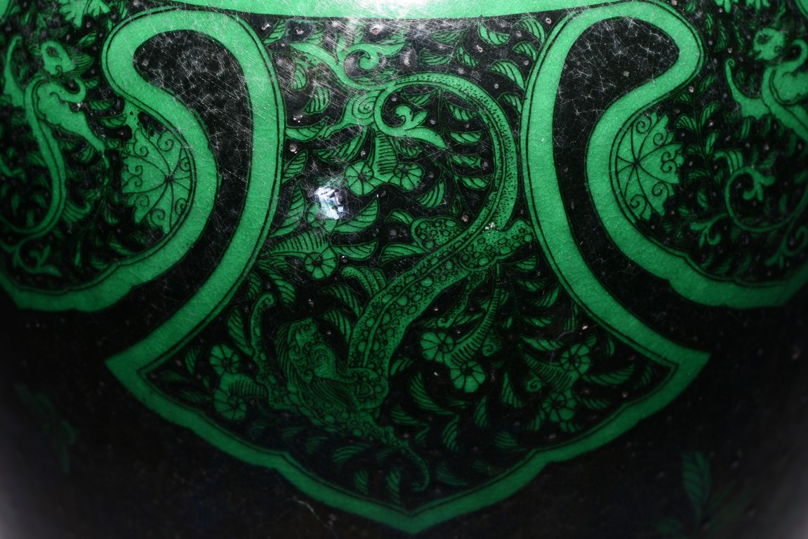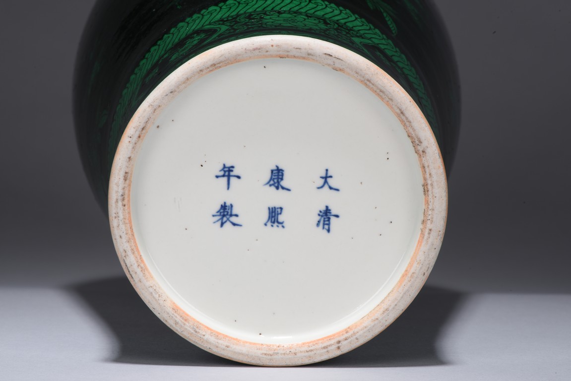 Potted with a broad shoulder and waisted neck,the vase is finely decorated in green with leafy fruit branches and sprays,flanked by alternating ruyi-shaped headband enclosing chilong and floral pattern above,and geometric bands around the base,all reserved on black ground. The bottom bears six character 'KANGXI' mark. Qing Dynasty period.