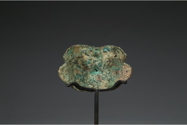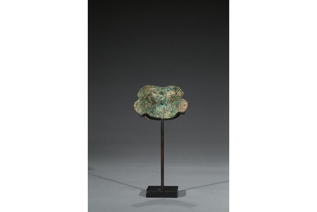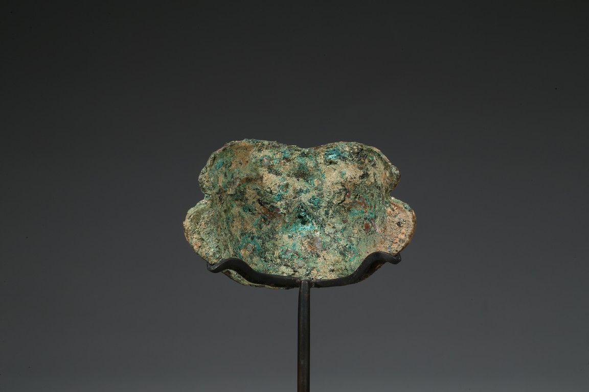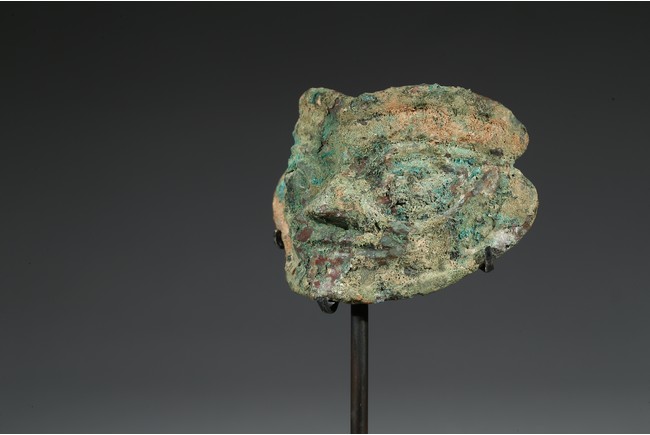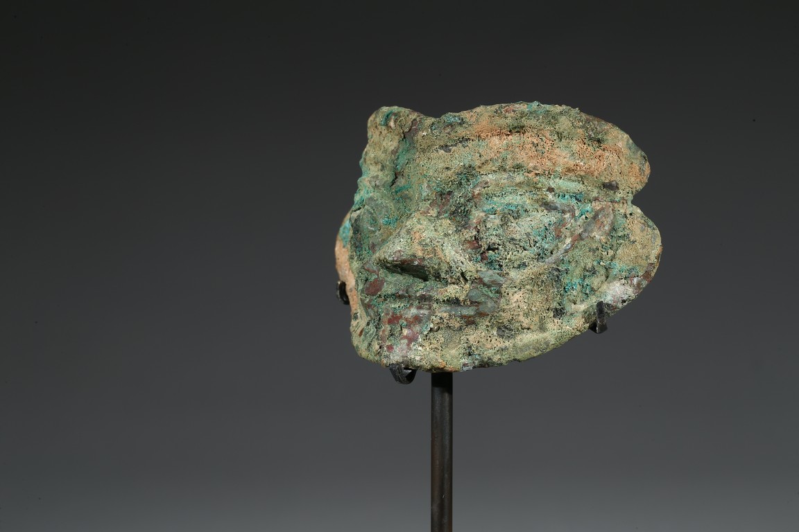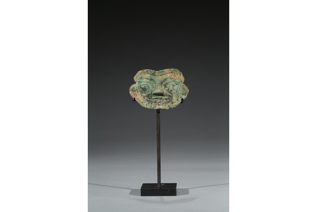 Possibly from Sanxingdui culture, the mask cast with large almond-shaped eyes, straight nose, and large ears, all supported on a display stand, the bronze with extensive encrustation and patina. Possibly Shang Dynasty Sanxingdui culture