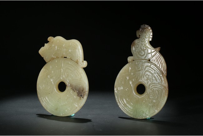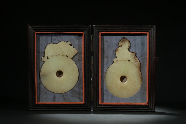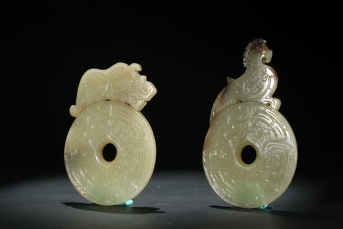 Comprising of two disc bi well incised on both sides with archaistic scroll pattern, each set to one side with a phoenix head and a mythical beast head respectively, accompanied with a fitted rosewood box. Qing Dynasty period.