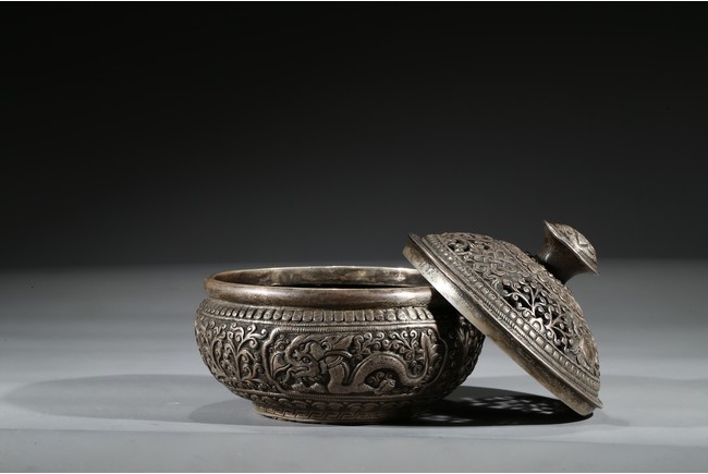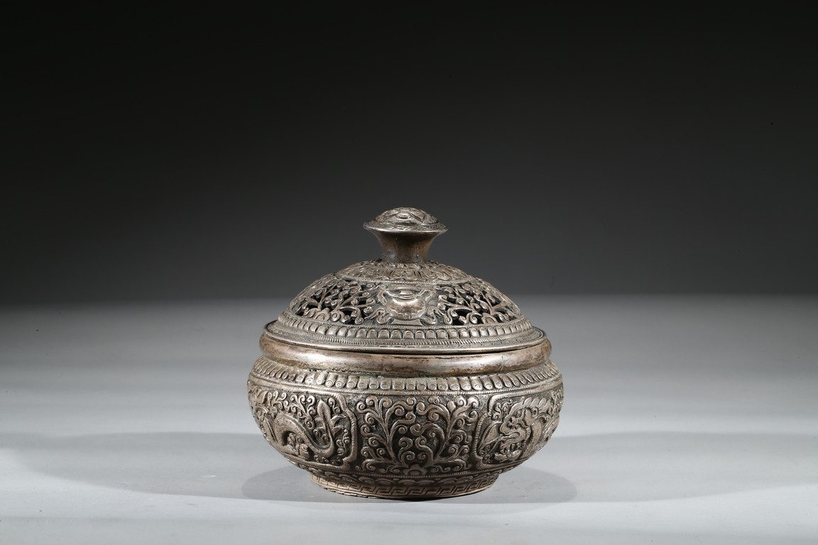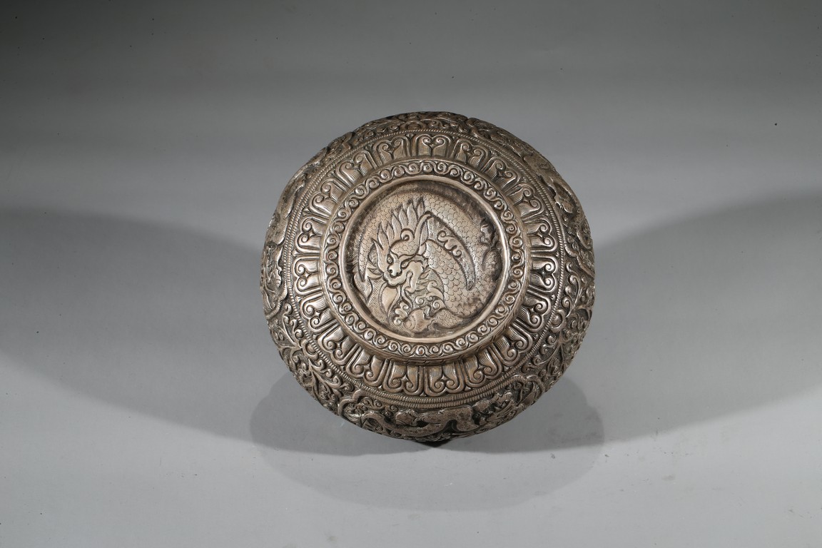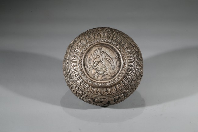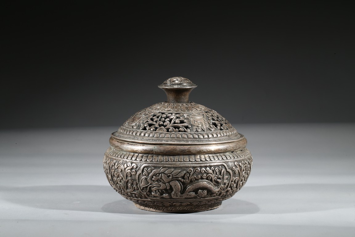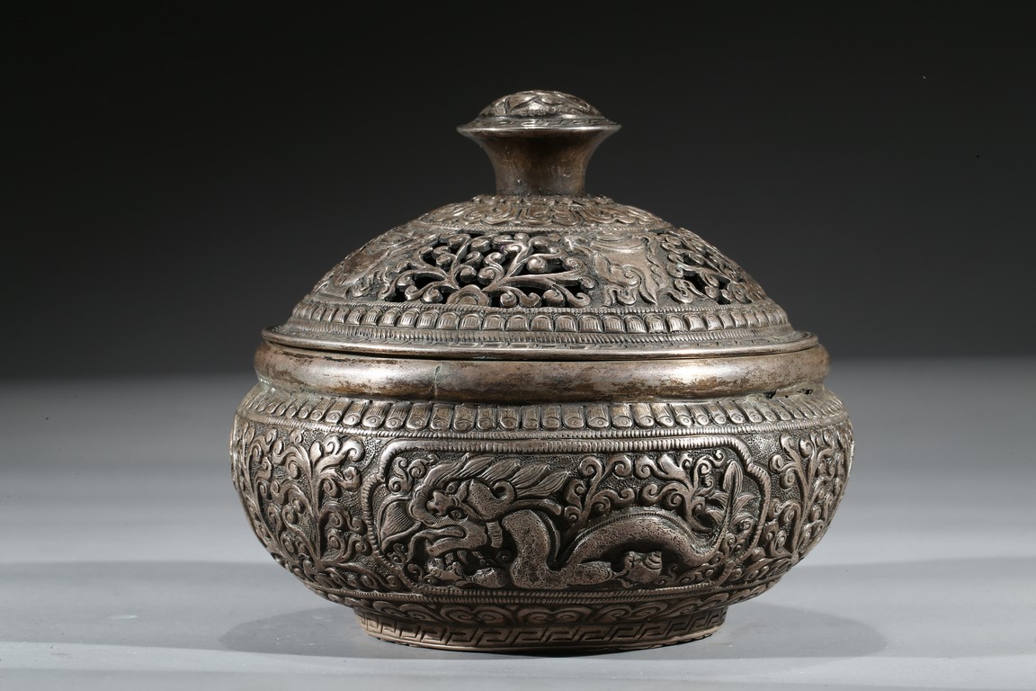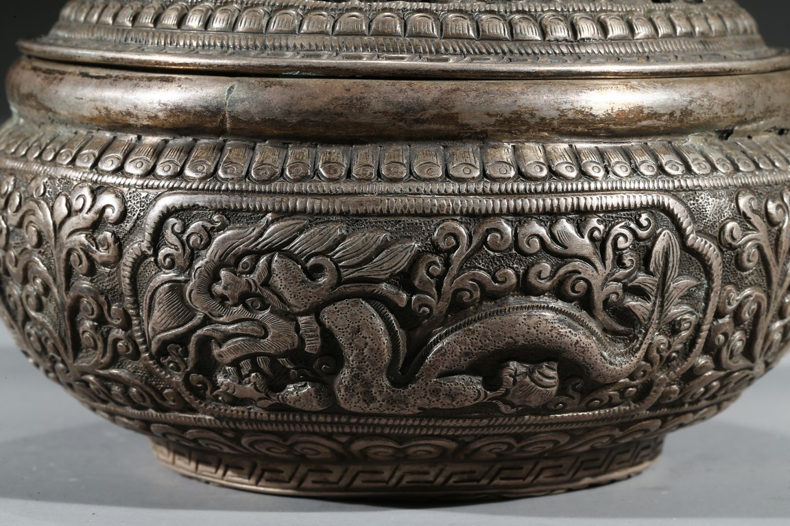 The exterior decorated in relief with dragon motif enclosed in cartouche. The cover further decorated with eight auspicious buddhist emblems. Qing Dynasty period.