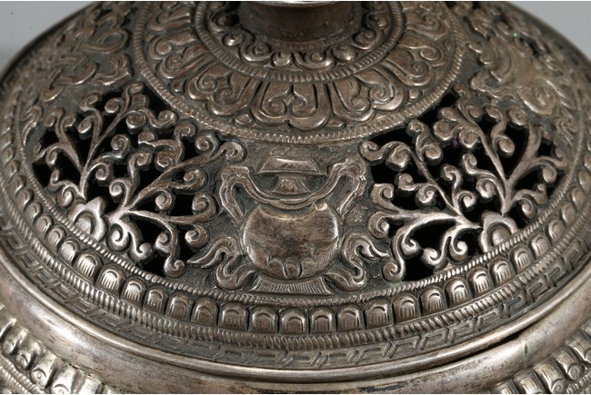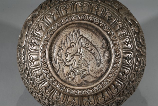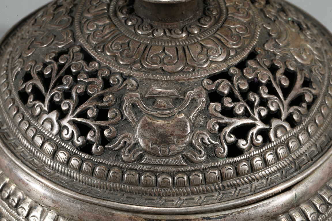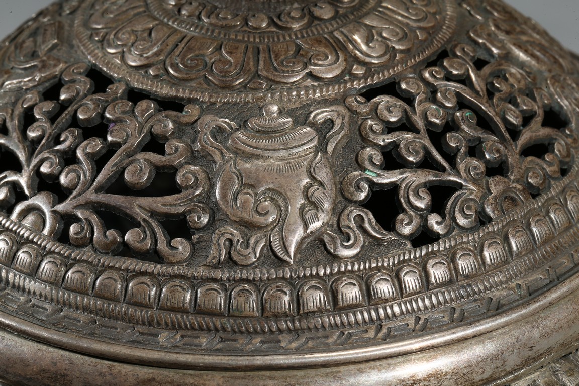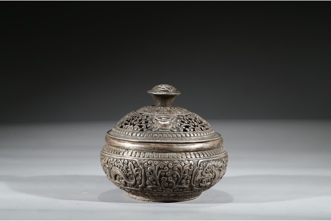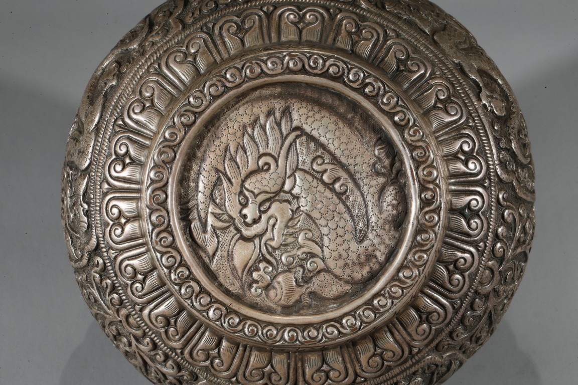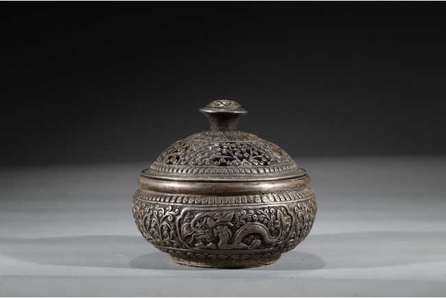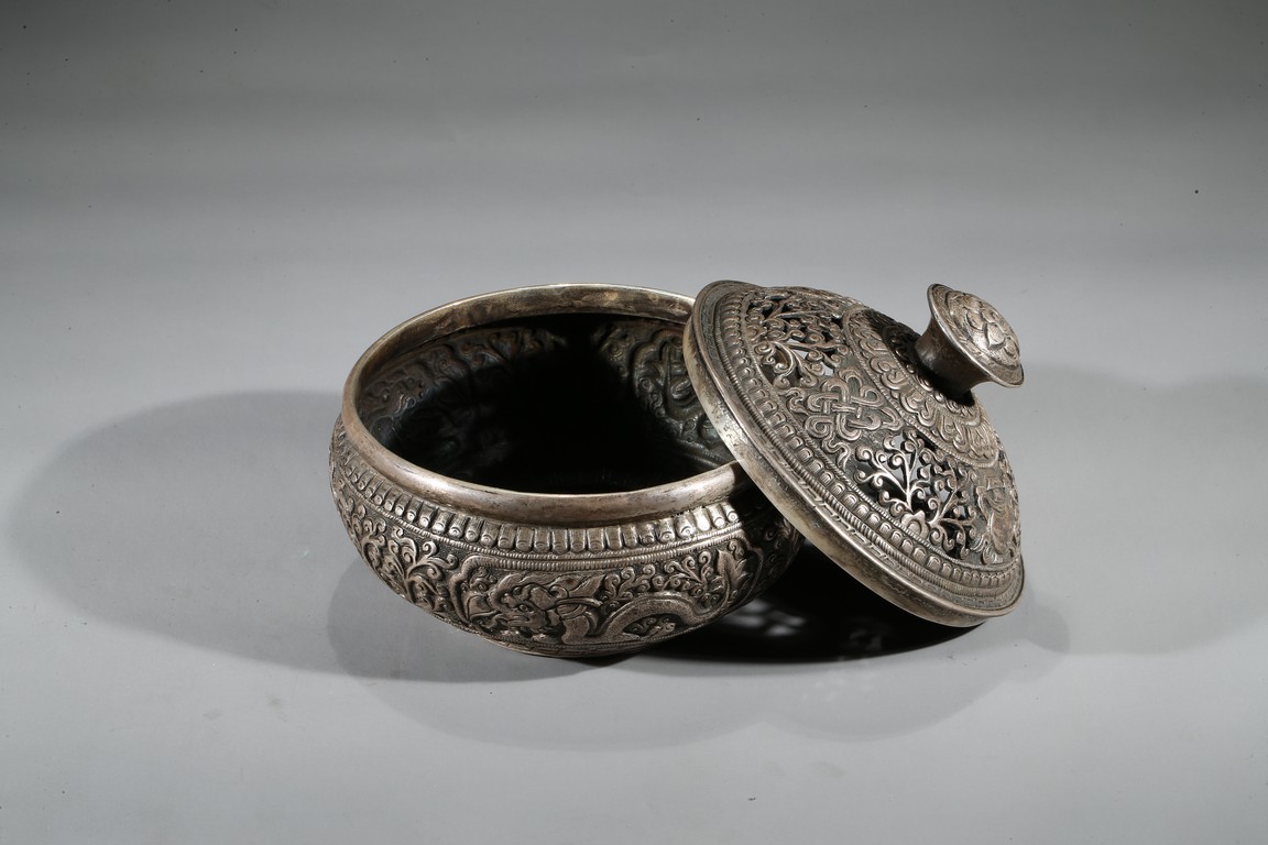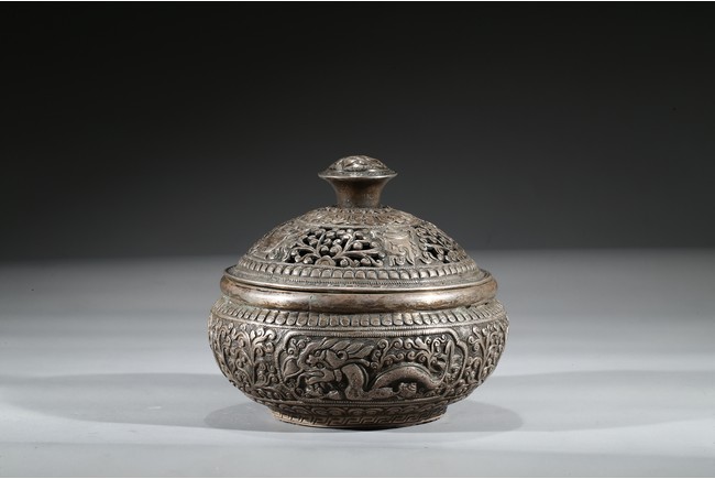 The exterior decorated in relief with dragon motif enclosed in cartouche. The cover further decorated with eight auspicious buddhist emblems. Qing Dynasty period.