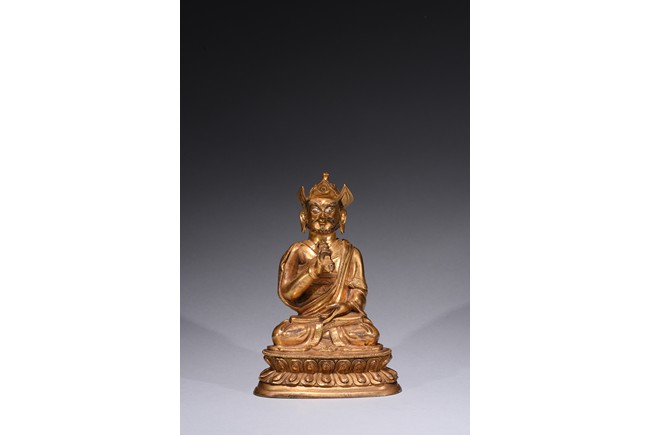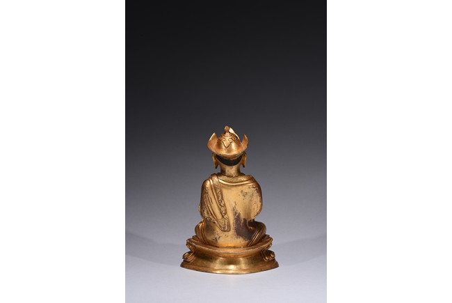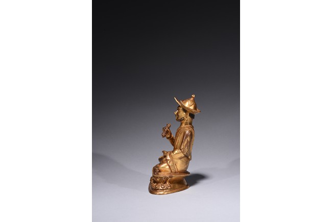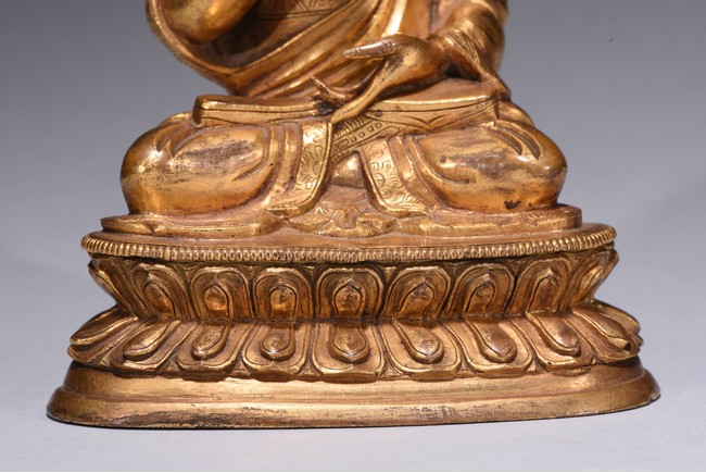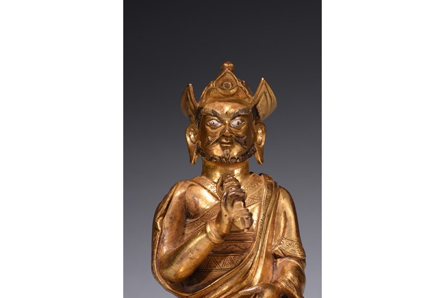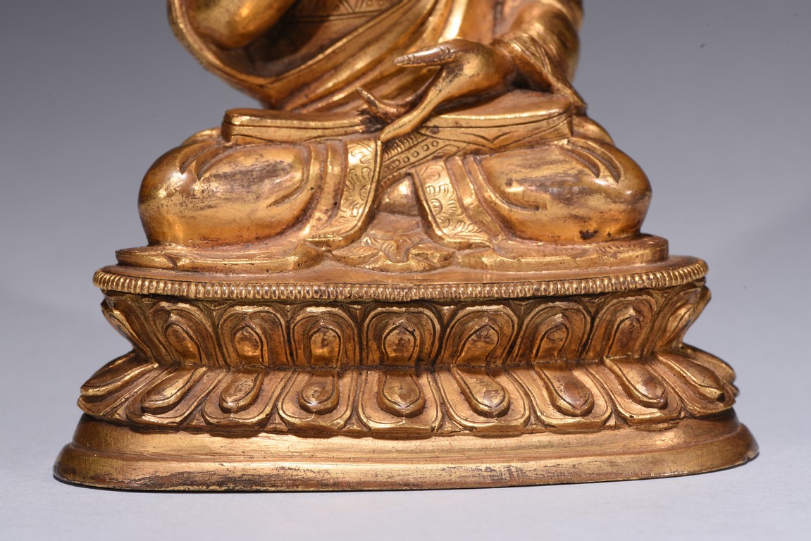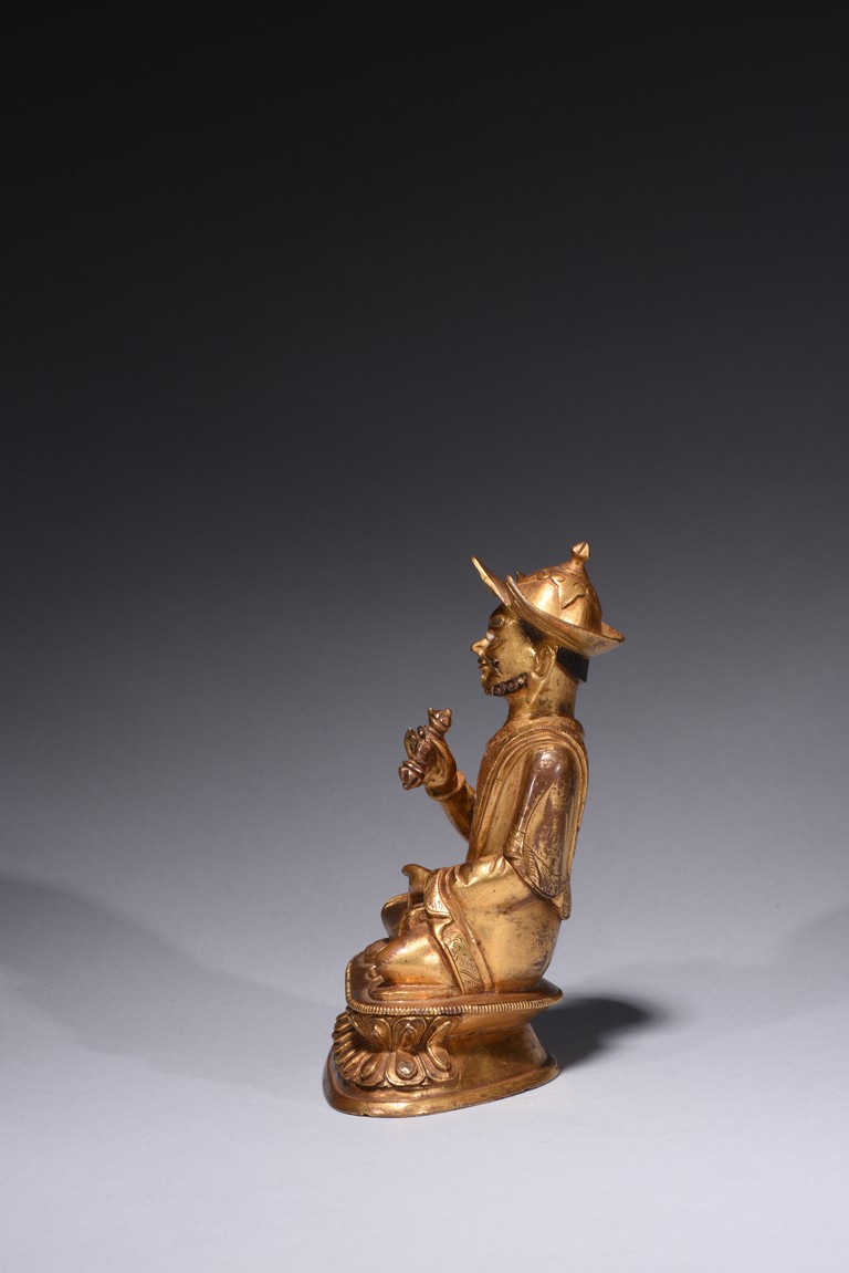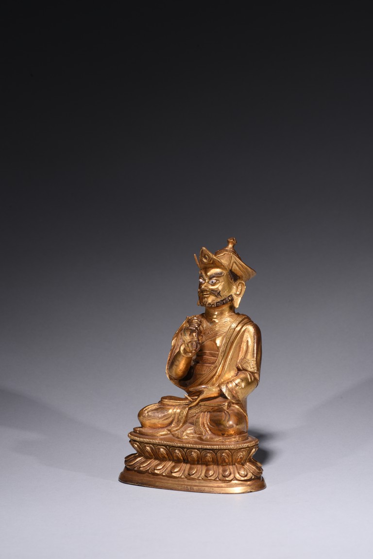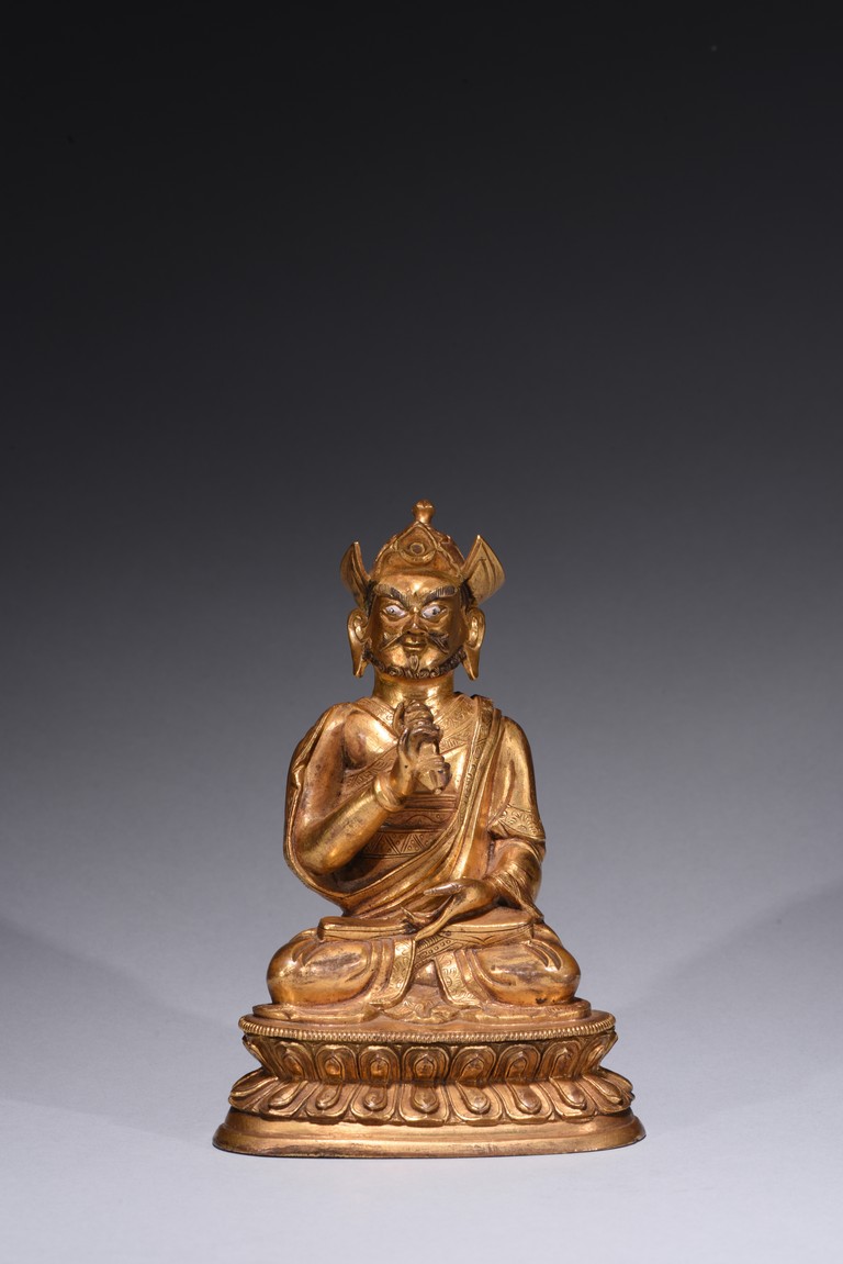 Shown seated in dhyanasana on a double lotus throne, right hand raised holding a vajra, wearing dhoti with incised hems, face with intense expression, wearing pointed hat, overall richly gilt. Qing Dynasty period.