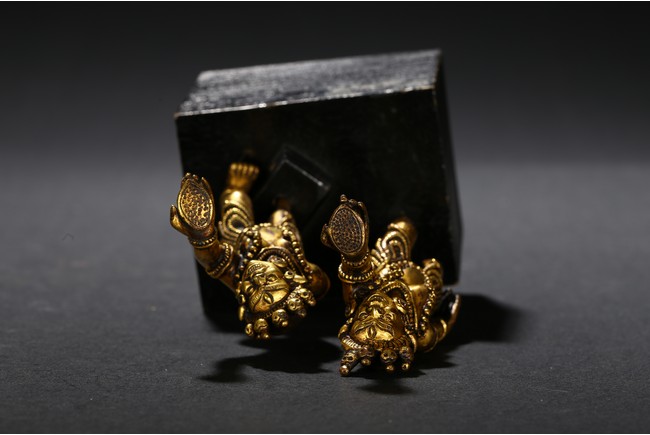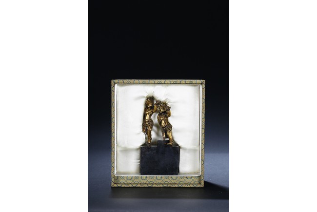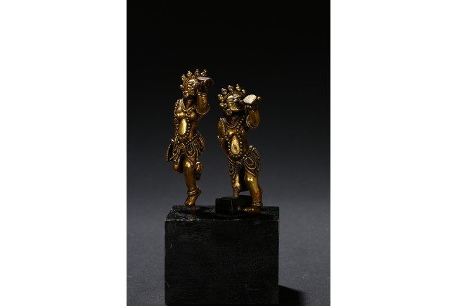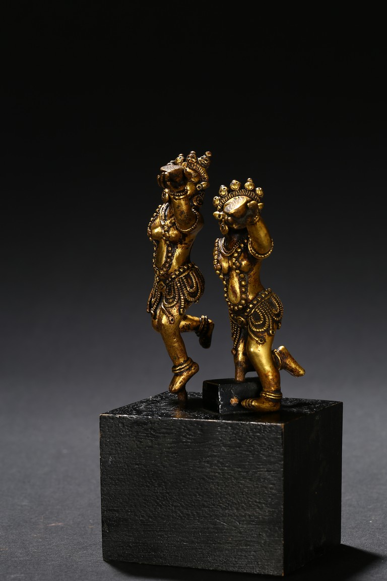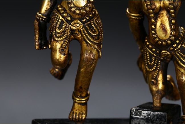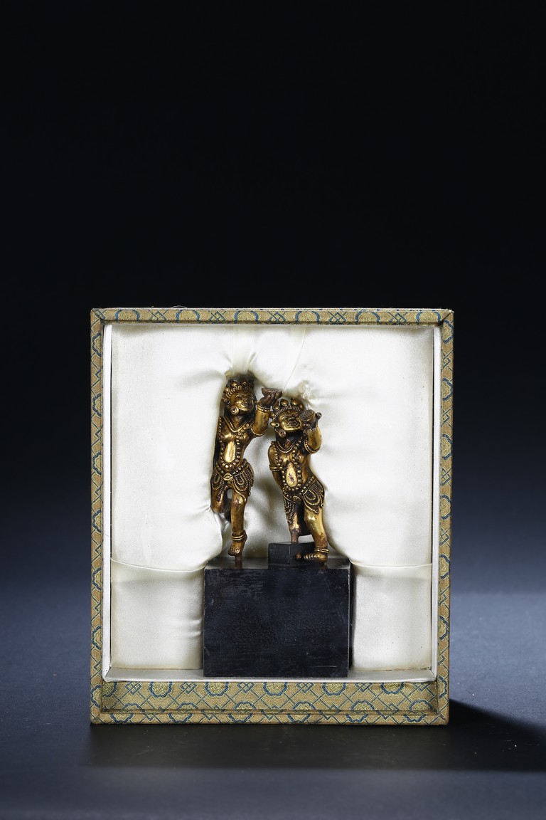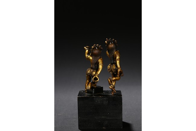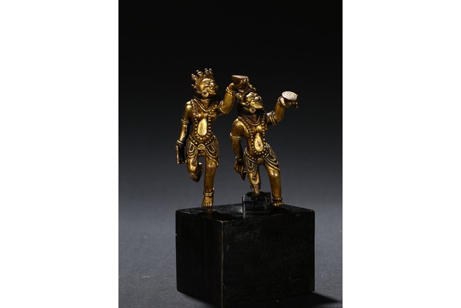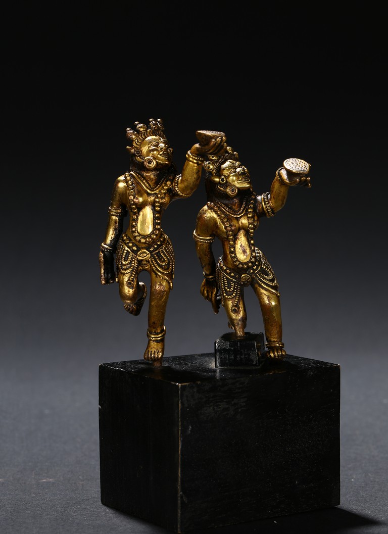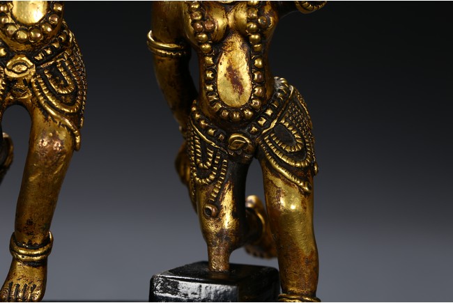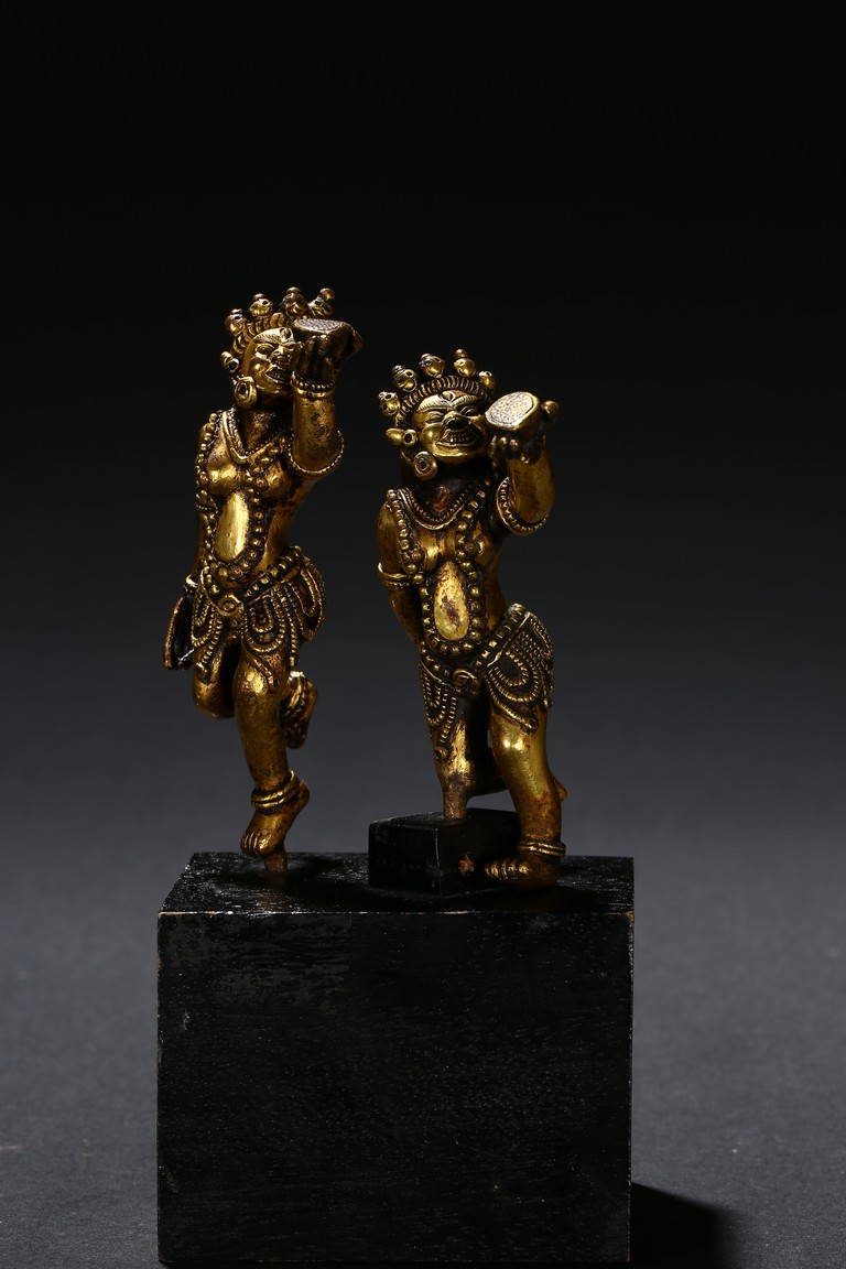 Each deity shown standing upon one foot, holding a tribute on one hand on left hand, body decorated with beaded jewellry, face with ferocious expression. Qing Dynasty period.