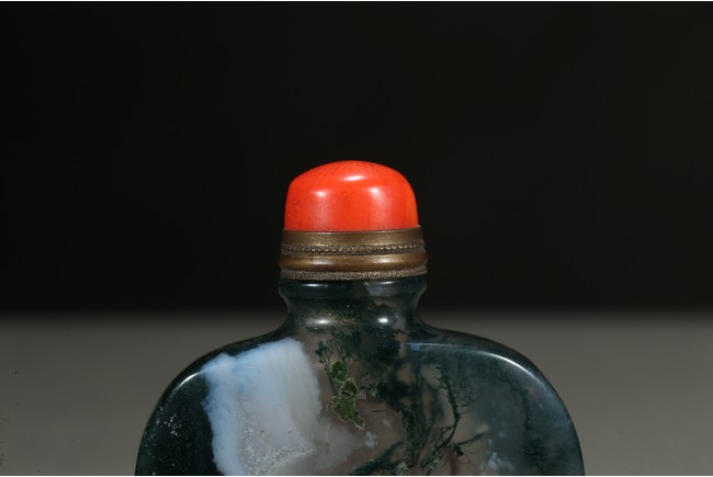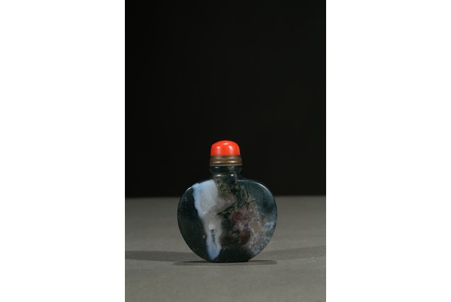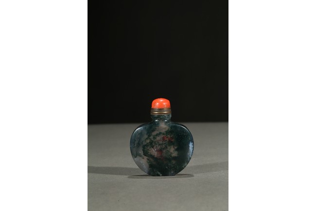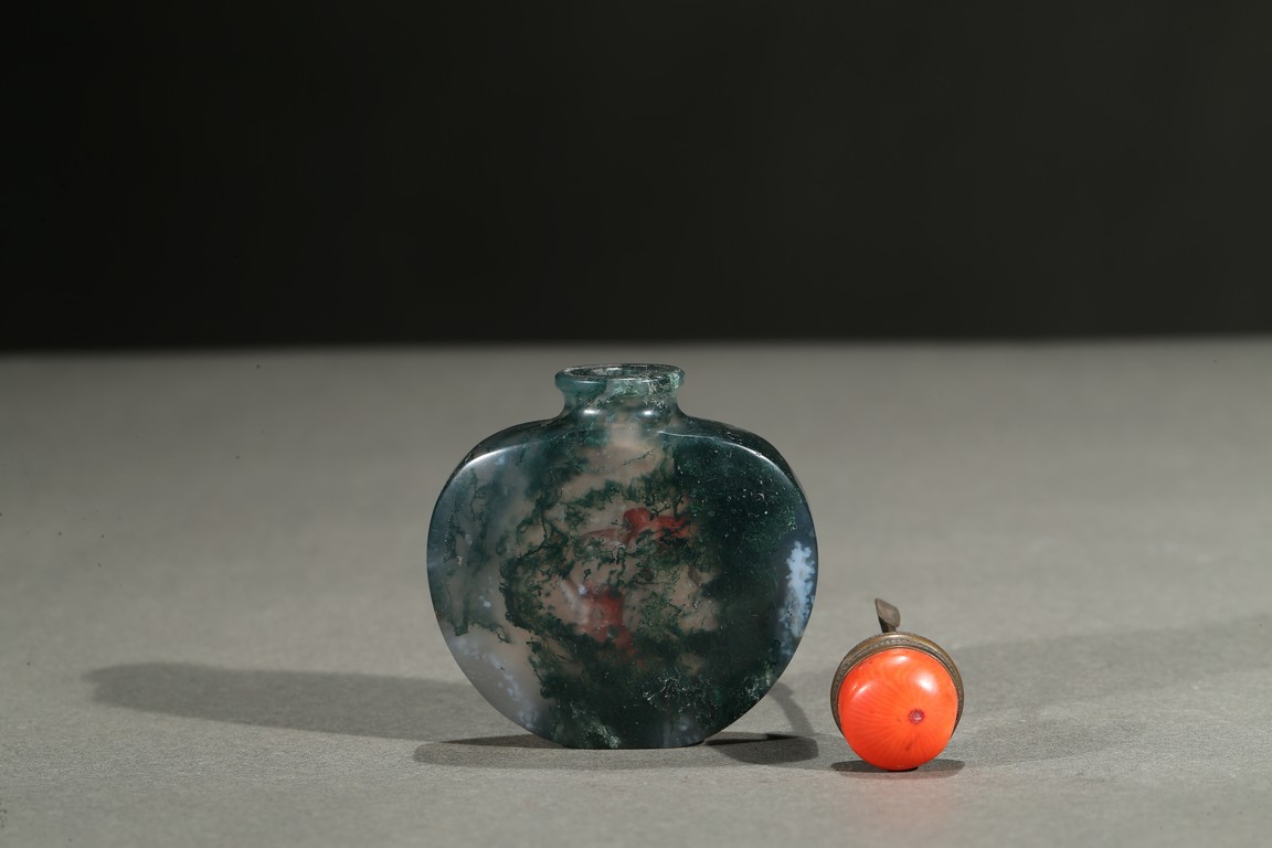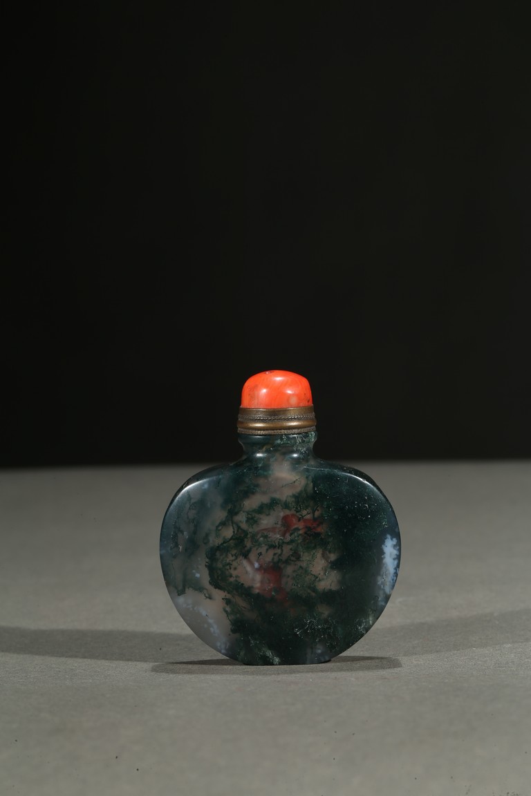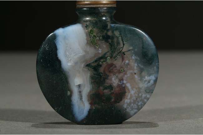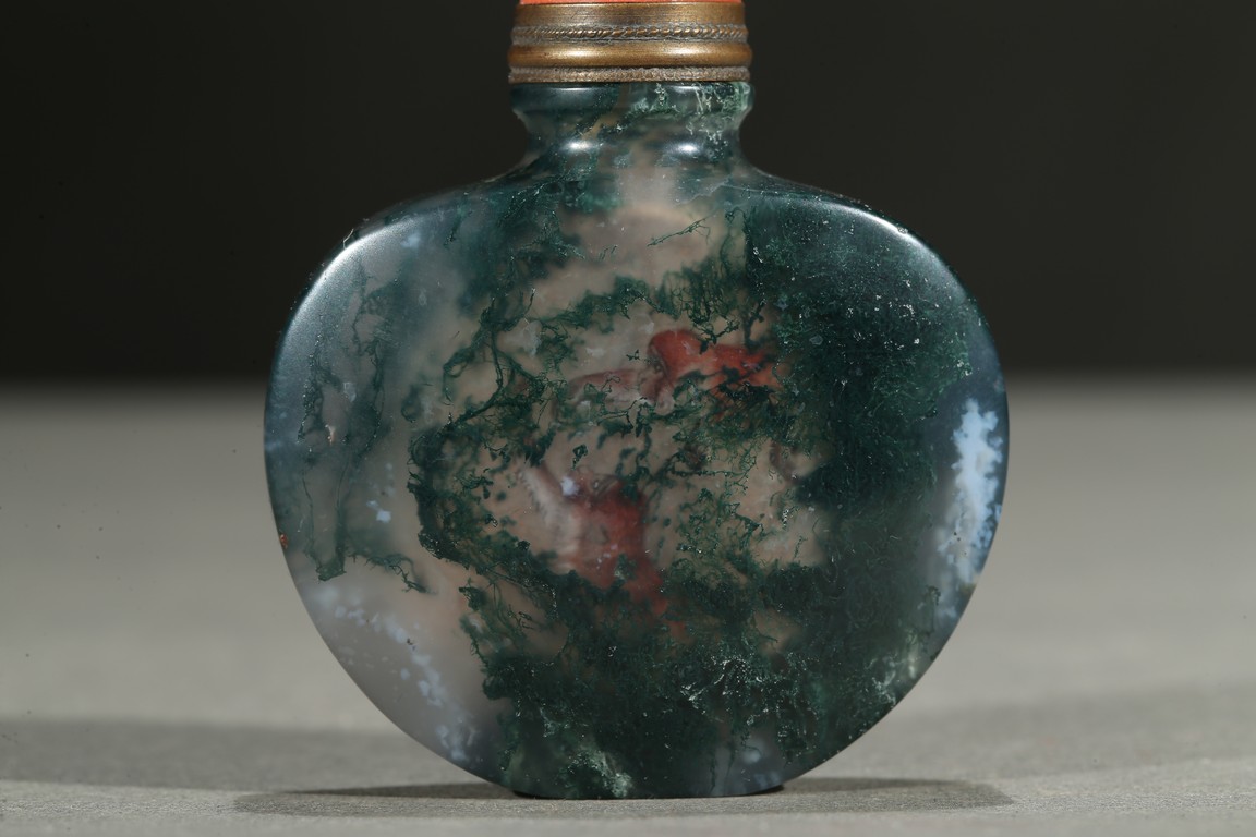Of flattened and rounded form and well-hollowed, the stone is suffused with dense deep green moss-like and white inclusions. Qing Dynasty period.