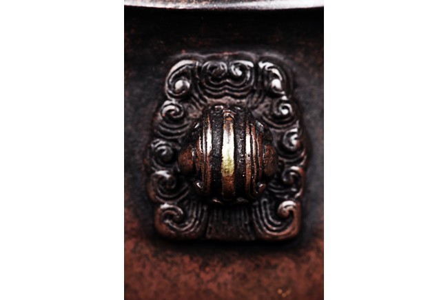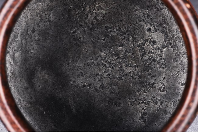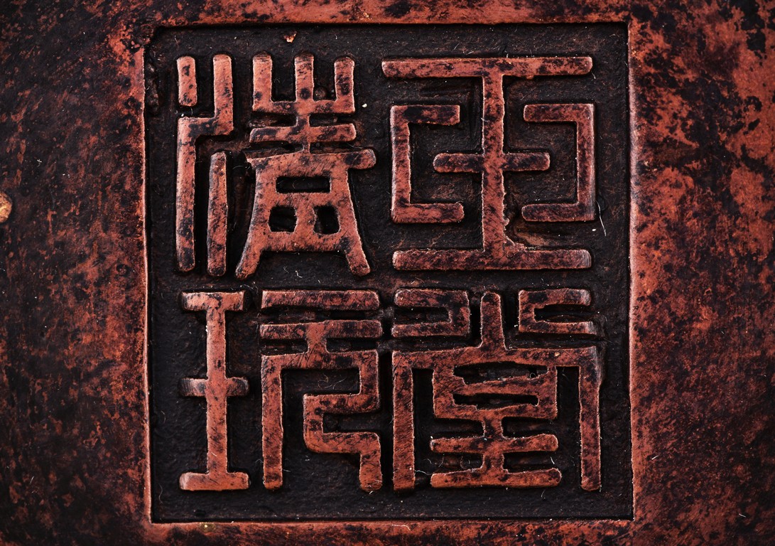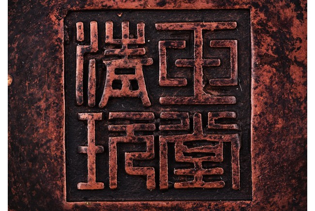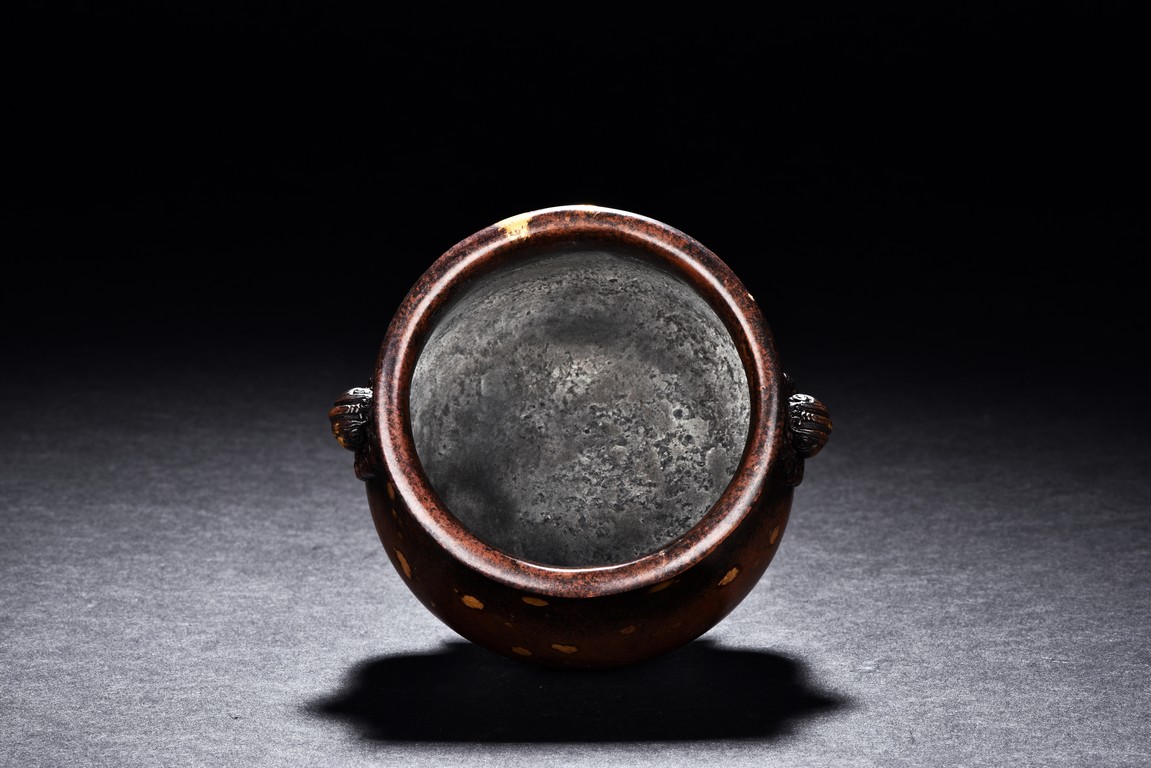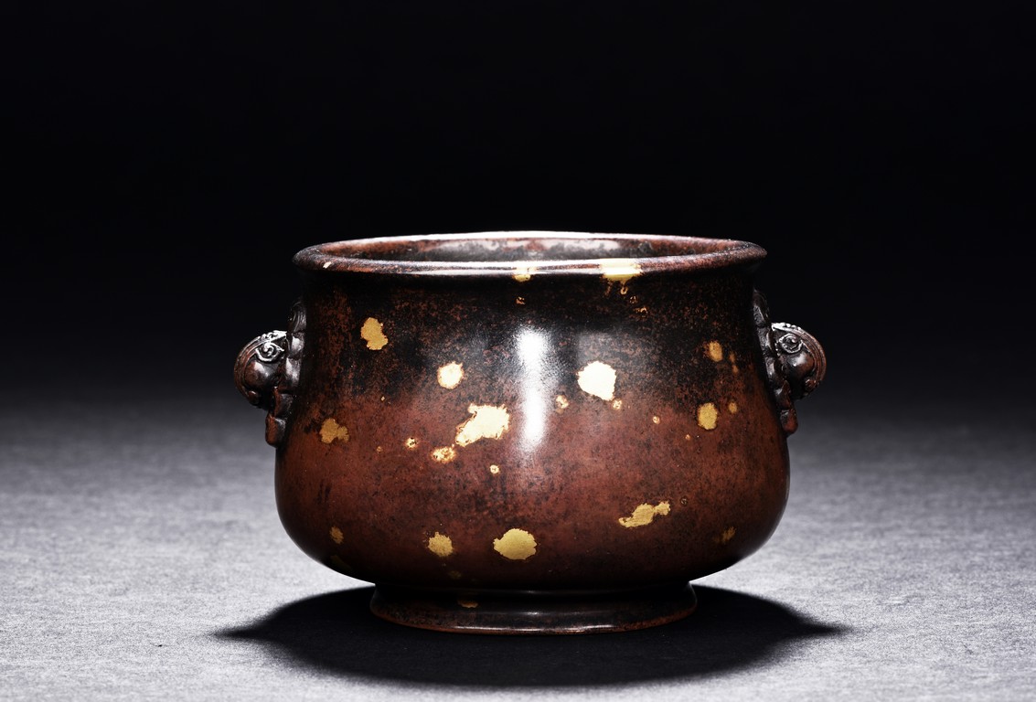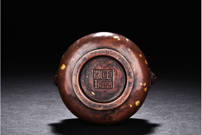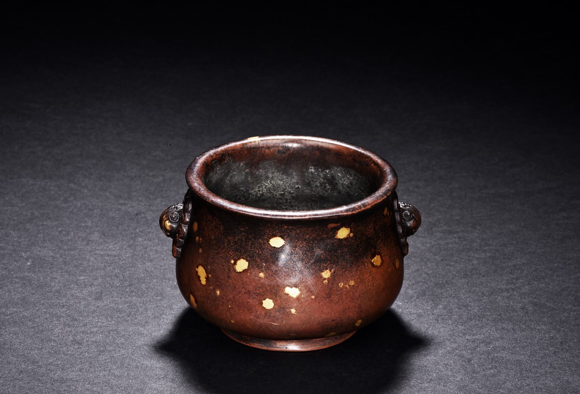 Supported on a short circular foot ring, the exterior is decorated with splashed gilt, with two finely cast ears and slightly flared rim. The bottom bears four character 'Yu Tang Qing Wan' (For pure pleasure of the Jade Hall). Qing Dynasty period.