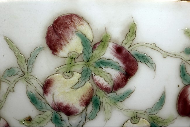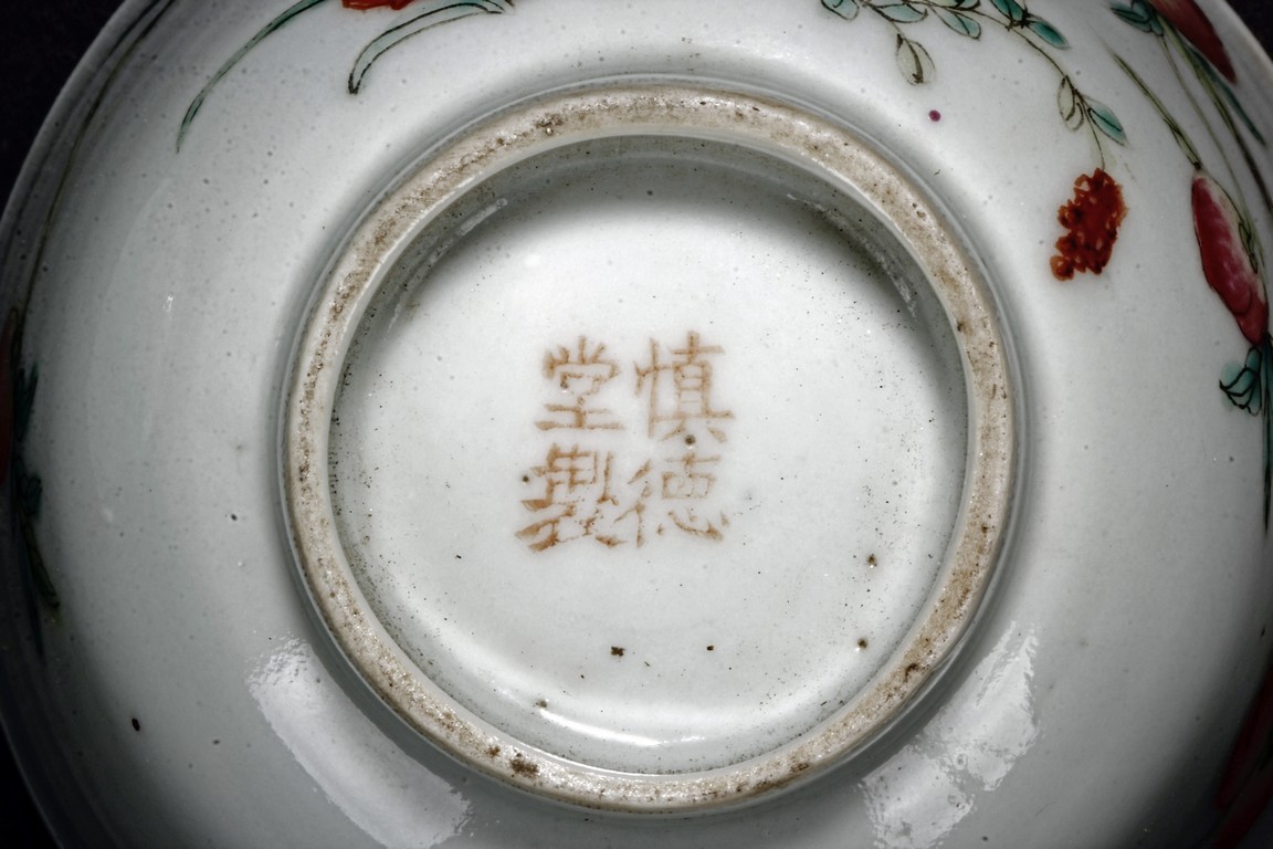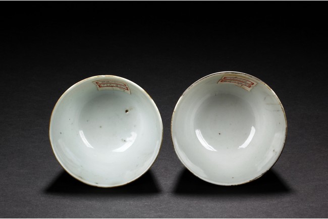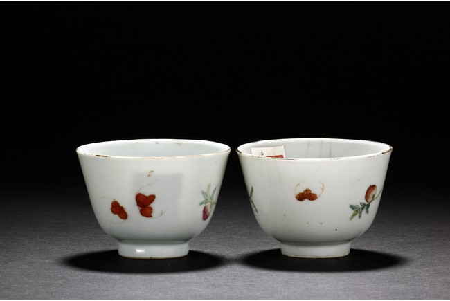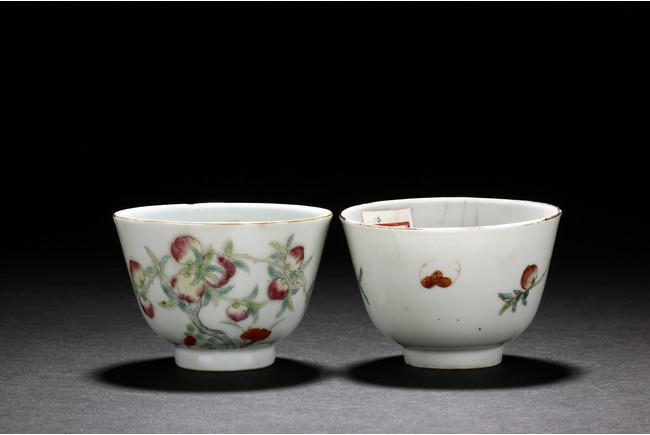 Each cup is thinly potted with steep sides rising to a flared rim, and is decorated with nine peaches growing on branches, with two flying bats on opposite side. One bears a four character 'Shen De Tang Zhi' mark, the other bears a four character 'Hui Tong Zhen Pin' mark. Republic period.