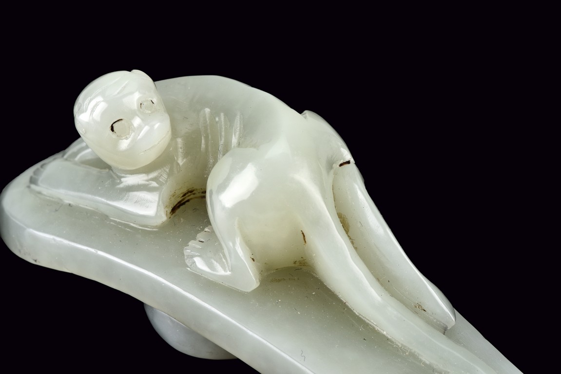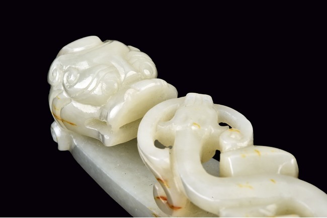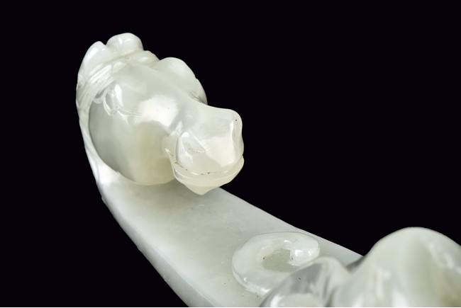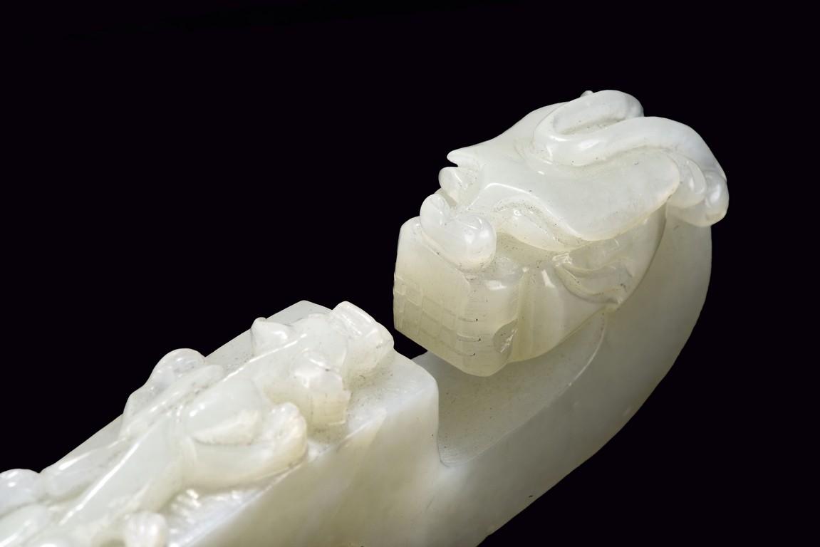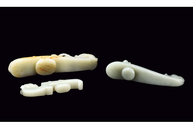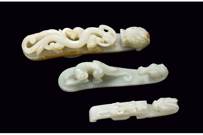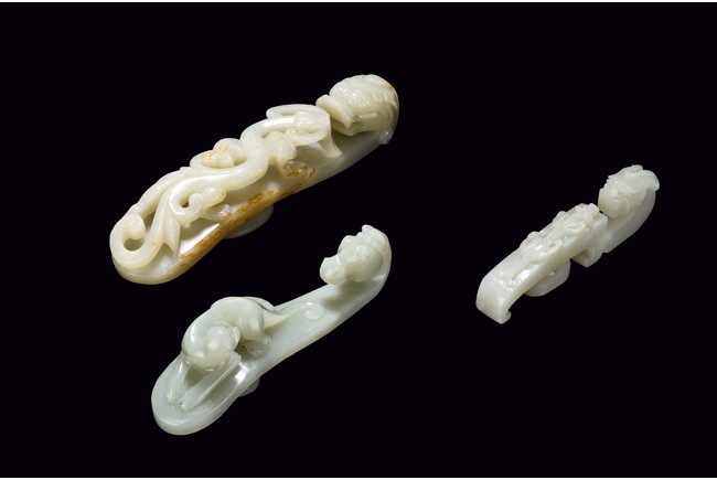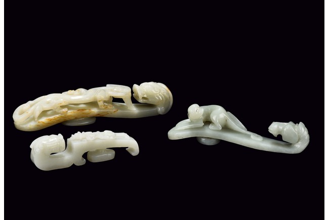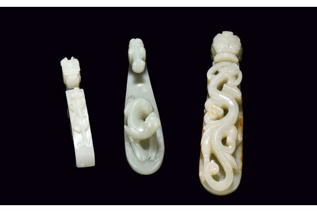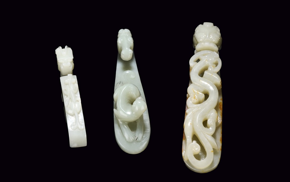 Comprising three white jade belt hook of various design, including one terminating with an upturned dragon head, shaft carved with chilong; one with upturned horse head, the shaft with a recumbent dog with head turning back; and one with upturned dragon head, the shaft with a crouching chilong carving
