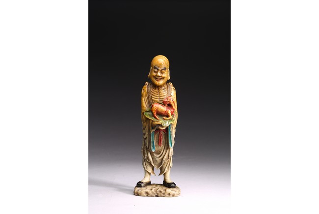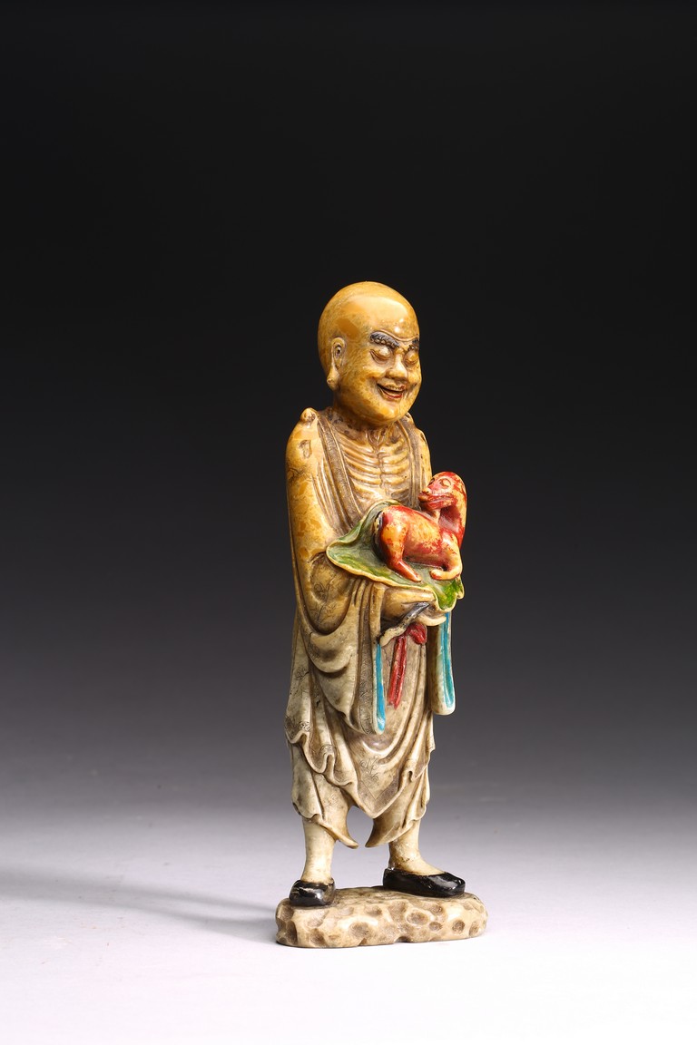 This arhat is standing on a rock grain platform, holding a mythical beast cub on two hands, with smiling face. Republic period.