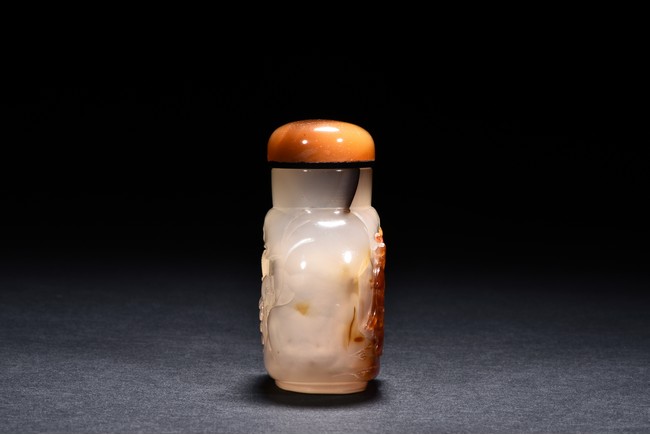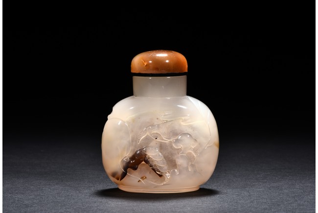 Of compressed globular body,supported on recessed foot with oval foot rim,the well-hollowed stone is carved with an elderly scholar in a conversation with a seated young attendant under pine,reverse carved with a crane in flight,the details cleverly expressed utilizing the brown inclusions and markings in the stone. Qing Dynasty period.
