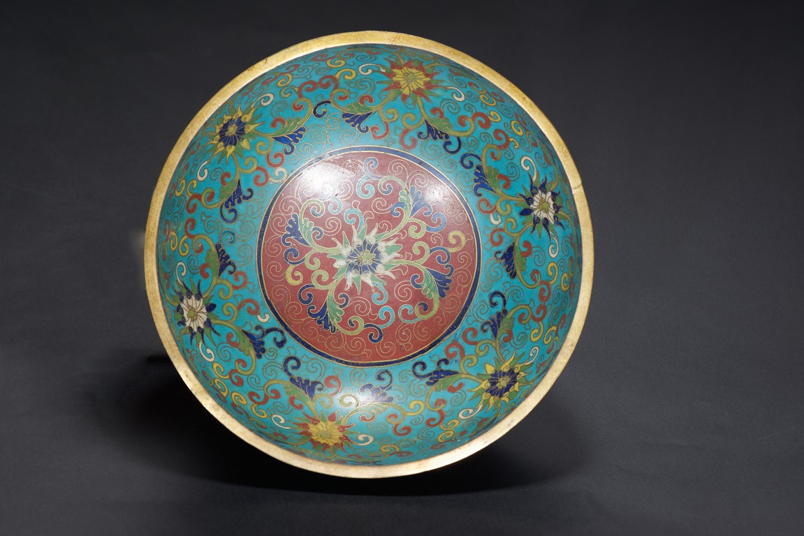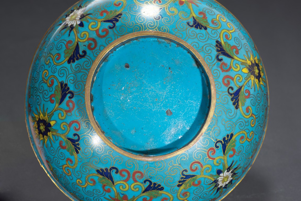 Of rounded sides, the interior and exterior overall enamelled with lotus scrolls, all reserved on turquoise colored ground. Qing Dynasty period.
